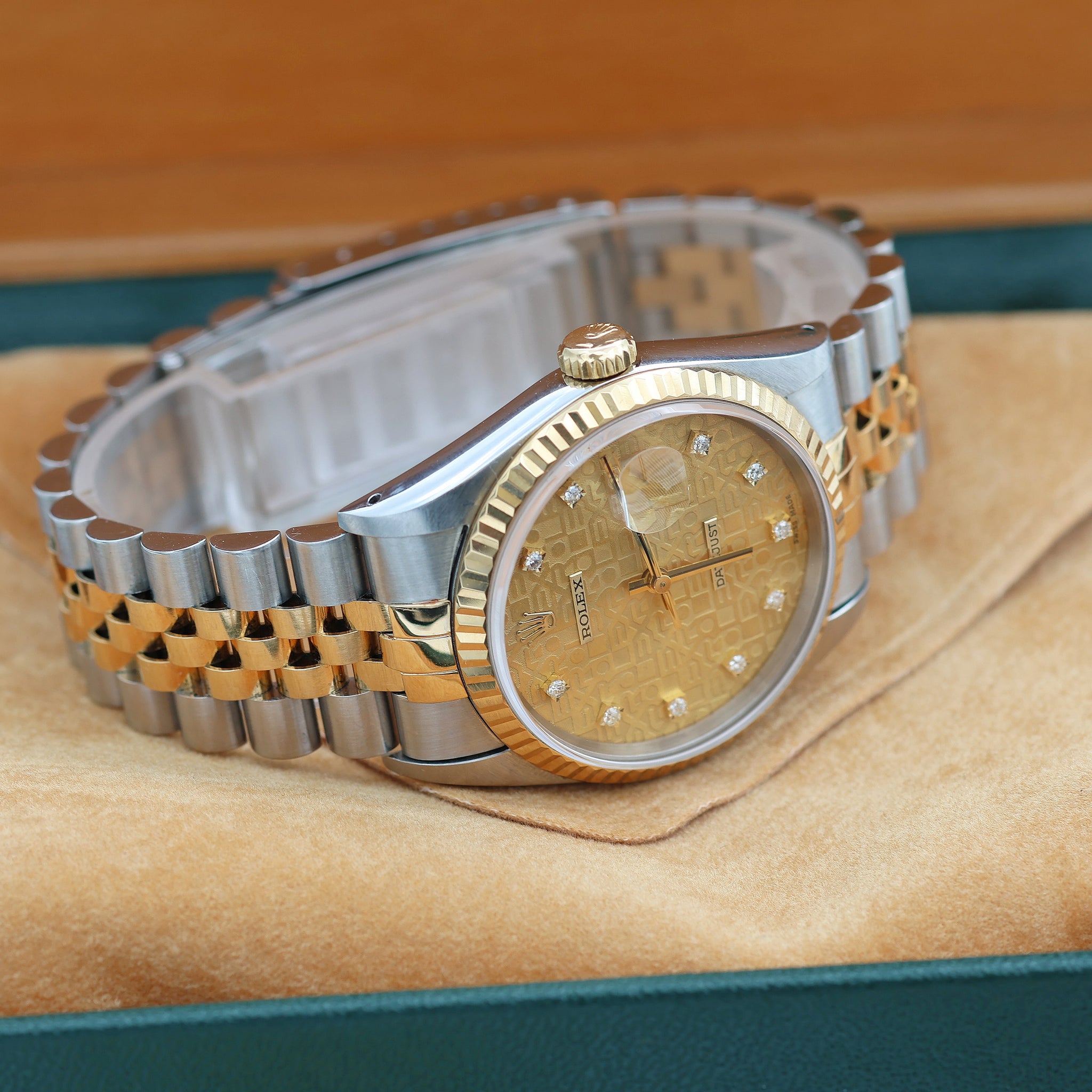 Fluted yellow gold bezel on a Jubilee bracelet, with an elegant champagne dial with millennary pattern (often called "jubilee") and diamonds.