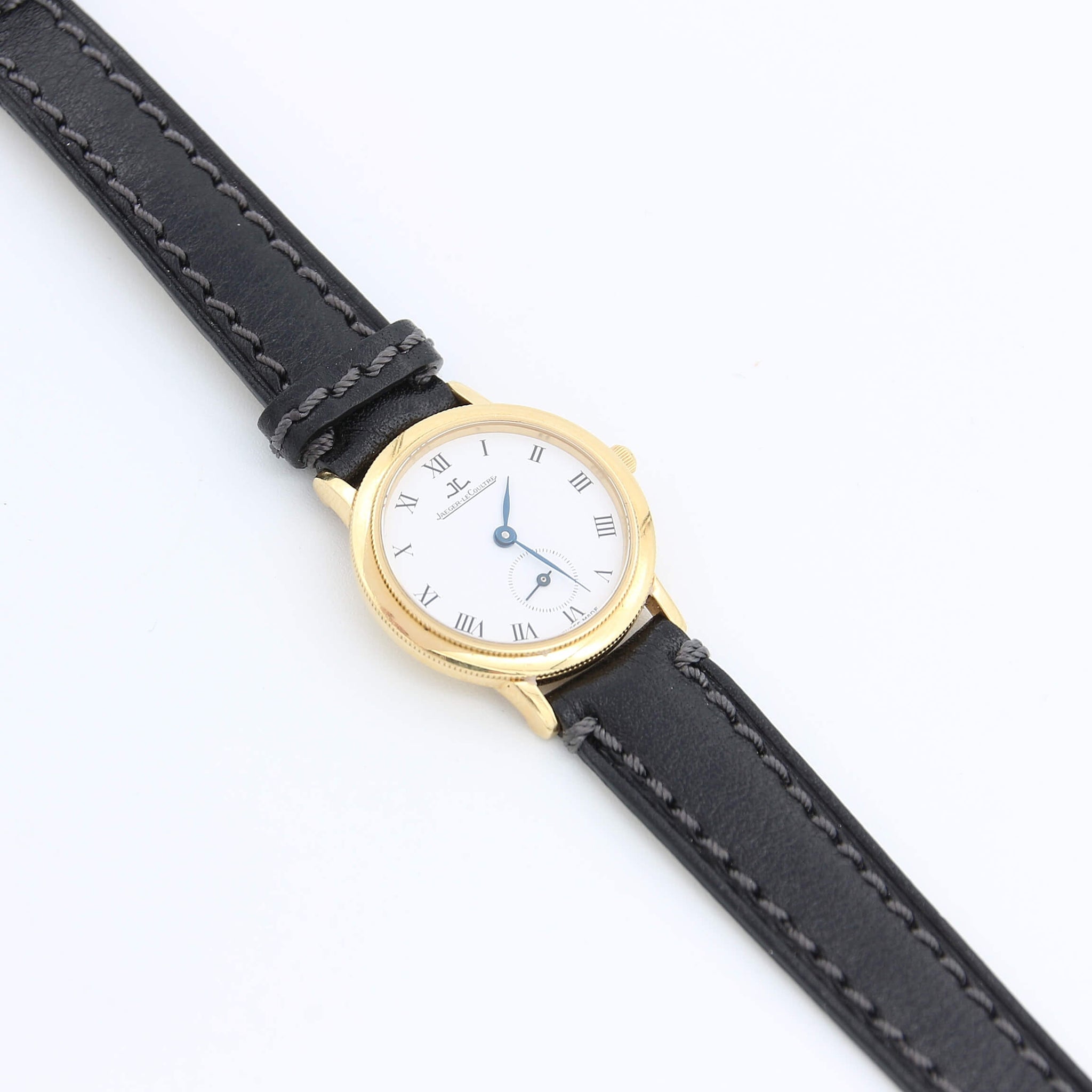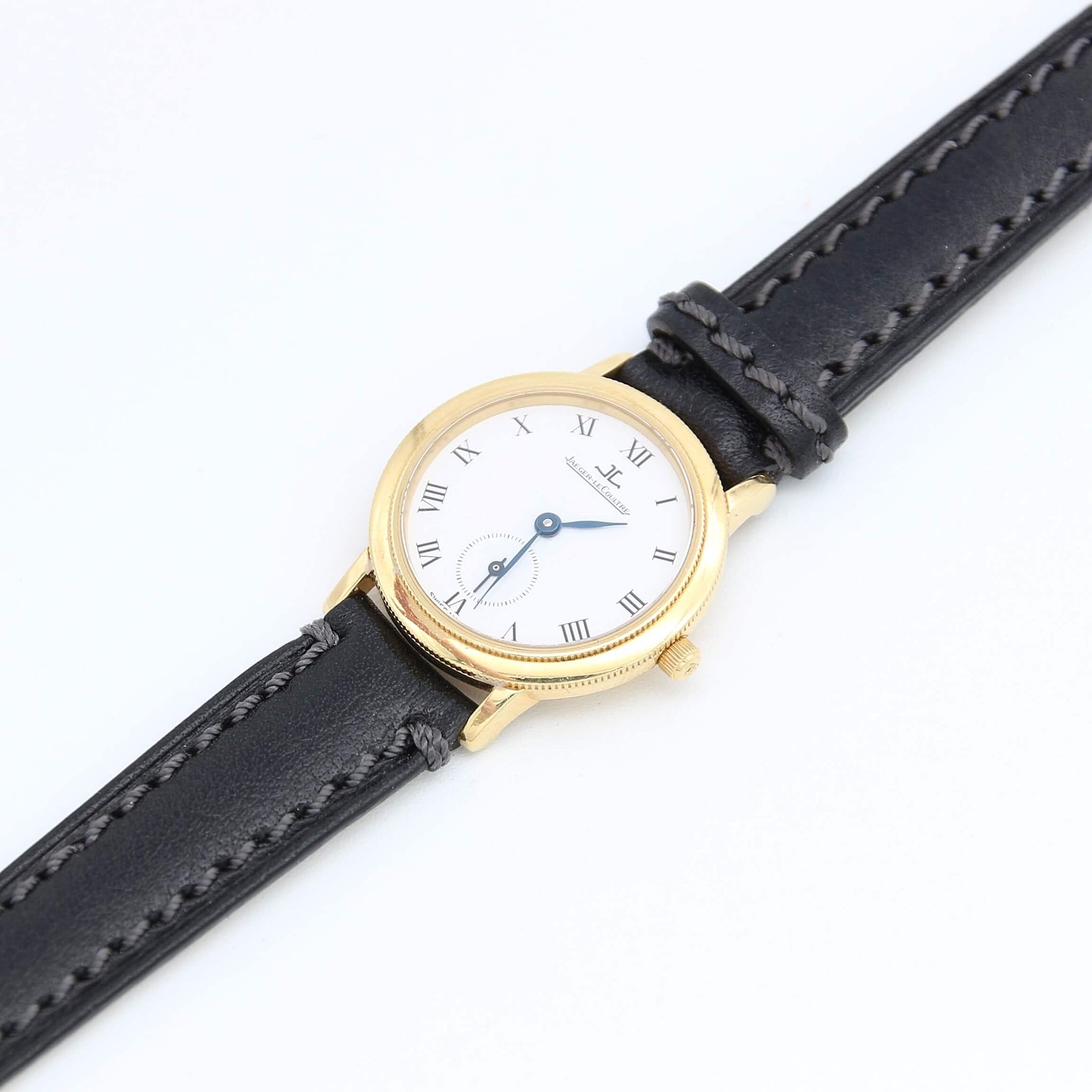 This Jaeger LeCoultre watch has a 26mm case with a round caseback and white Roman Numeral dial.