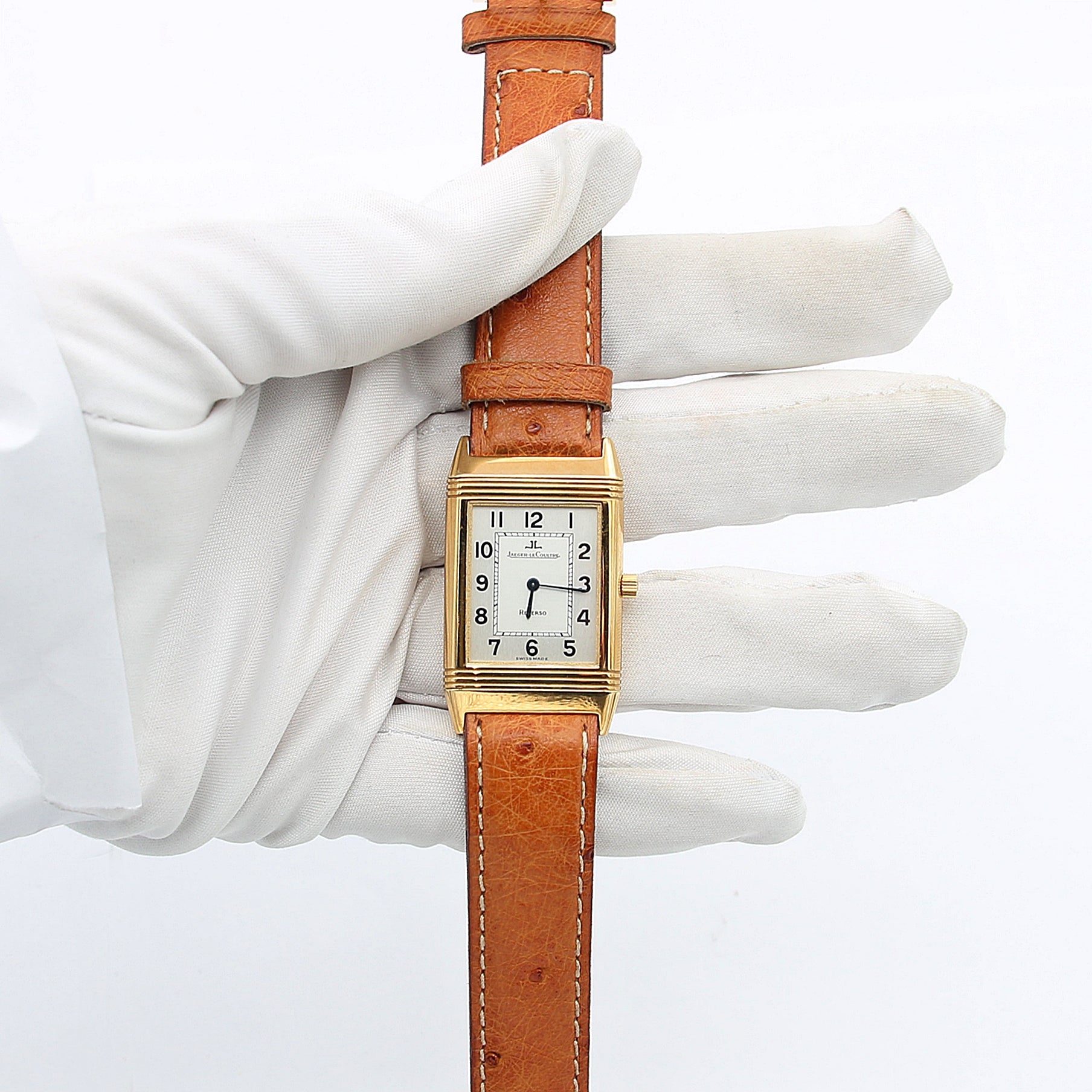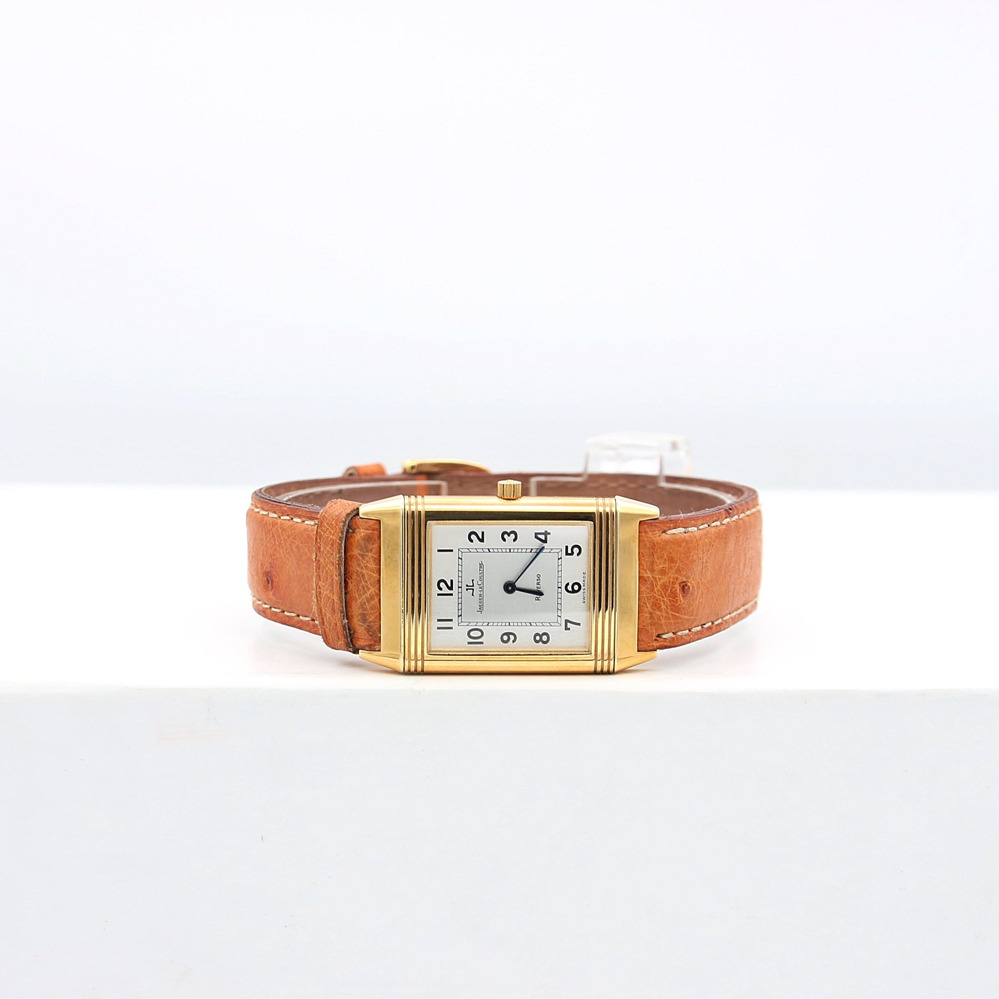 This Reverso Classique is on an original JLC leather bracelet (ostrich) with a very elegant and modern with a JLC yellow gold buckle.