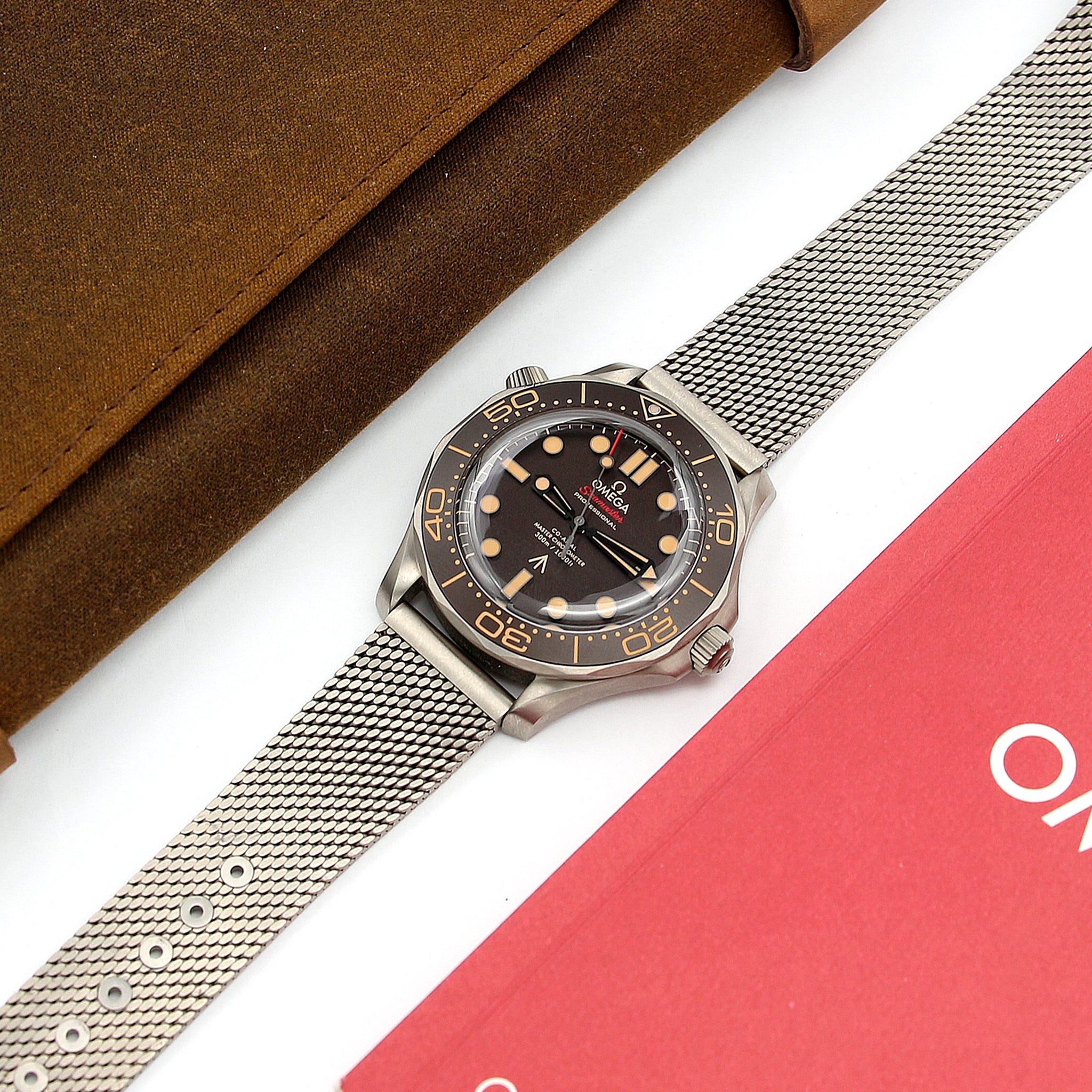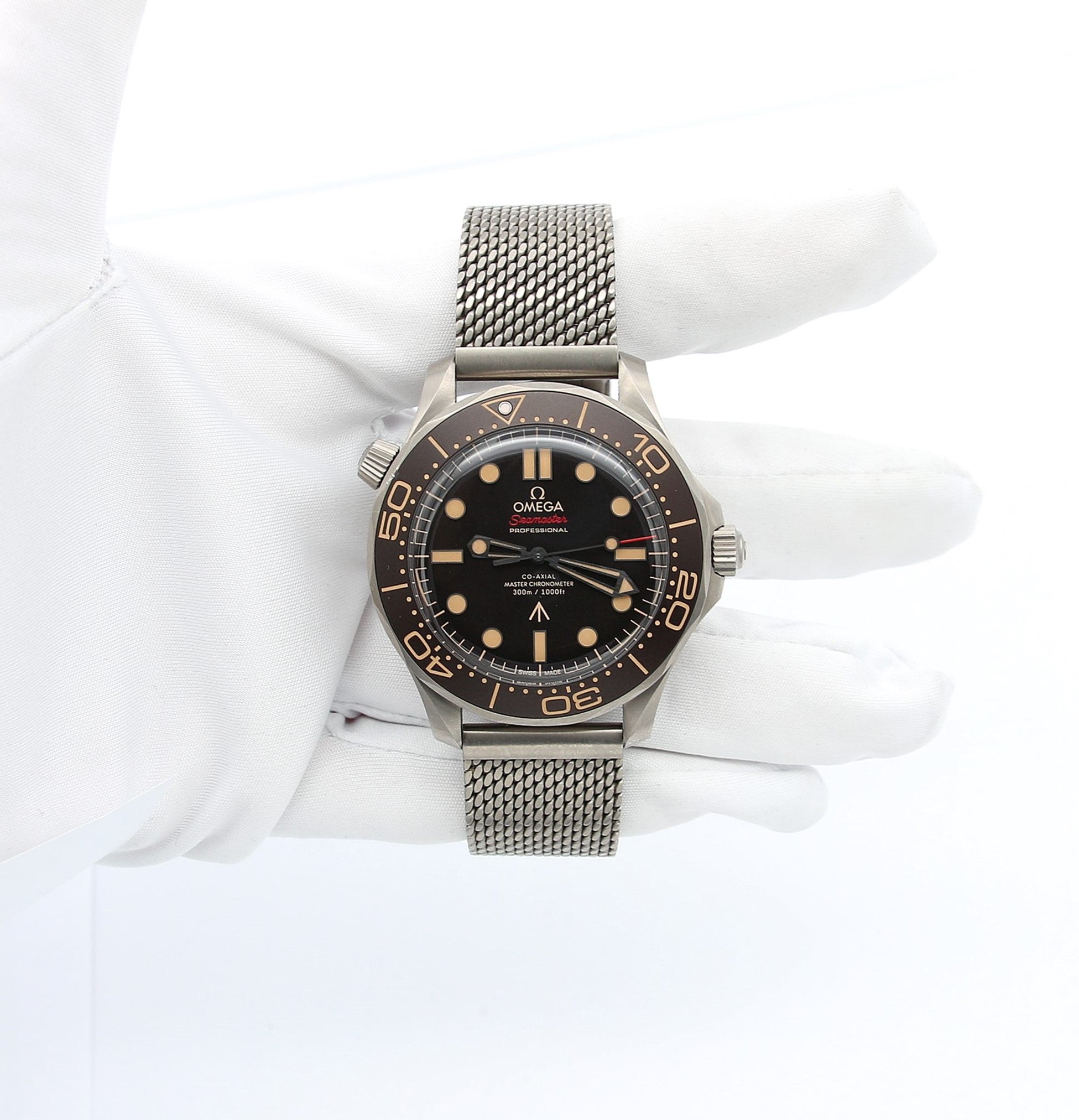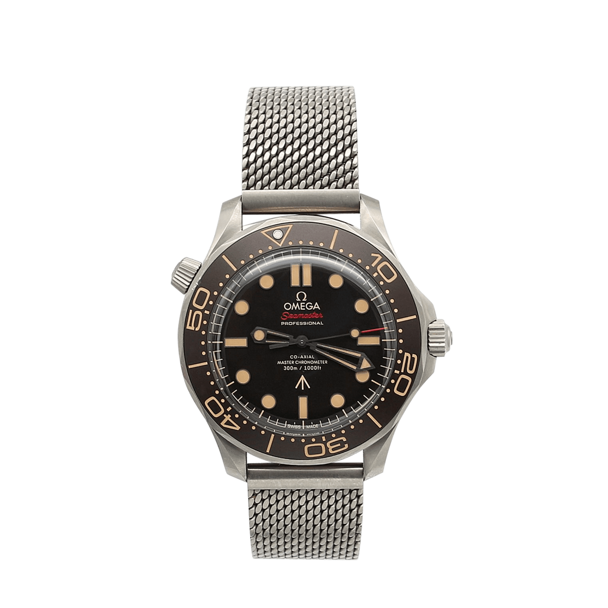 Identical to 007’s watch in "No Time To Die" this 42mm Seamaster, in strong yet lightweight Grade 2 Titanium, sports a brown tropical aluminium bezel ring and dial.