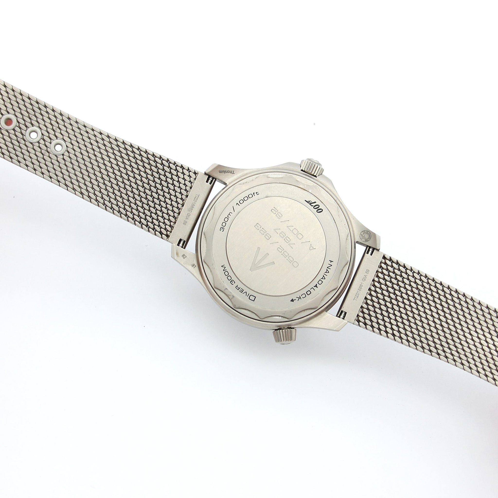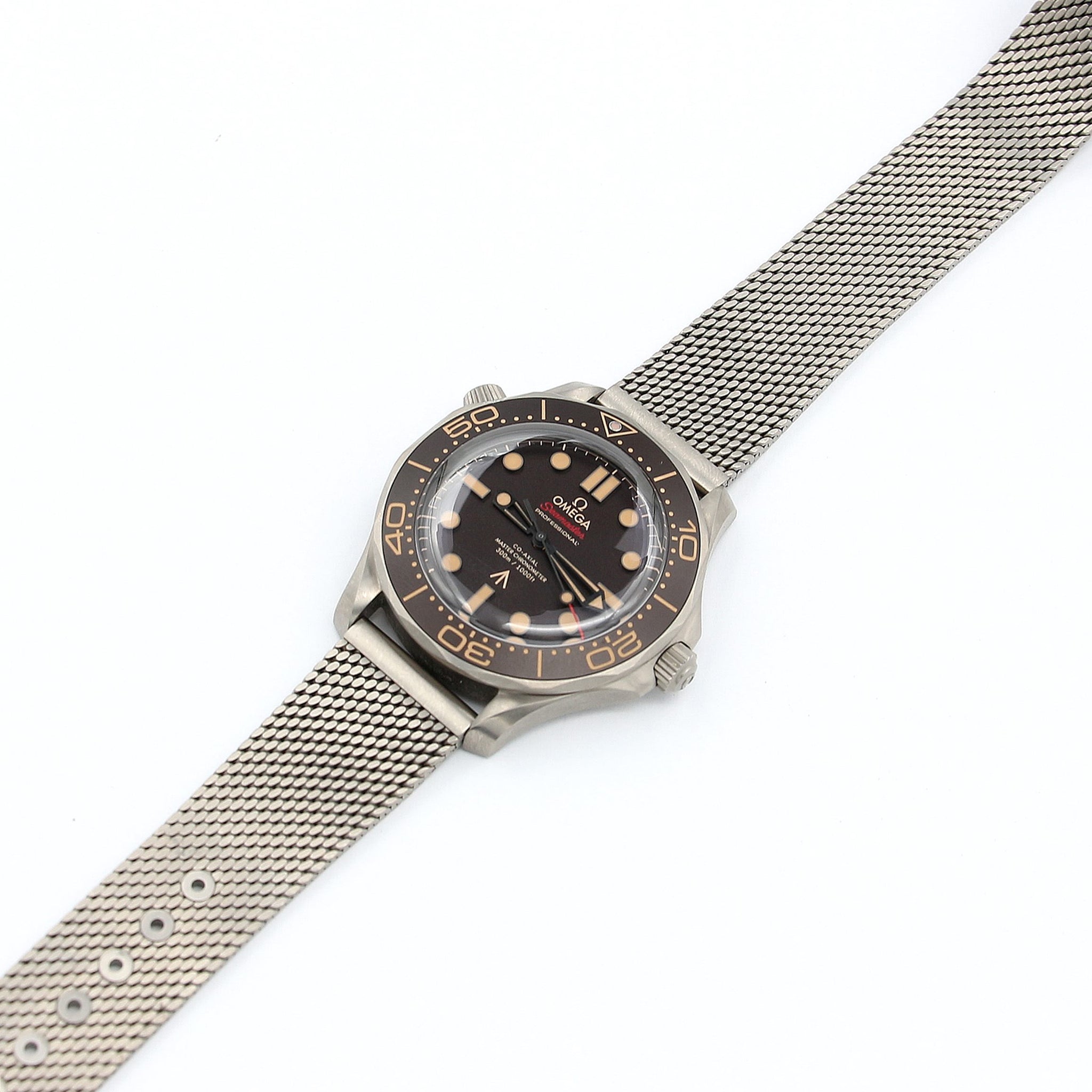 This 007 Edition is worn on a Milanese titanium bracelet with straight end-links, once again in line with the military/tool inspiration of the watch.