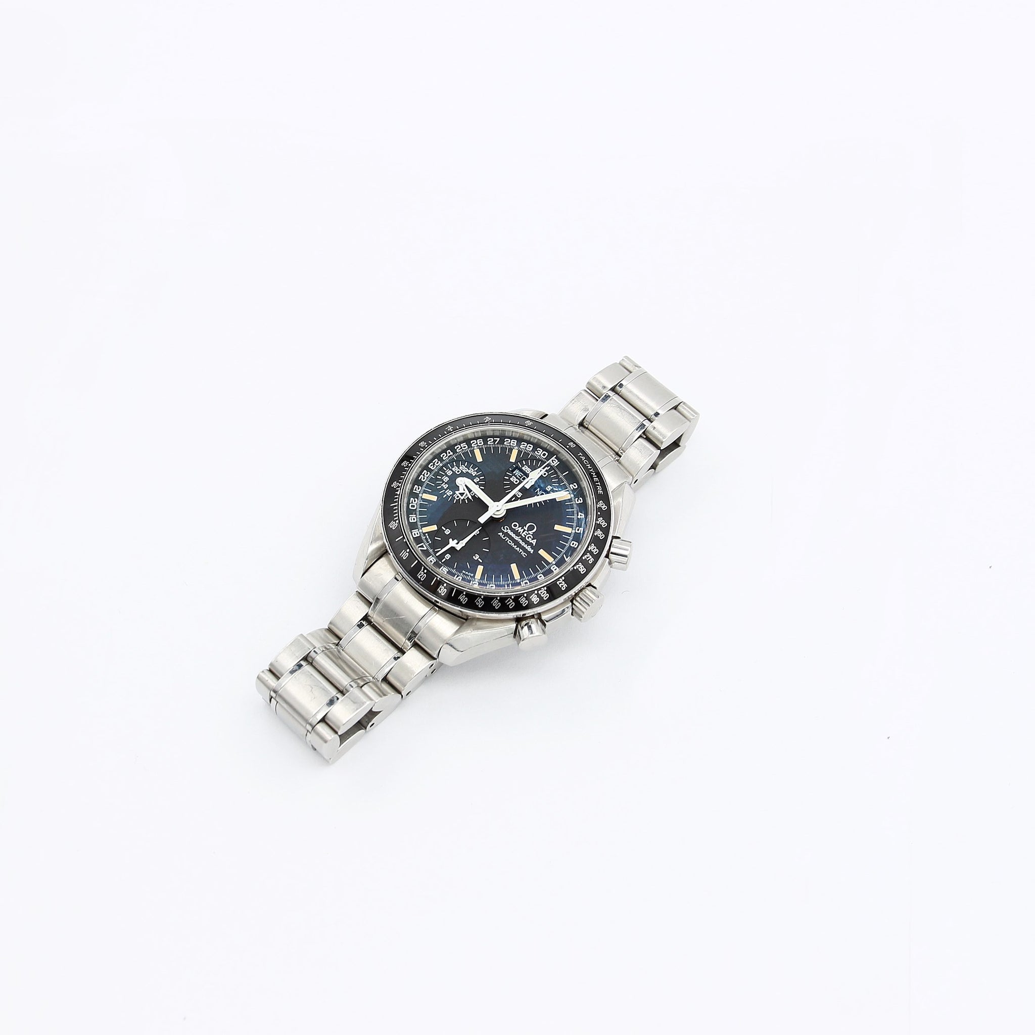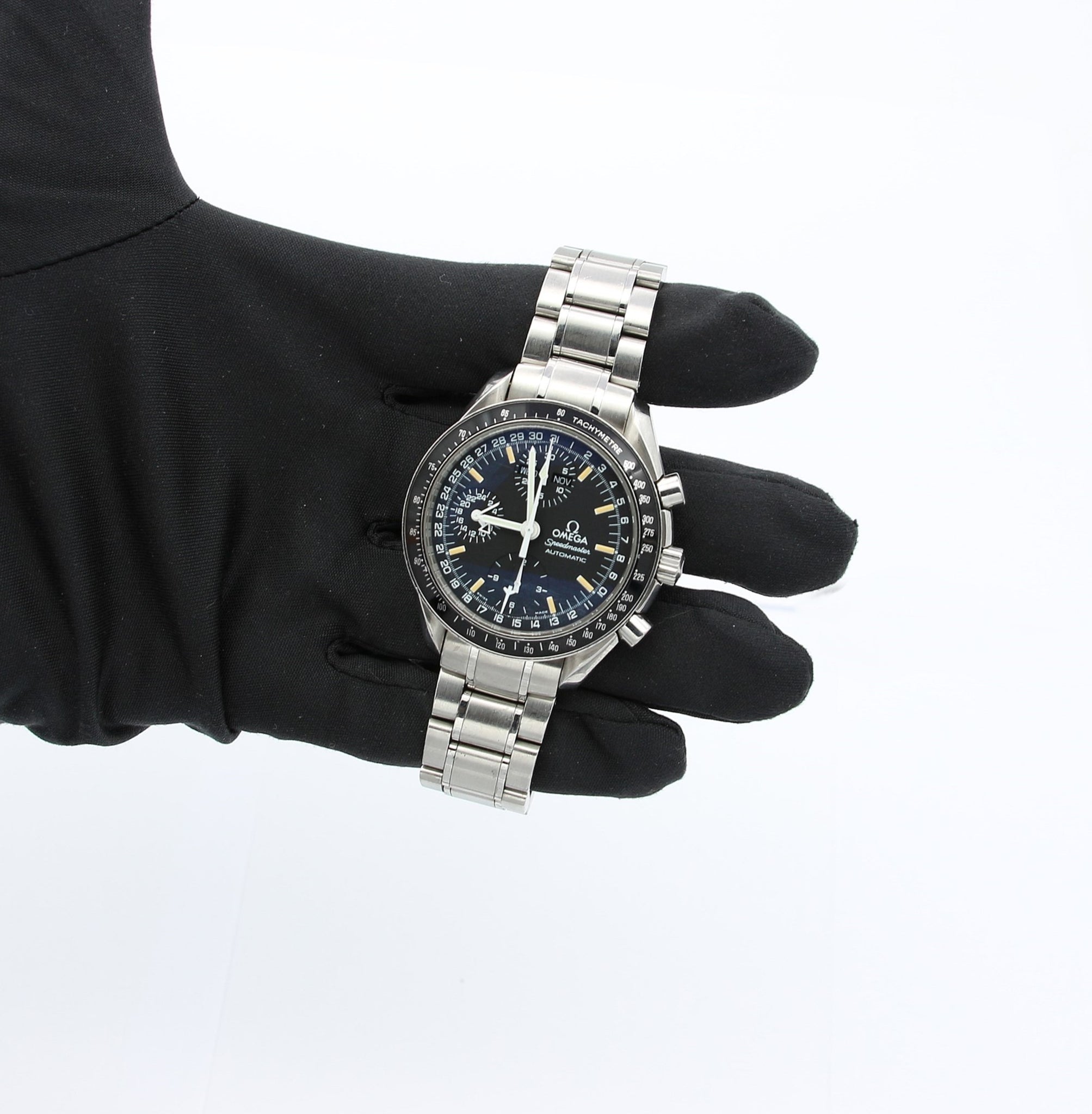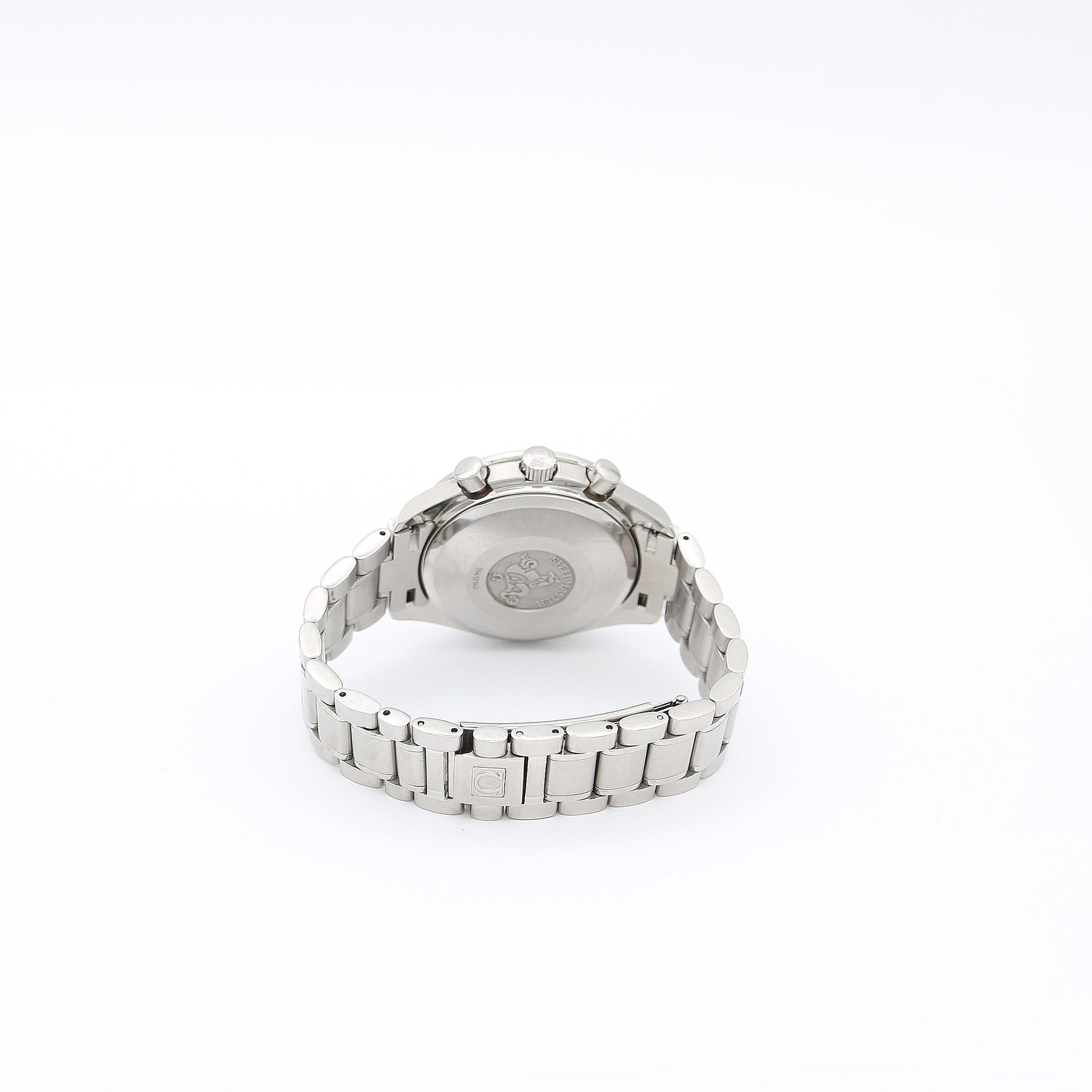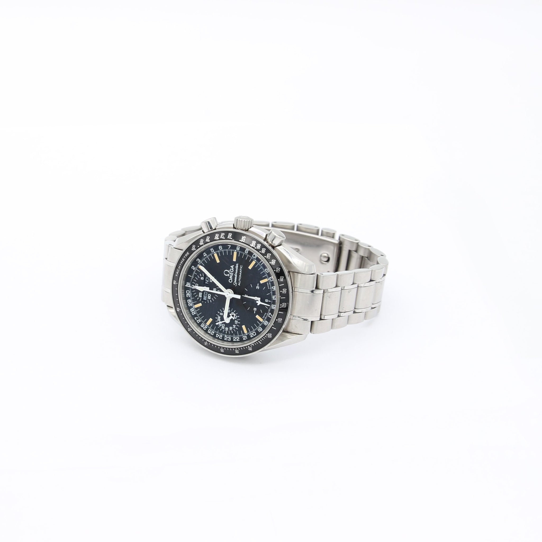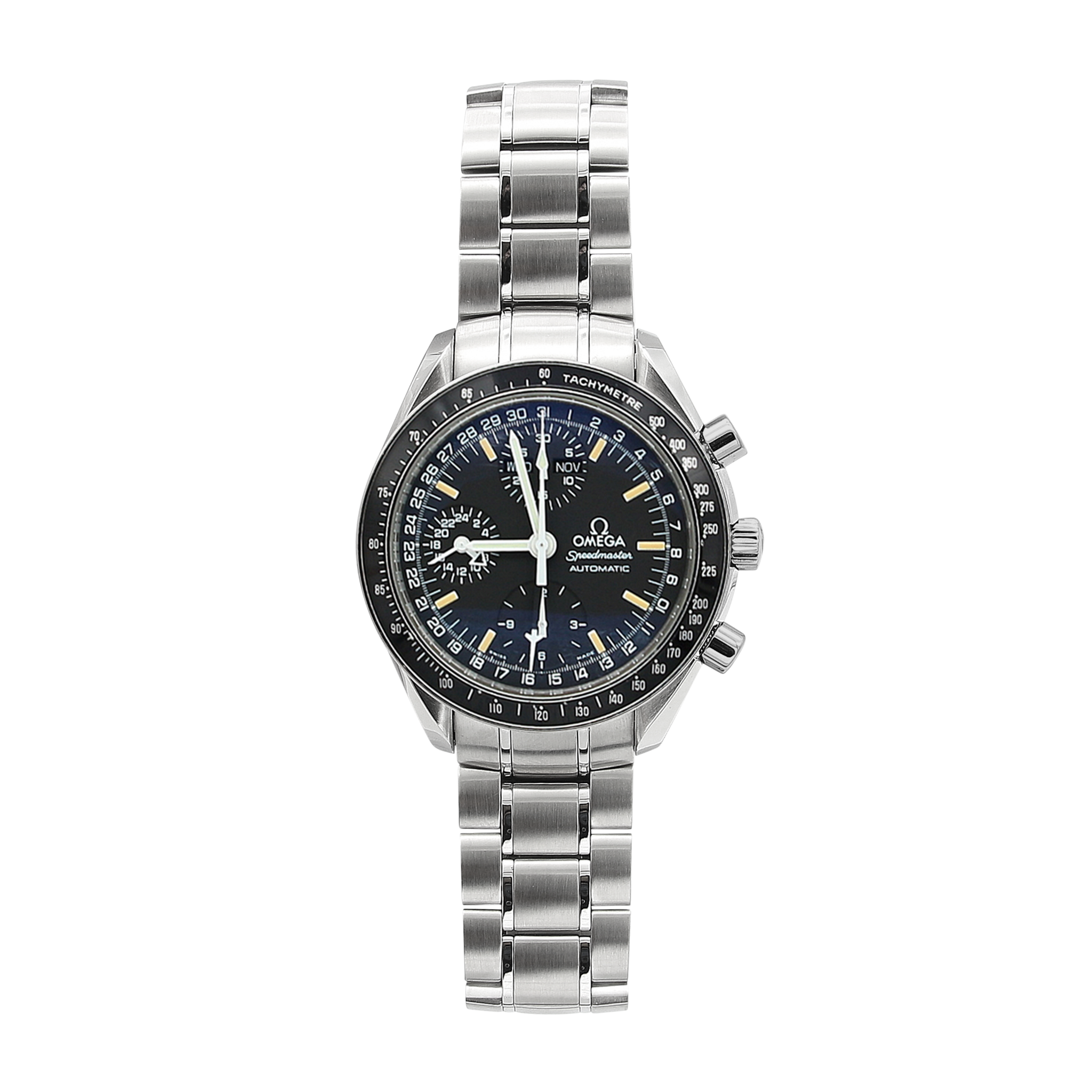 Features of this Omega Speedmaster Day-Date include hours, minutes, small seconds, day, date, month and chronograph.
