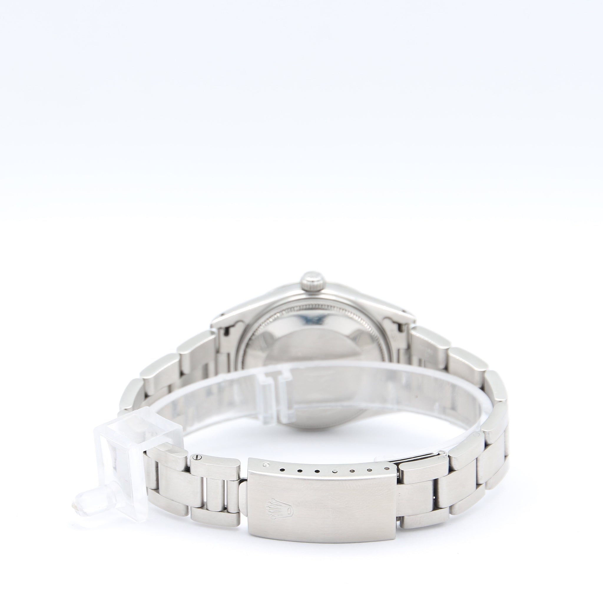 The Date Rolex features a acrylic crystal, Rolex Chronometer, waterproof stainless steel case 34mm in diameter, smooth bezel.