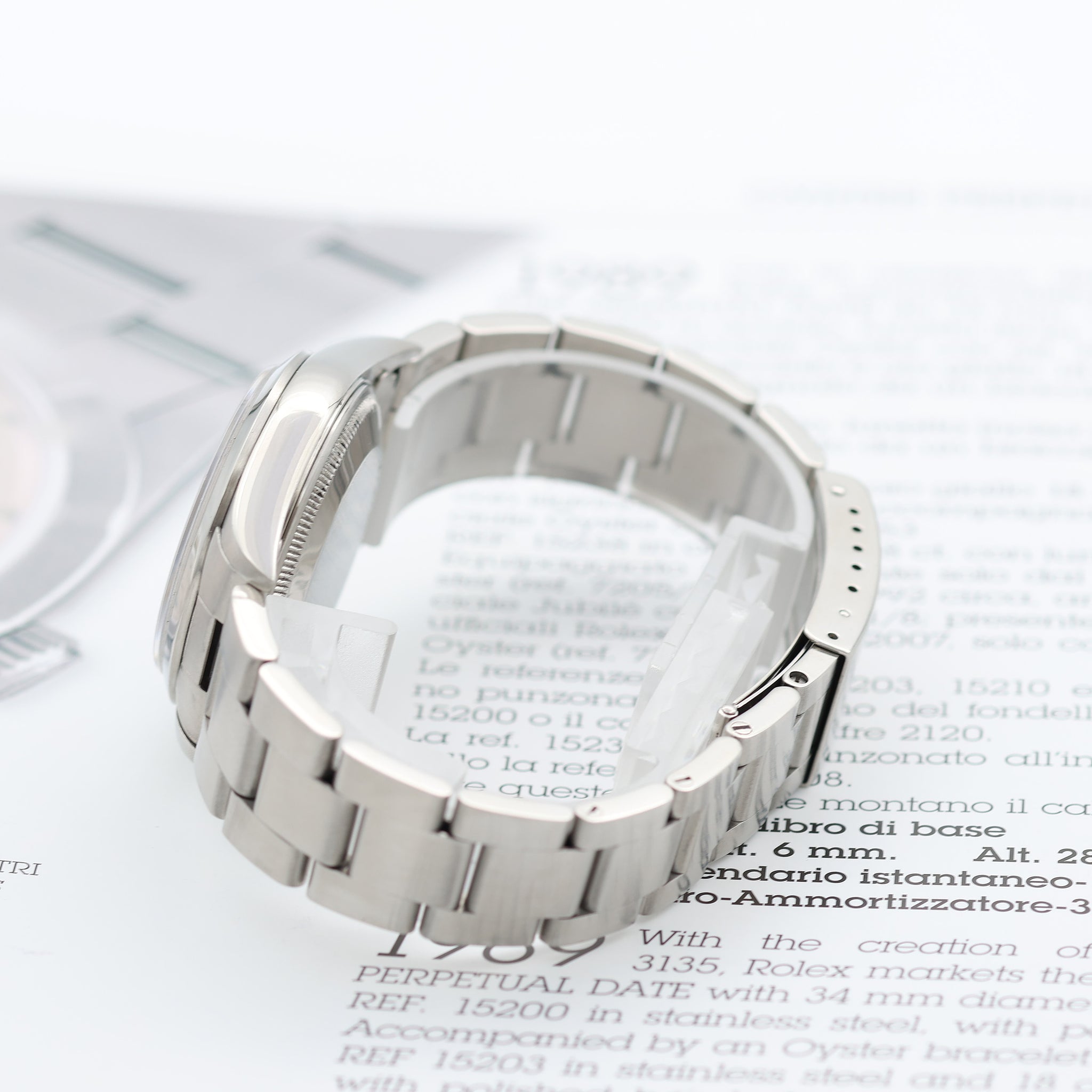For sale at Debonar Watches: pre-owned Rolex Date ref. 15200, full set with original papers and box, on top of an Oyster bracelet.
