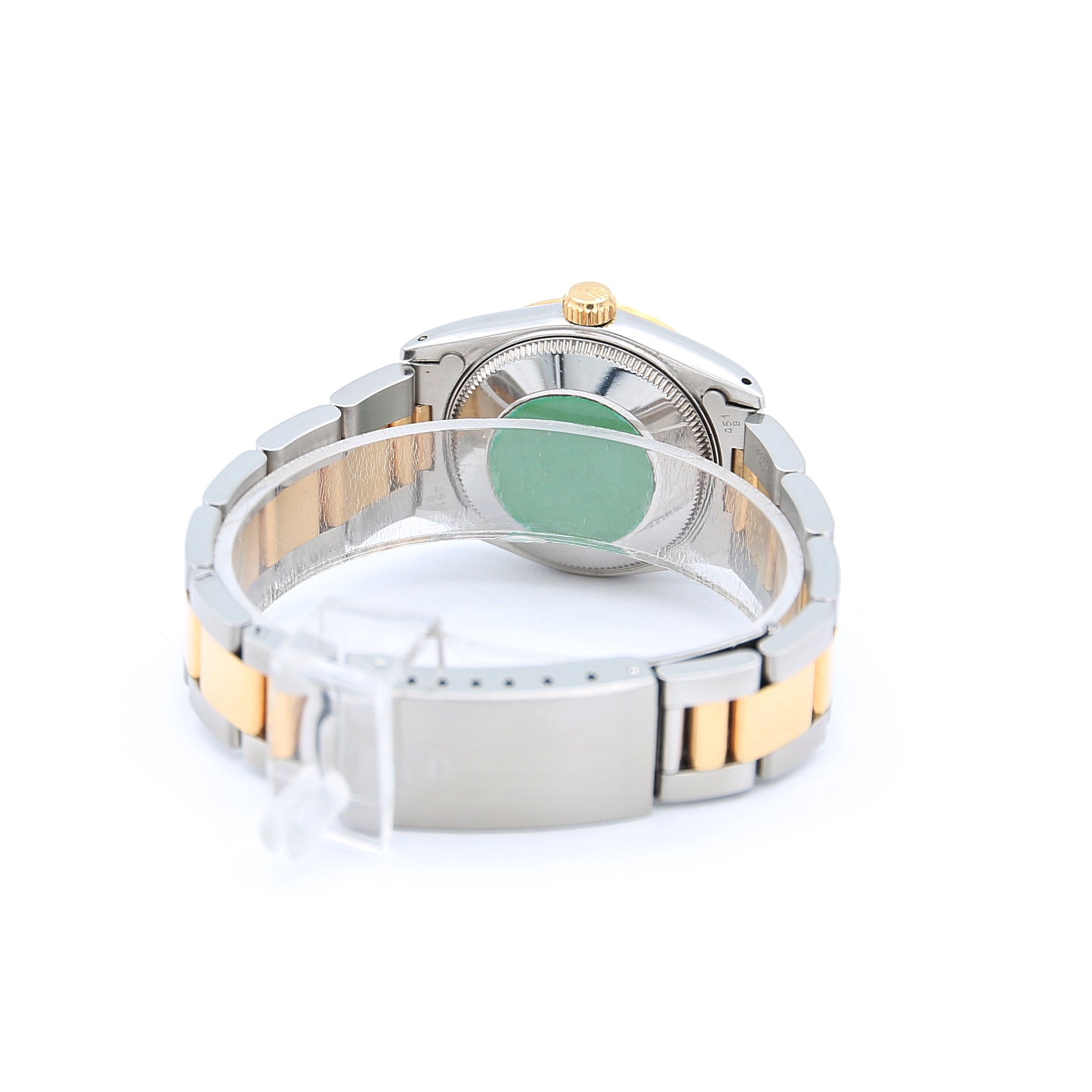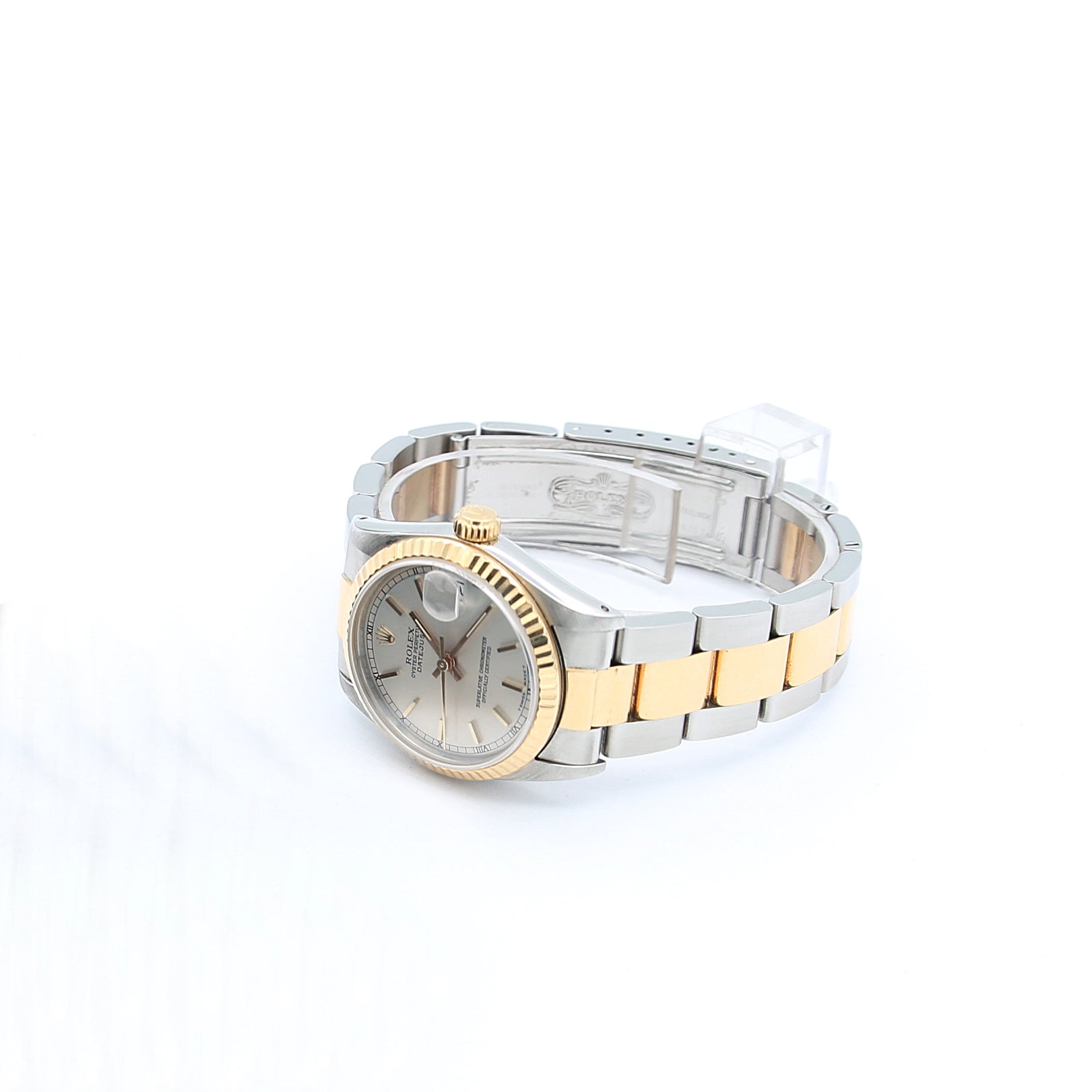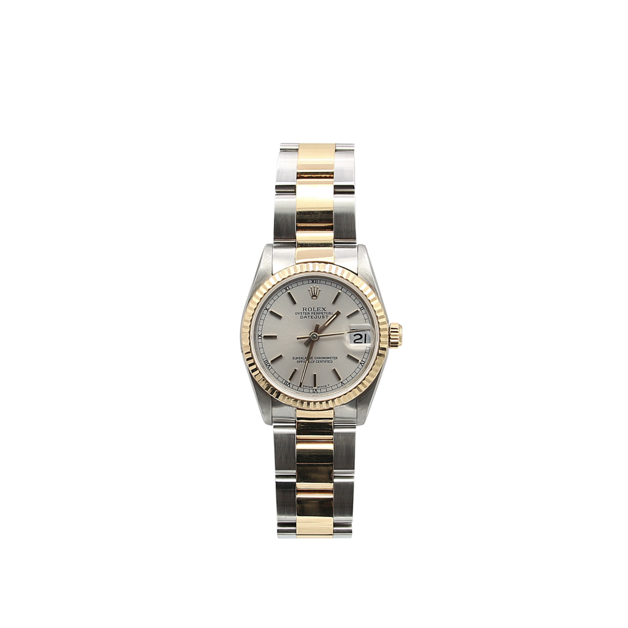 This elegant Rolex features a steel and yellow gold Oyster bracelet, a matching case in stainless steel, and a yellow gold fluted bezel.