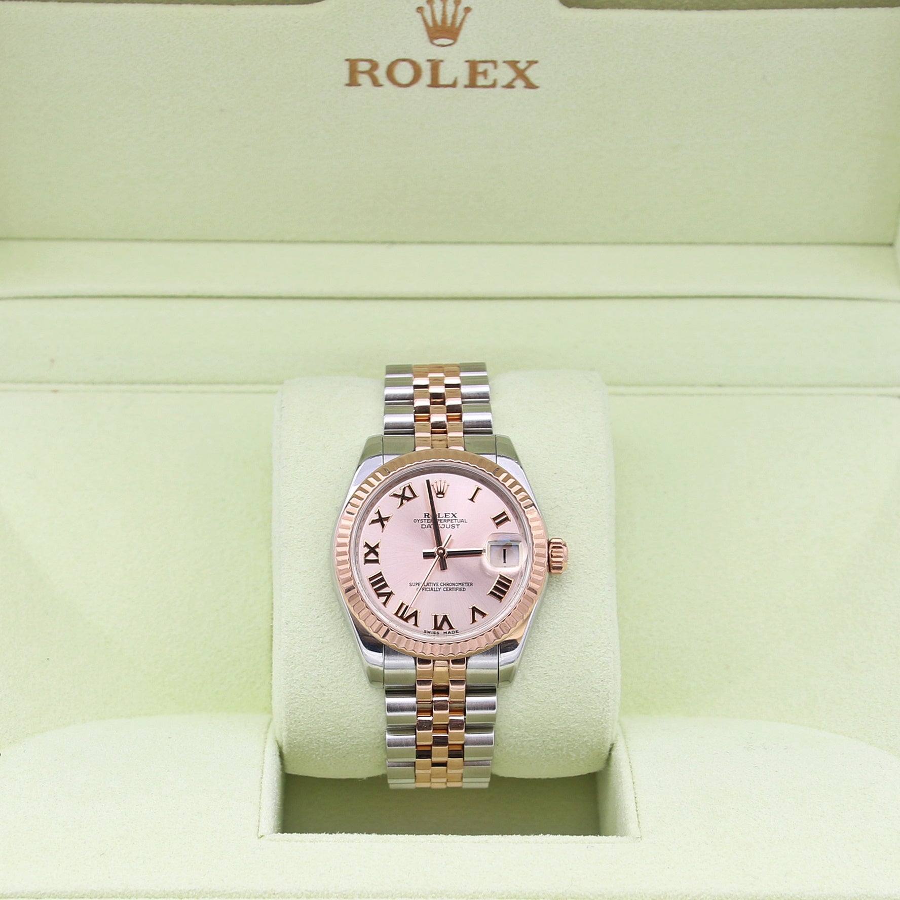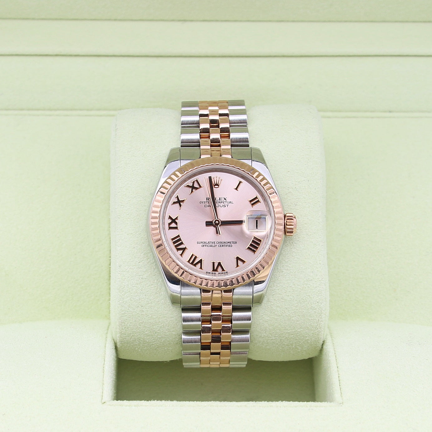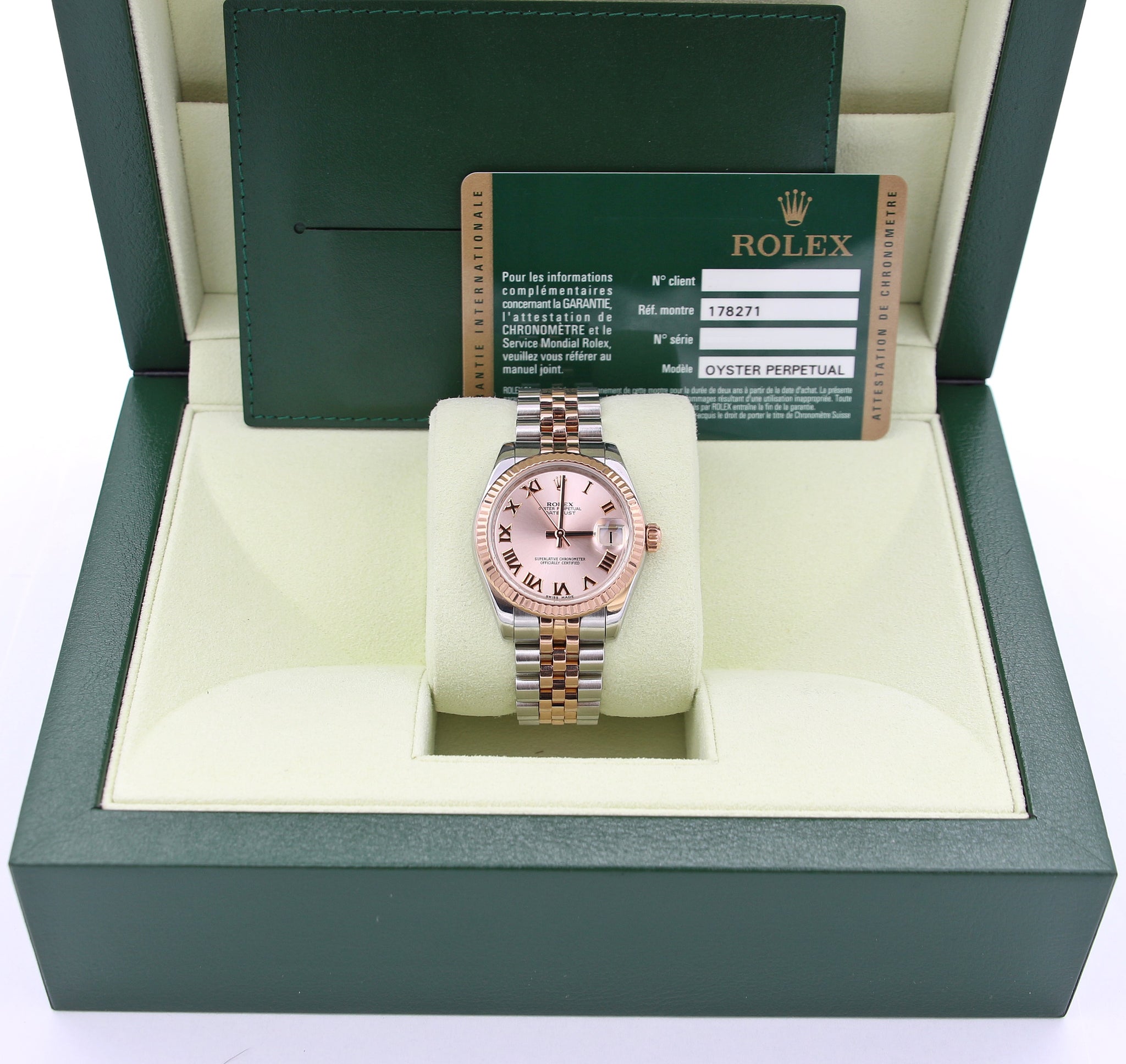 This pre-owned Rolex Lady-Datejust Ref. 178271, with a 31mm Oystersteel and rose gold case, fluted yellow gold bezel, sundust dial with roman numbers and date indicator at 3 o'clock, sapphire crystal, automatic movement.