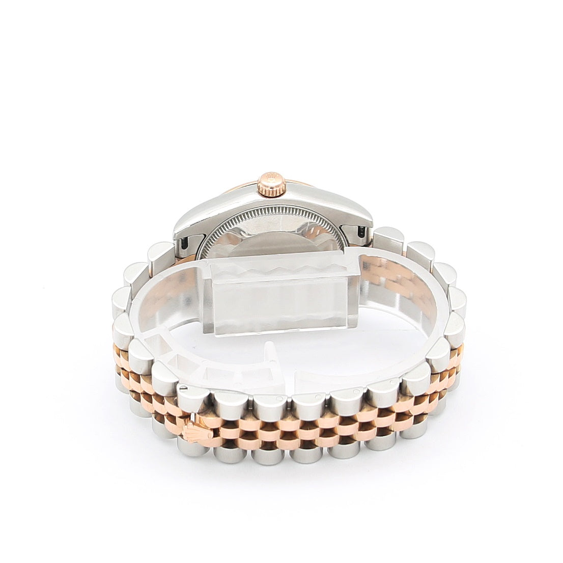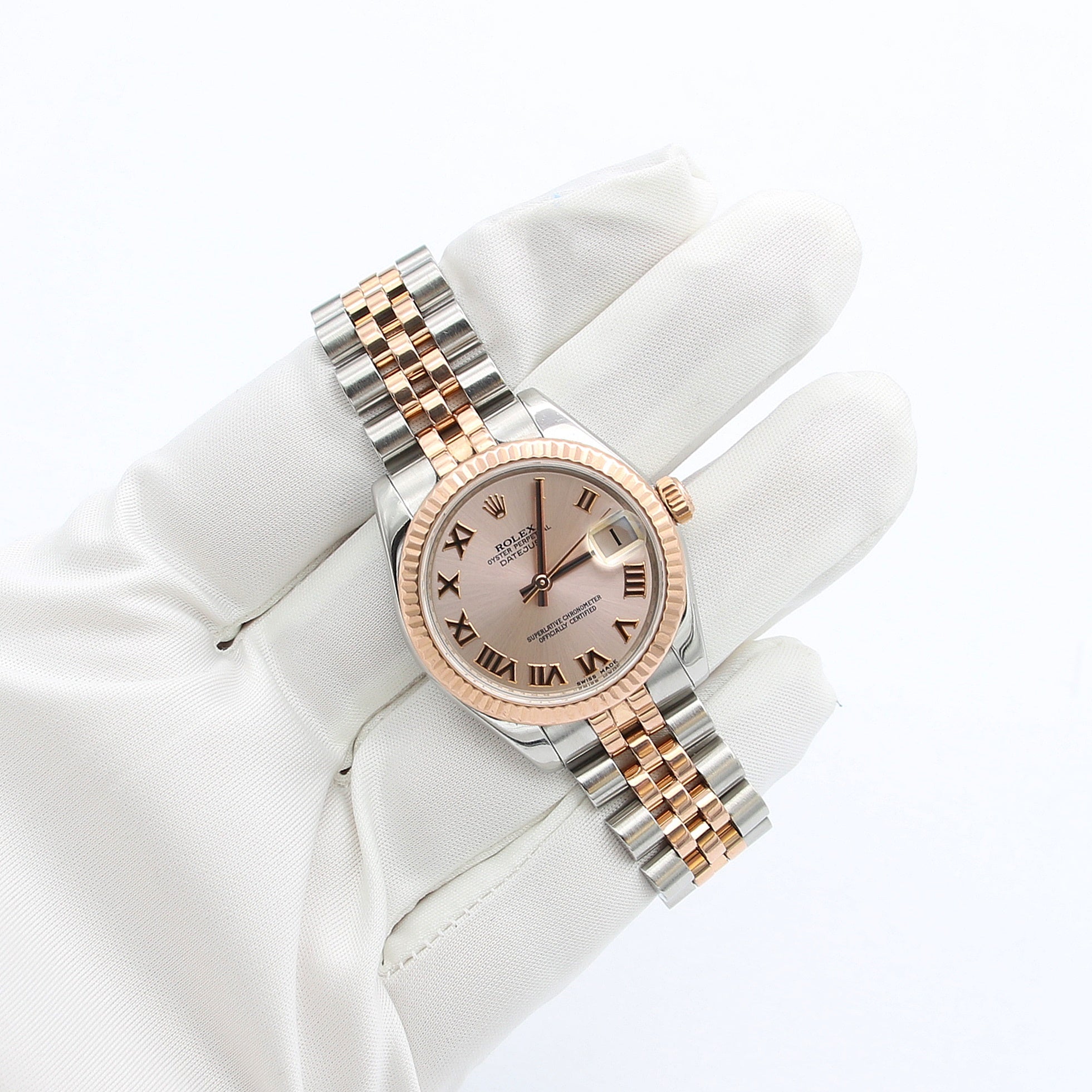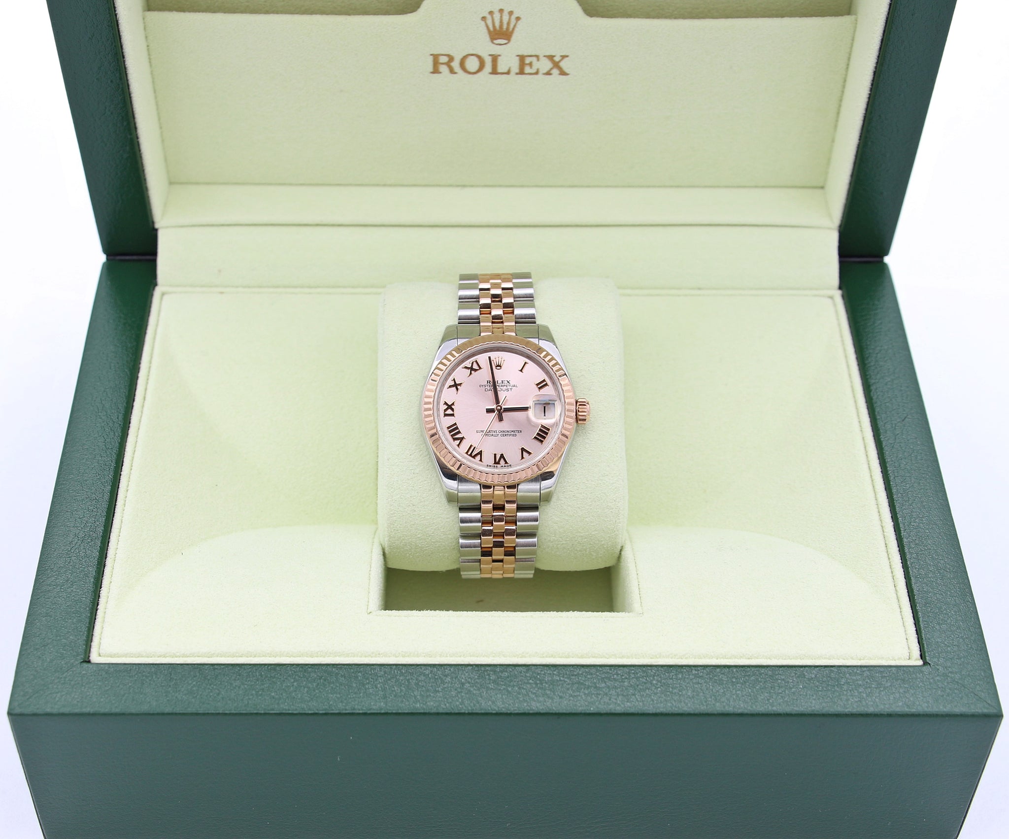 This pre-owned Rolex Lady-Datejust Ref. 178271, with a 31mm Oystersteel and rose gold case, fluted yellow gold bezel, sundust dial with roman numbers and date indicator at 3 o'clock, sapphire crystal, automatic movement.