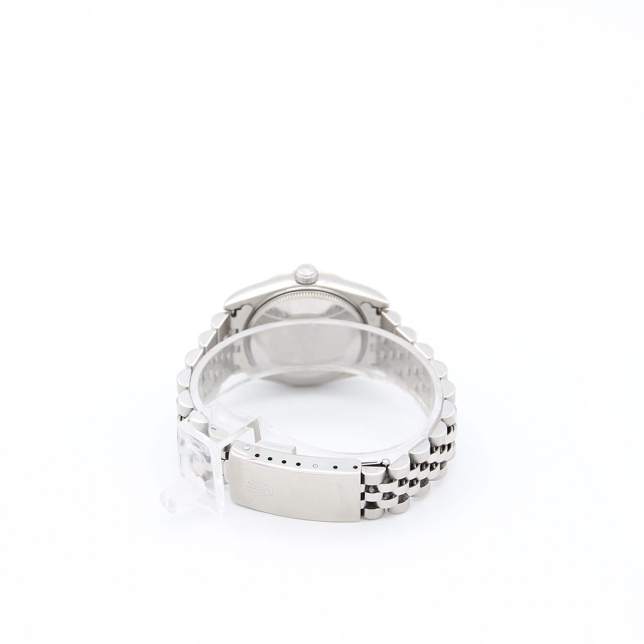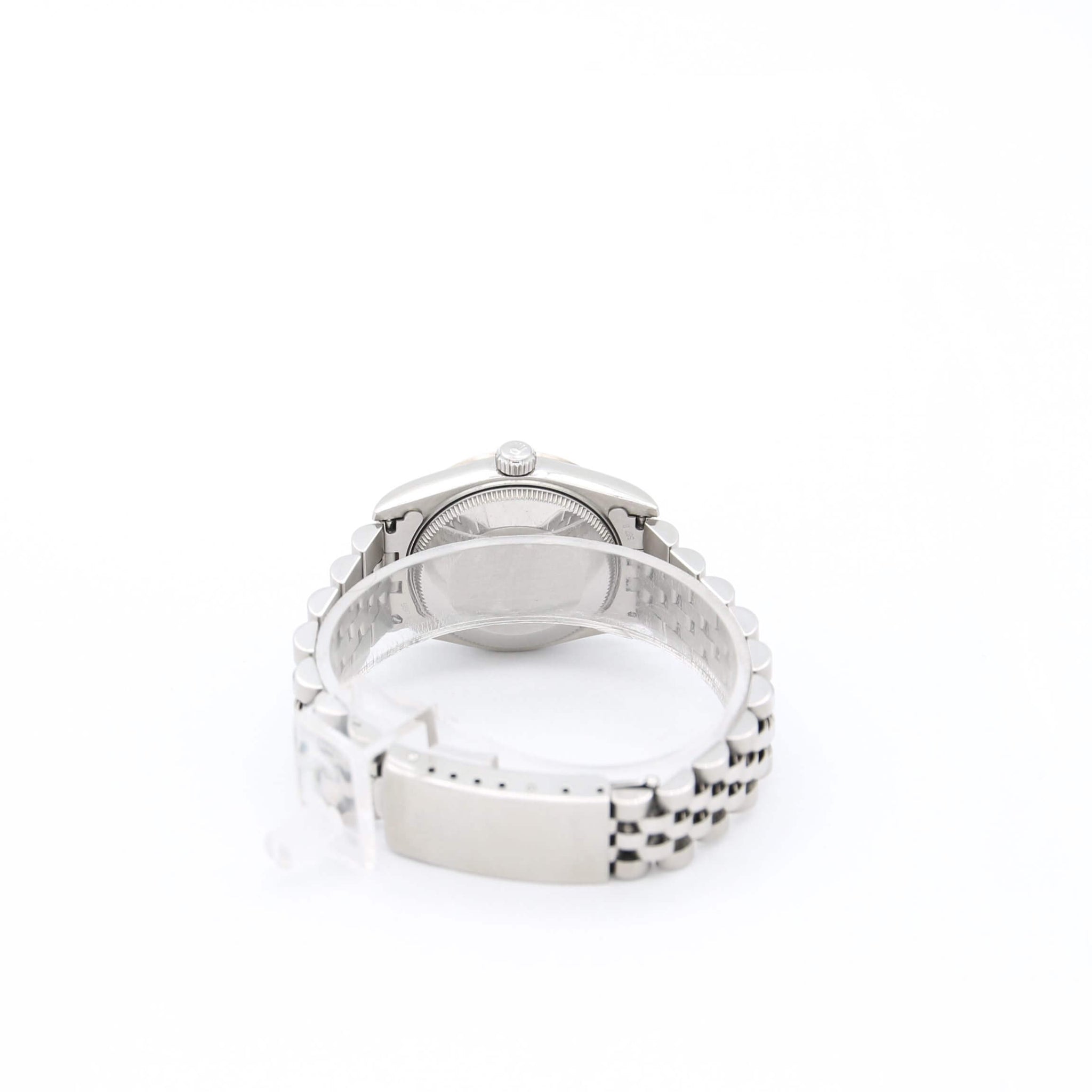 This luxury watch is presents a classic Datejust style with a fluted bezel, a self-winding Perpetual movement, and the iconic 5-point Rolex logo coronet prominently displayed at the 12-hour marker.