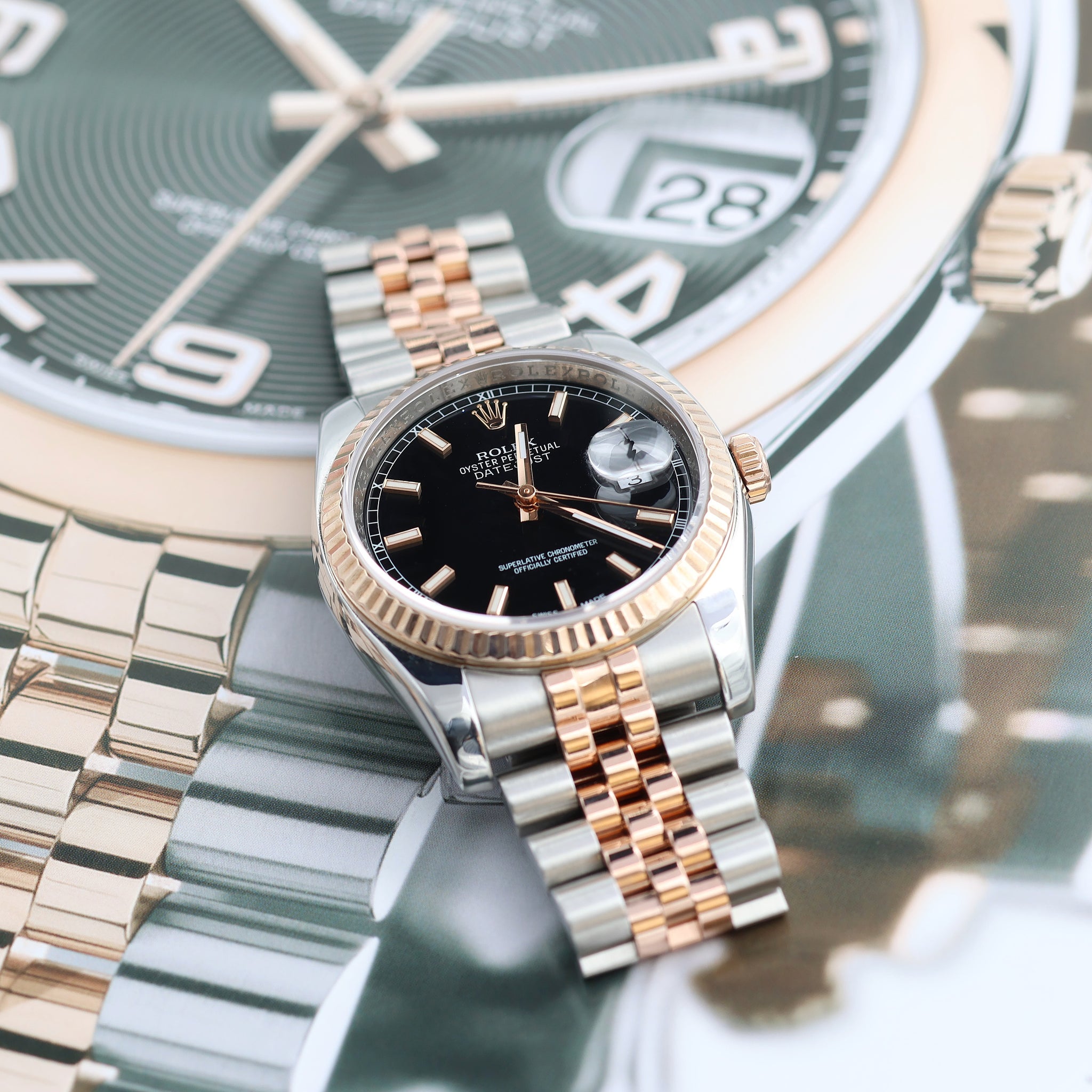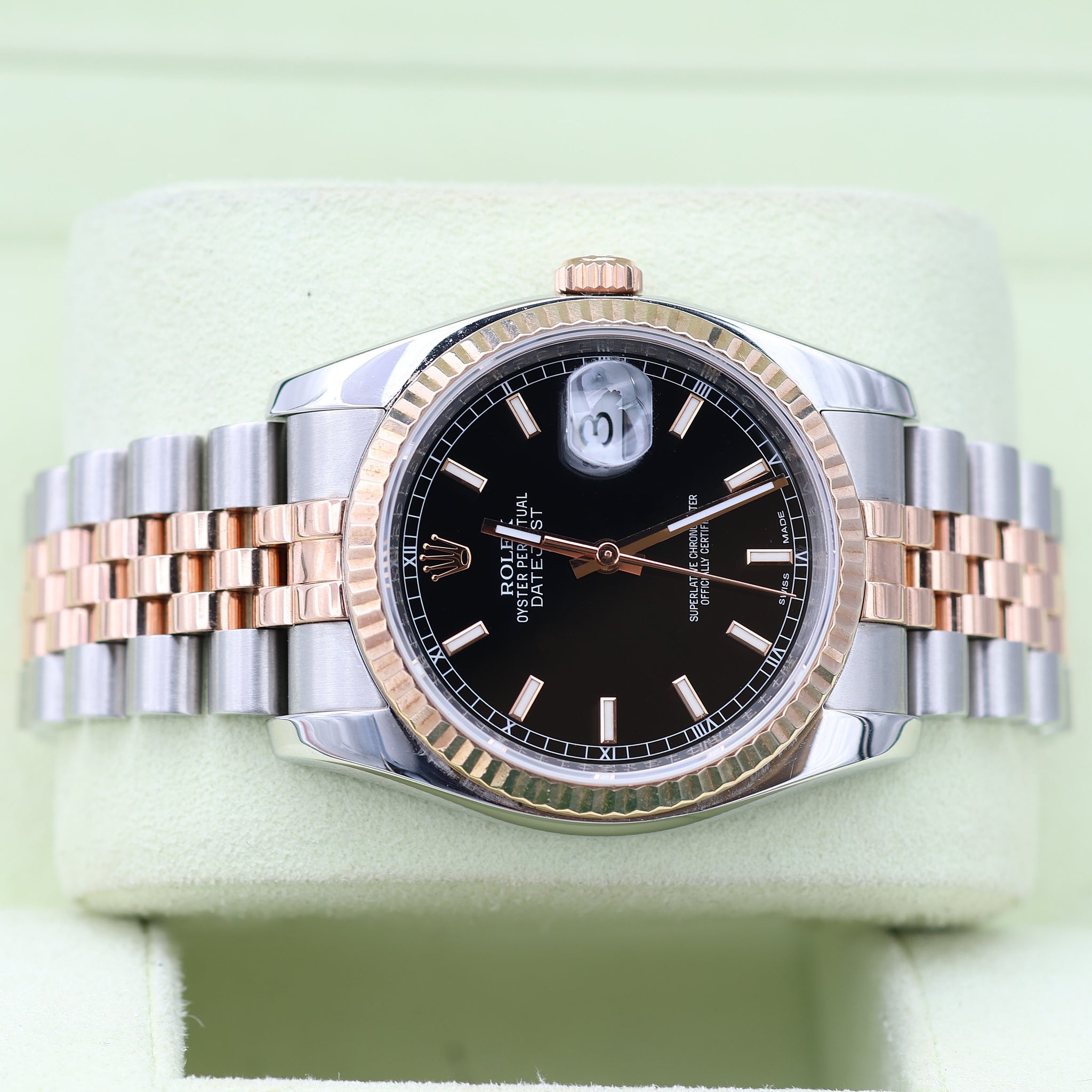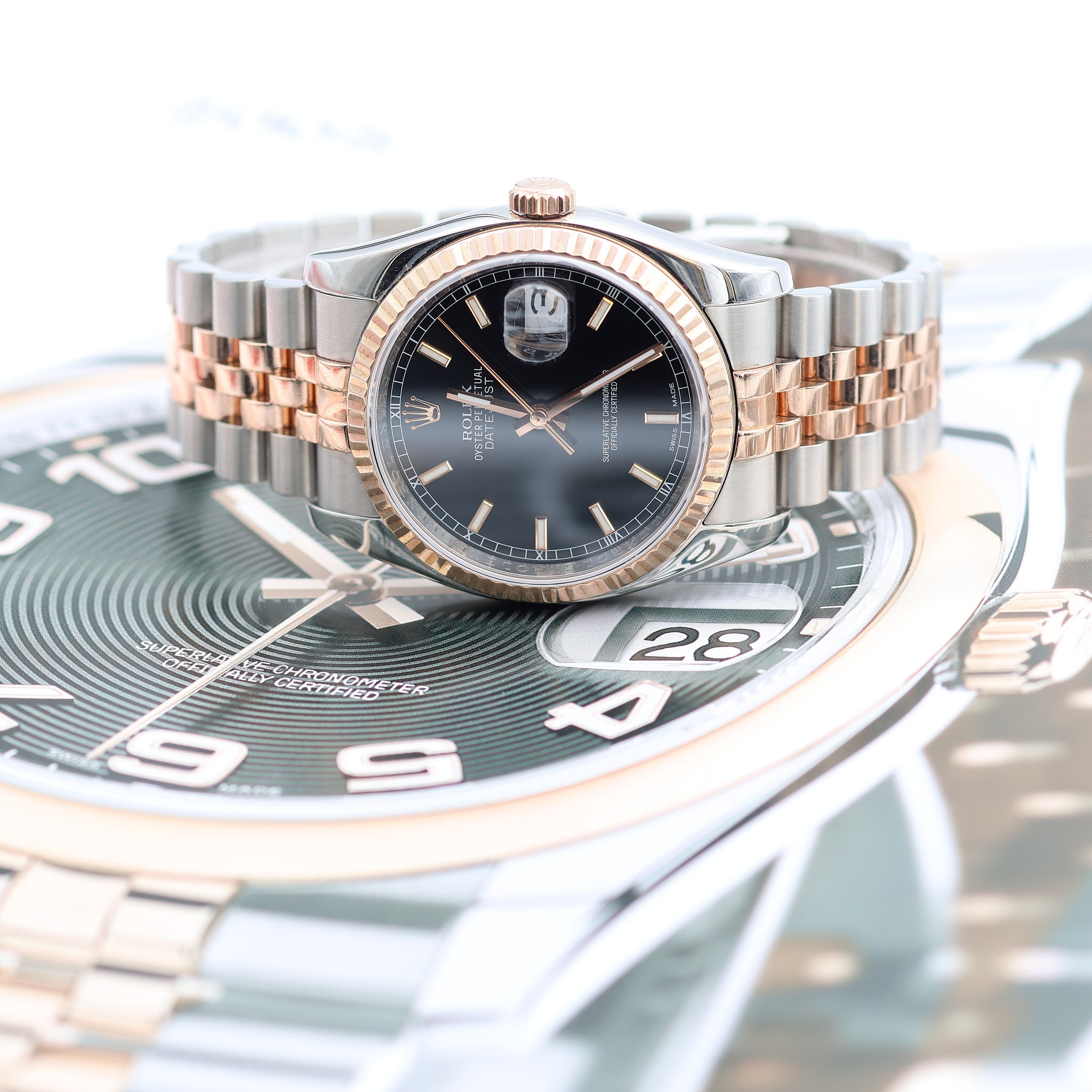 The two-tone construction of the 36mm ref. 116231, topped by a gold rose bezel which displays just a hint of flamboyance, is really the perfect analogy of the watchmaker itself.