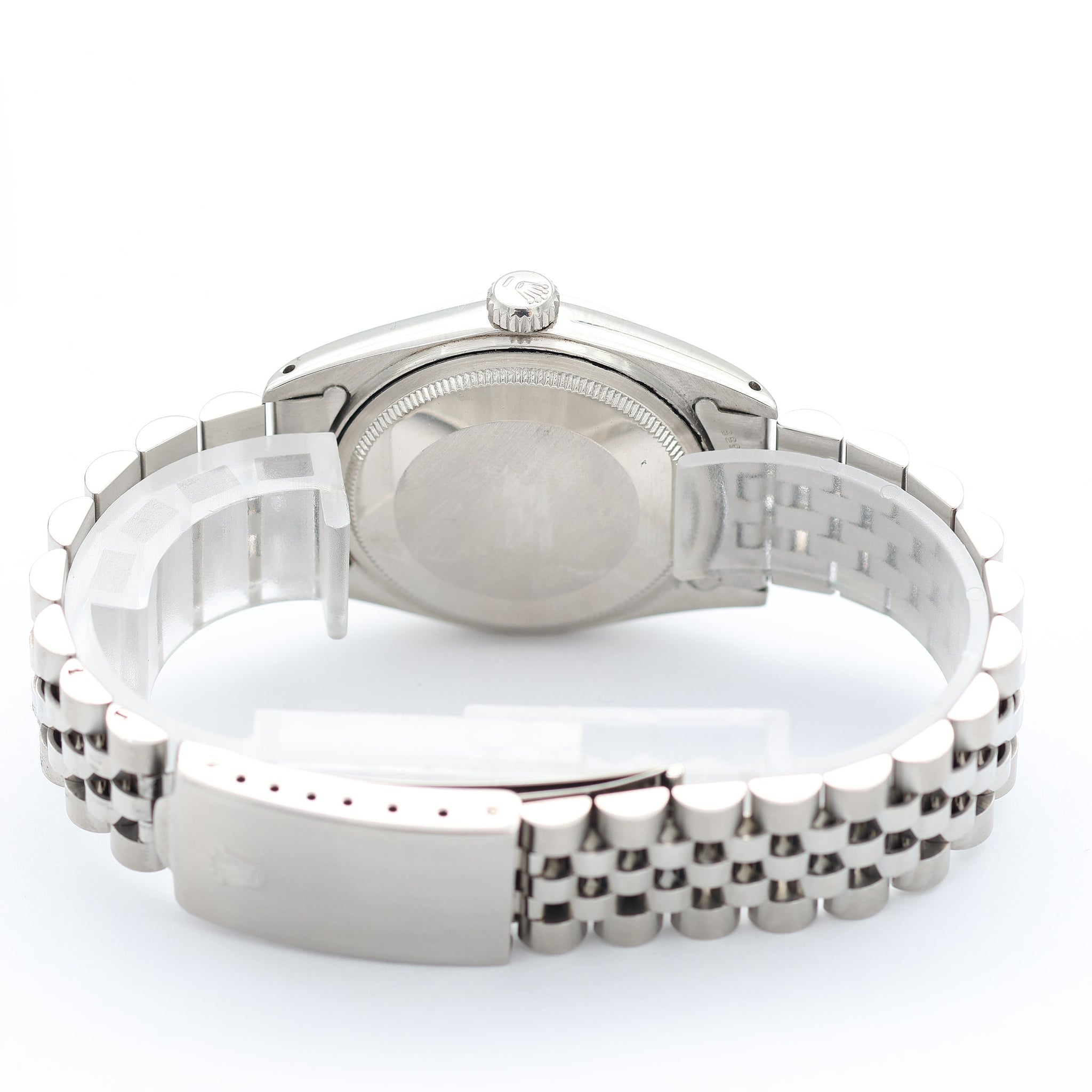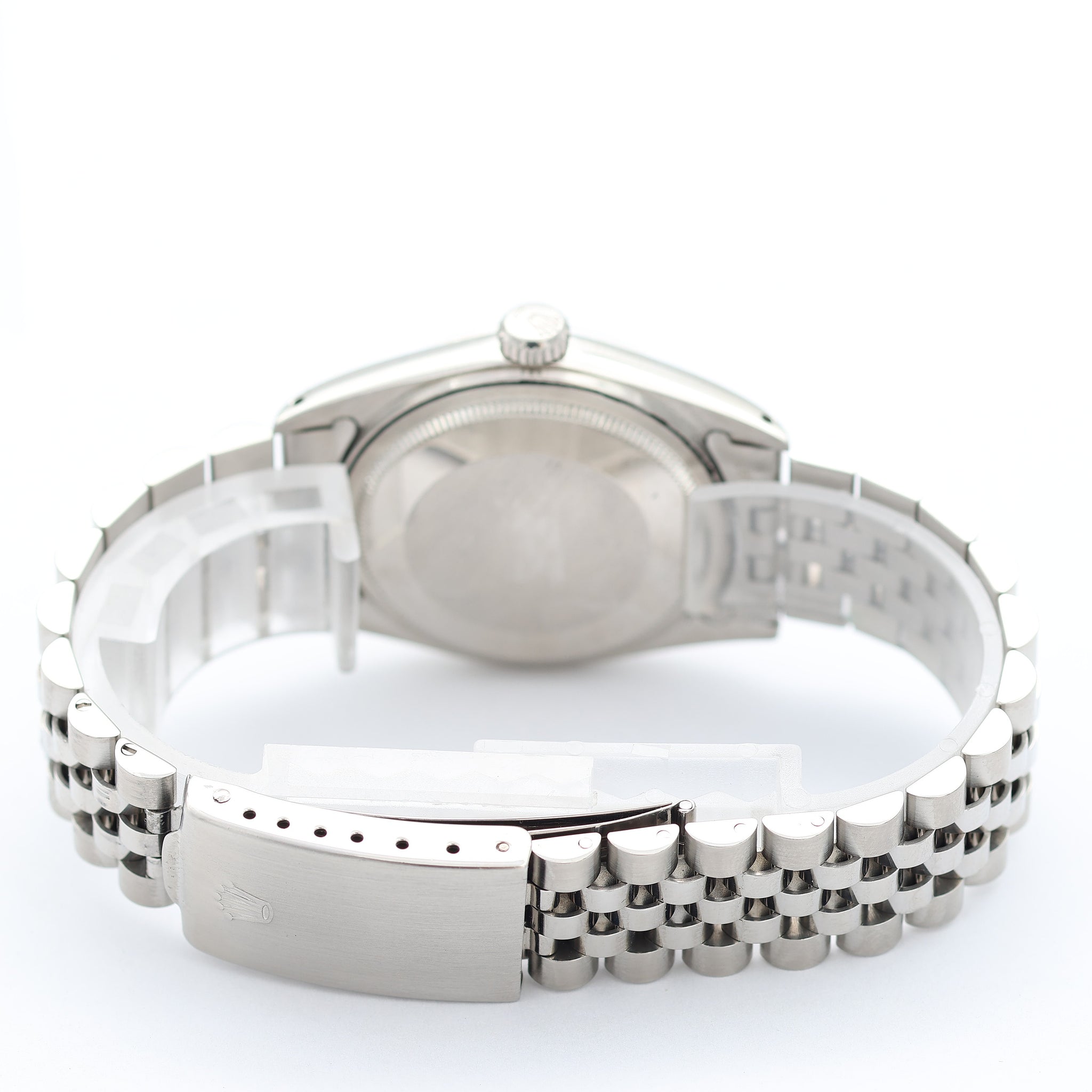 This Rolex has all the signature aesthetics of a Datejust, which include a fluted bezel, baton hour markers, and the Cyclops magnifying bubble over the date window.