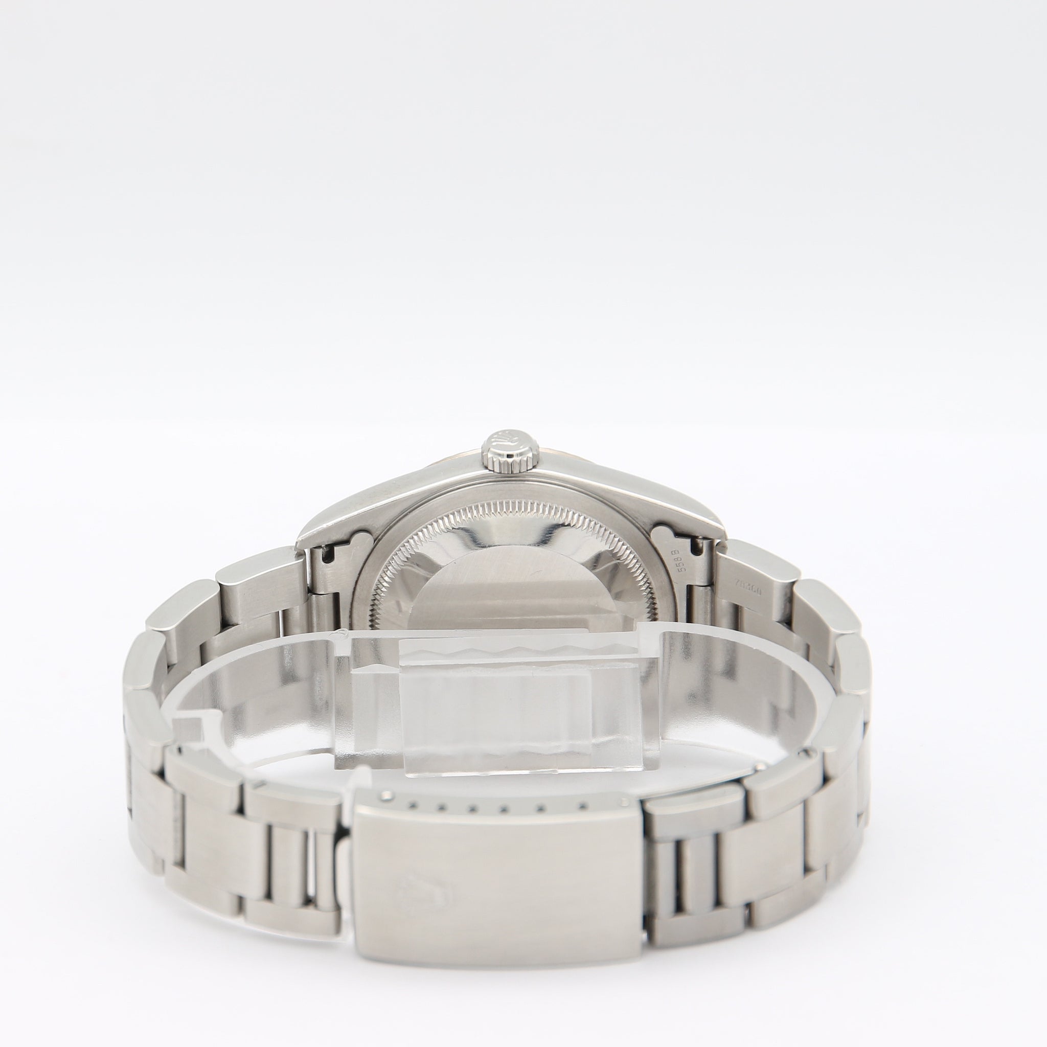 This 36 mm. diameter stainless steel case is set with screw-down case back and crown, a fluted white gold bezel, a sapphire crystal with cyclops lens.