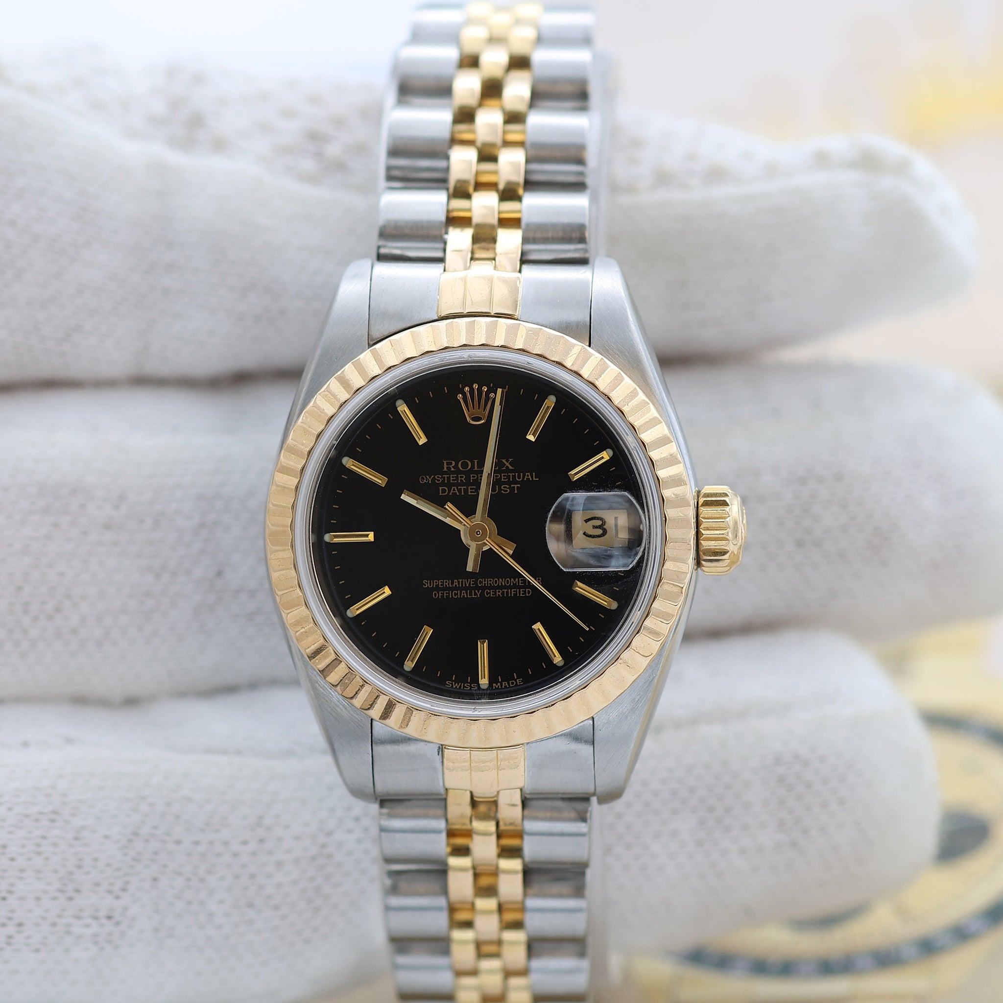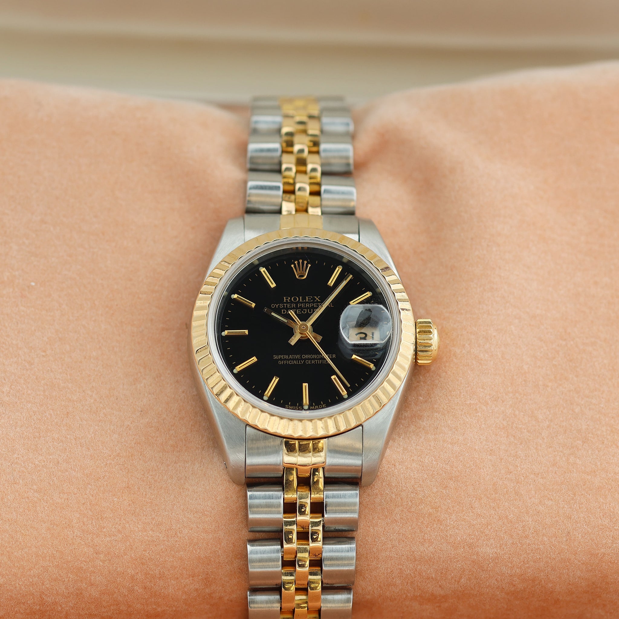 For sale at Debonar Watches: pre-owned Rolex Datejust Lady ref. 69173 from the end of the '90s, with an original Rolex black dial with golden indexes.
