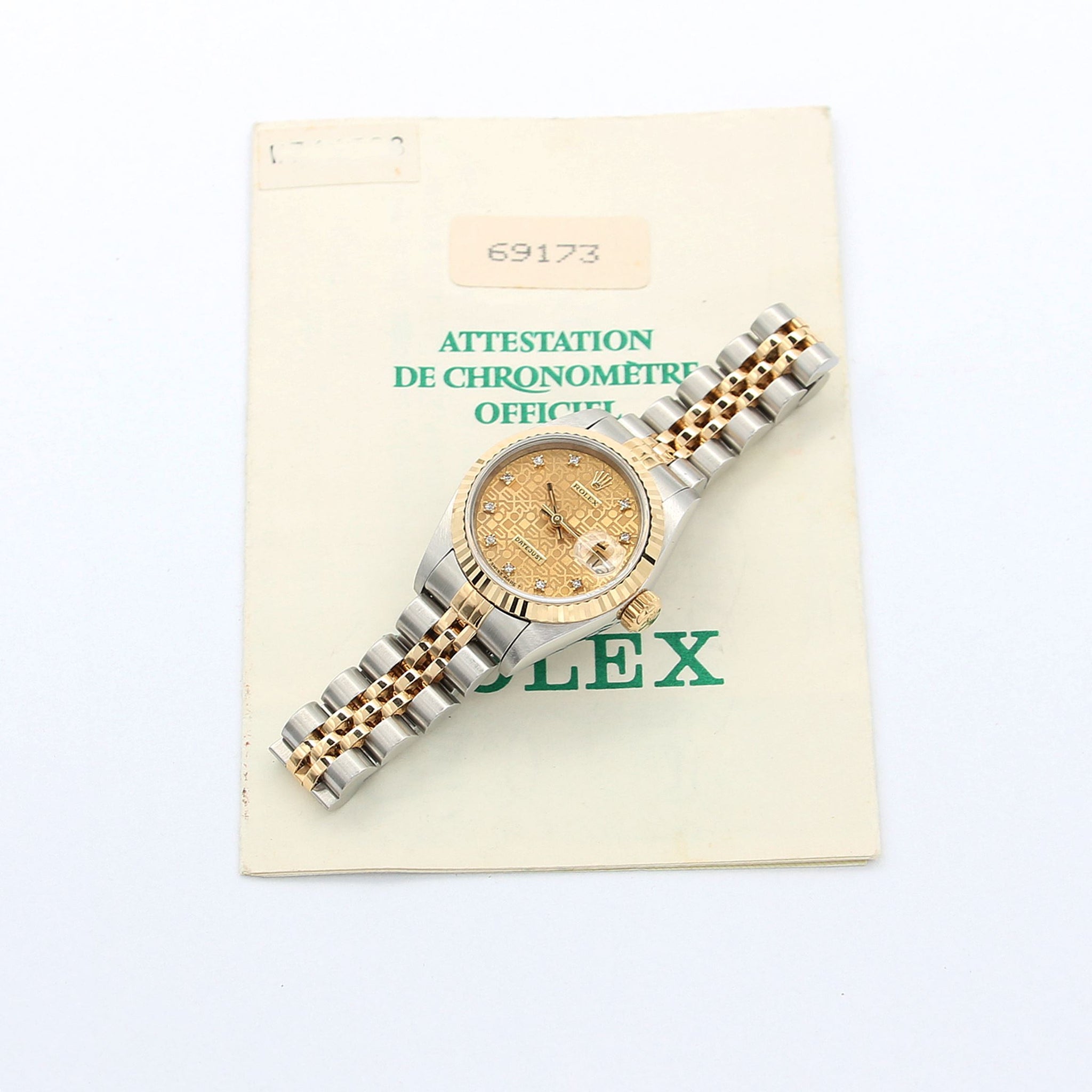 For sale at Debonar Watches: pre-owned Rolex Datejust Lady ref. 69173 on an Jubilee bracelet, full set.