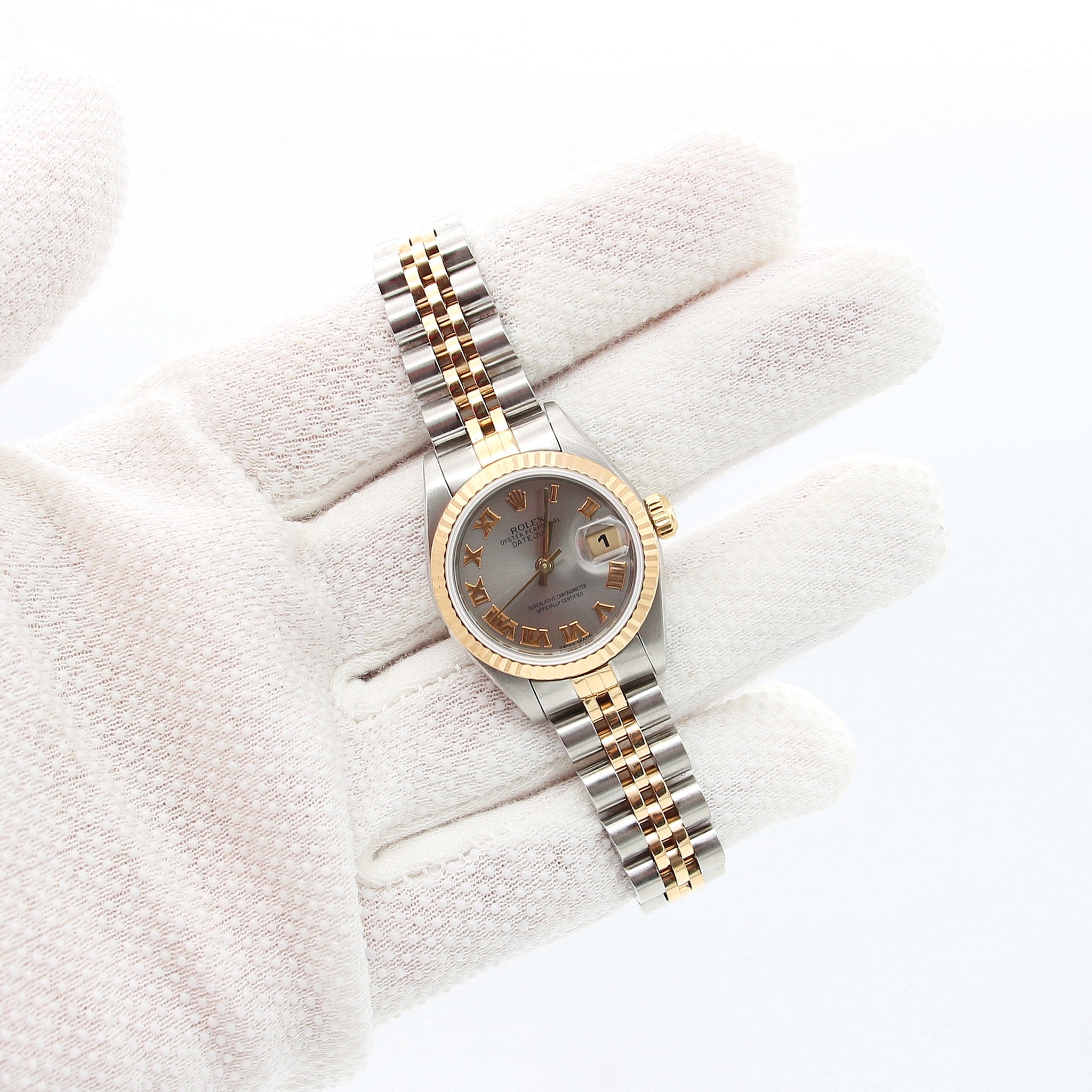 For sale at Debonar Watches: pre-owned Rolex Datejust Lady ref. 69173 from the end of the '90s, with an original Rolex grey dial with roman numbers, full set.