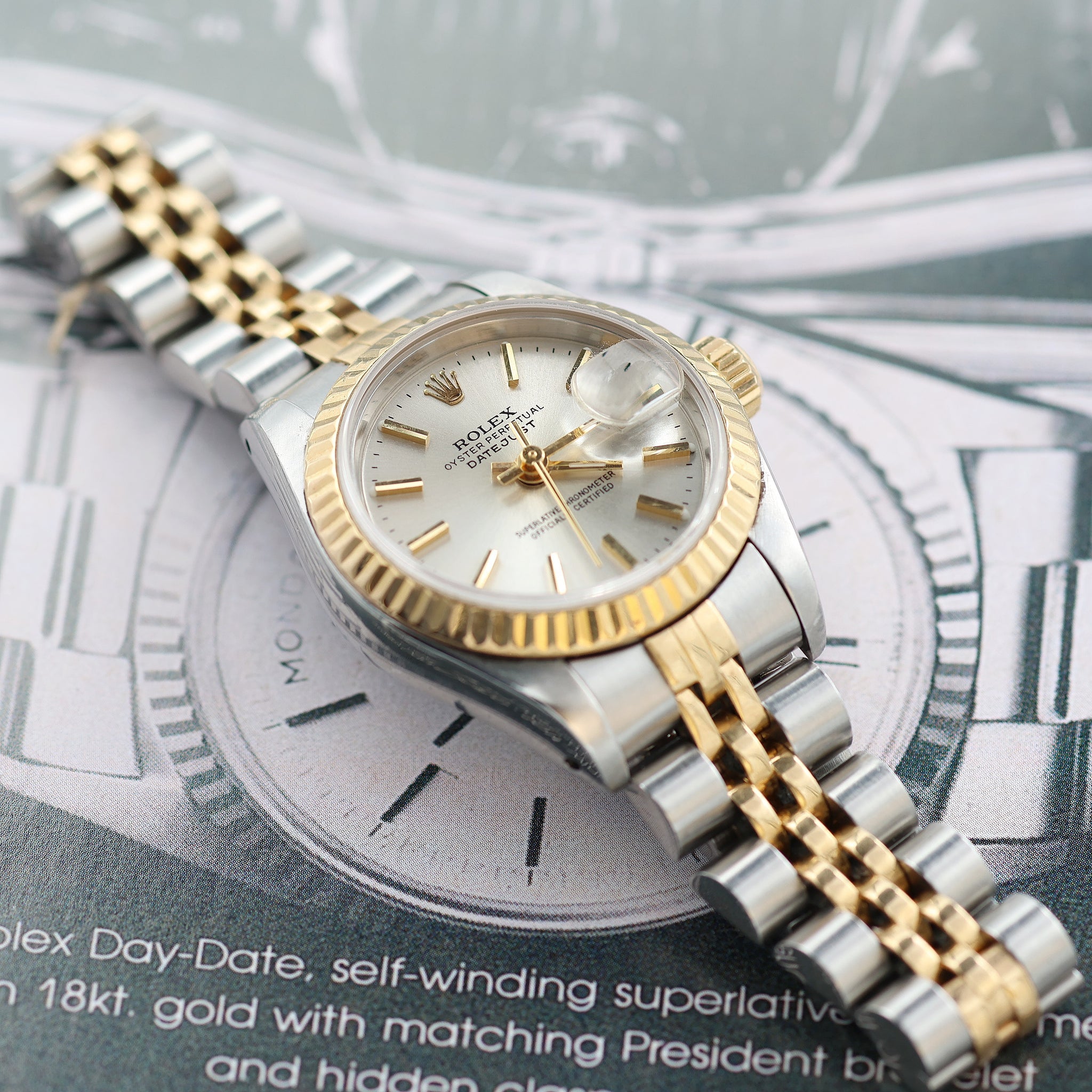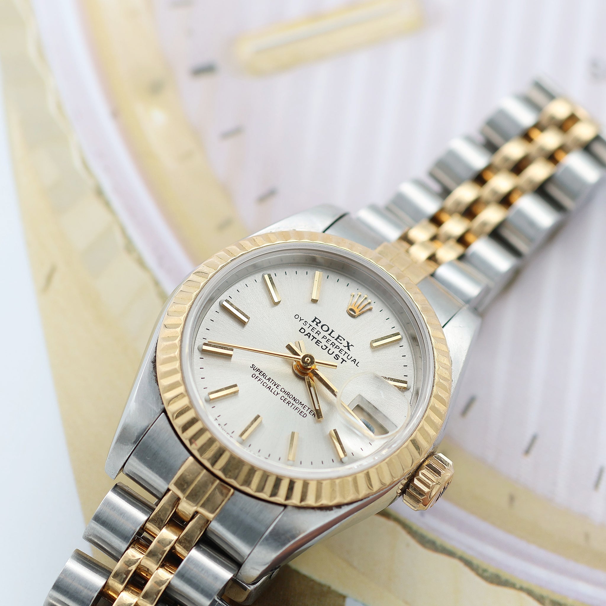 For sale at Debonar Watches: pre-owned Rolex Datejust Lady ref. 69173 from the end of the '90s, with an original Rolex silver dial with golden indexes.