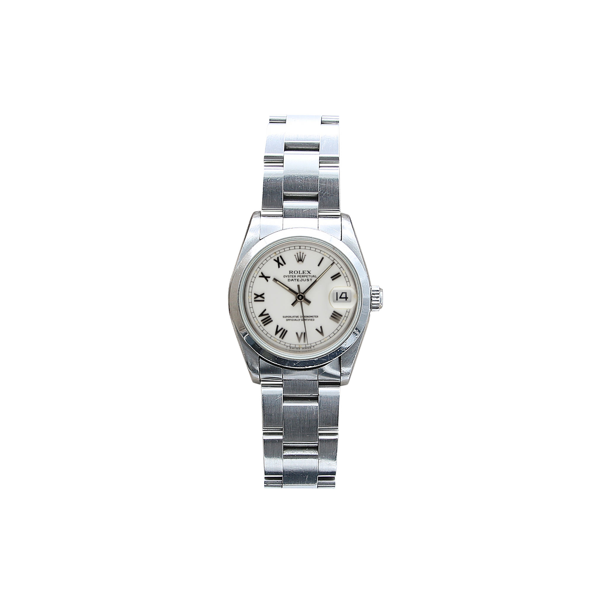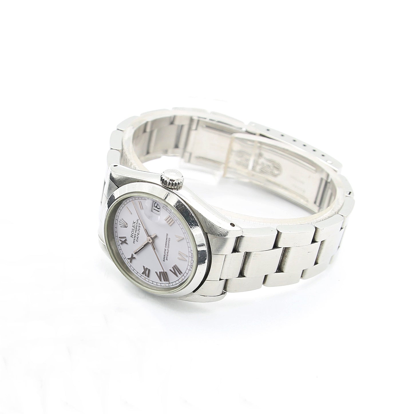 For sale at Debonar Watches: pre-owned Rolex Datejust ref. 68240, with a bright white dial with roman numbers (big) and a domed steel bezel, full set.