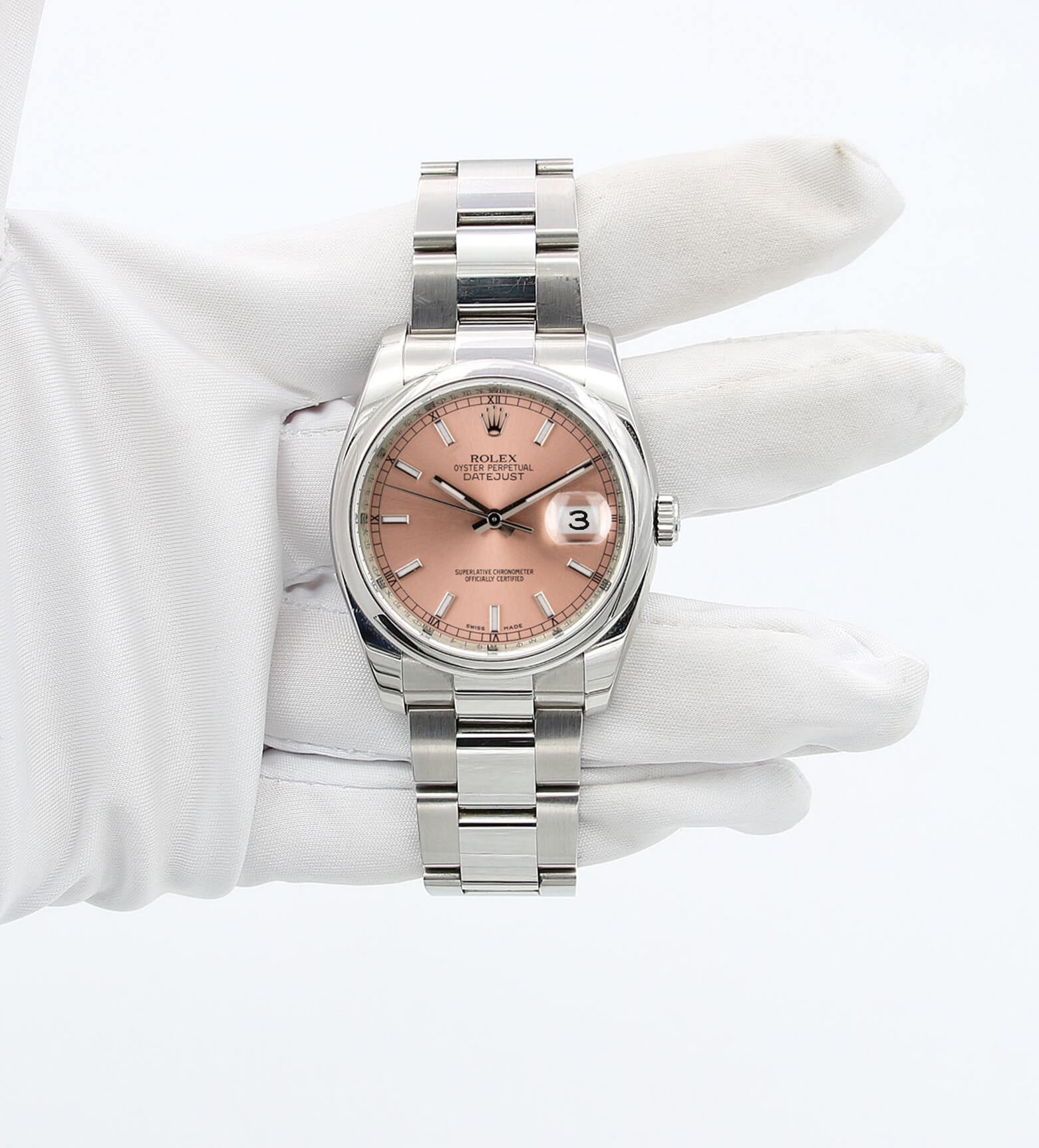 For sale at Debonar Watches: pre-owned Rolex Datejust 116200, in excellent conditions, with a salmon / pink dial and with Warranty Rolex and box.
