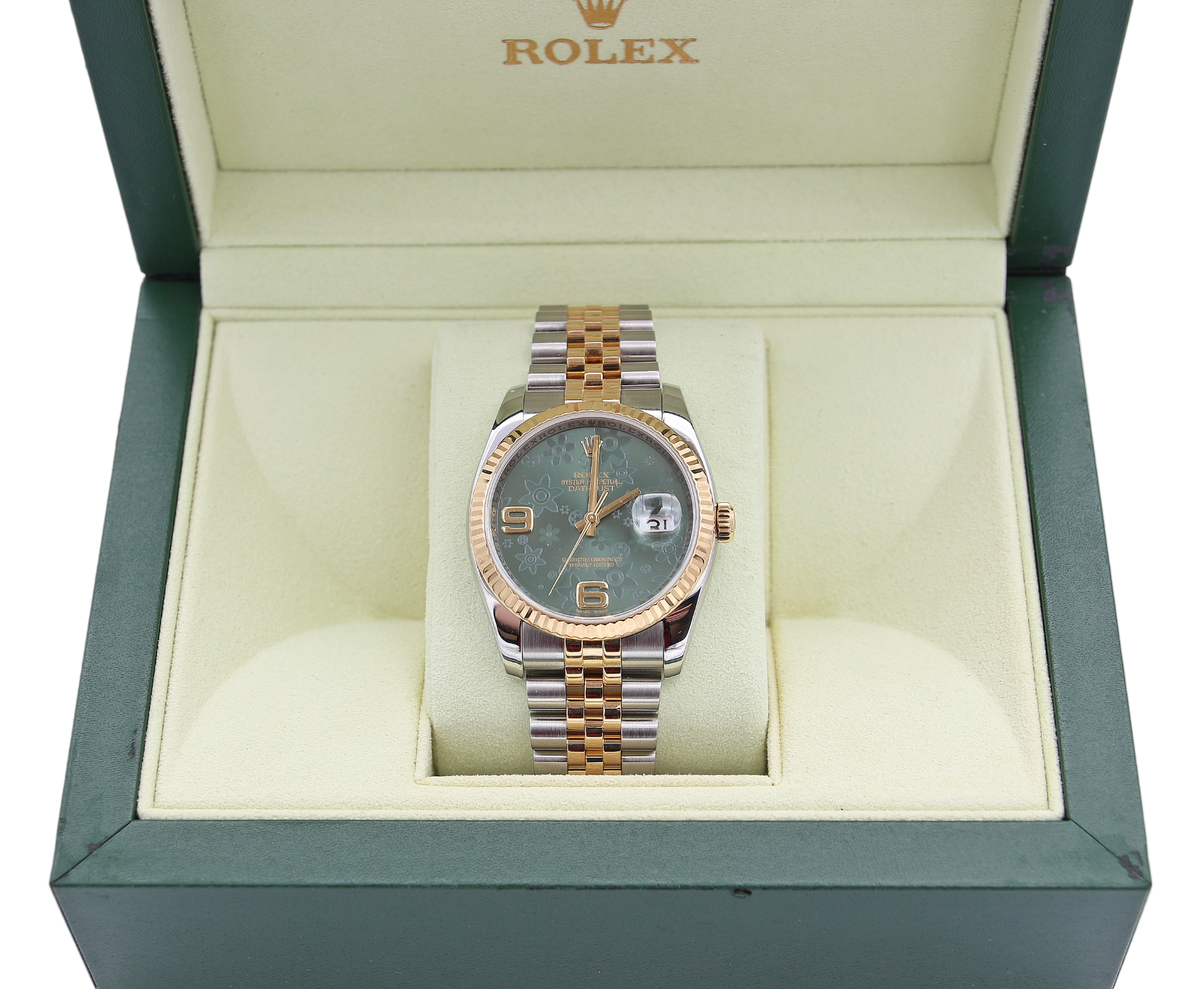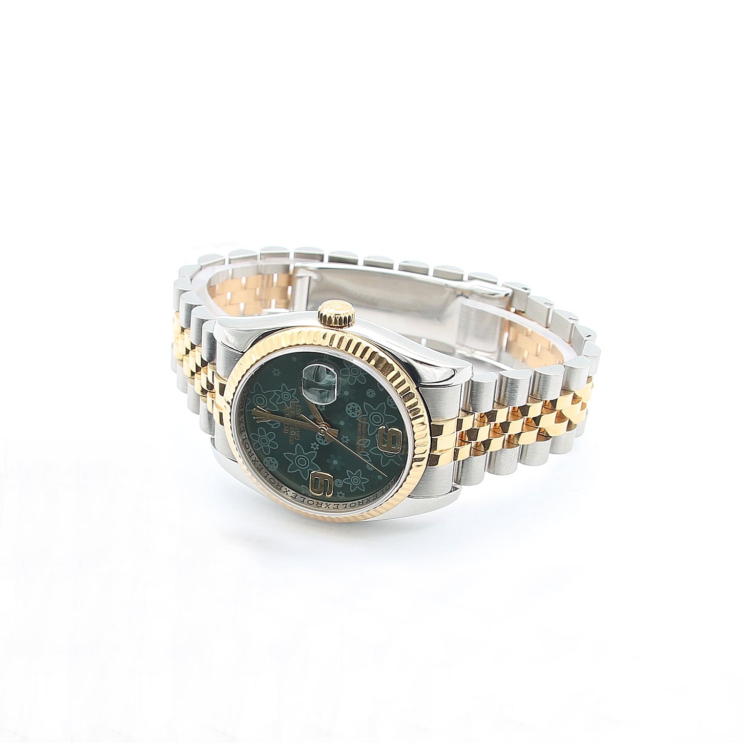 For sale at Debonar Watches: pre-owned Rolex Datejust 116233, in excellent conditions, with a peculiar green dial with flowers, full set.