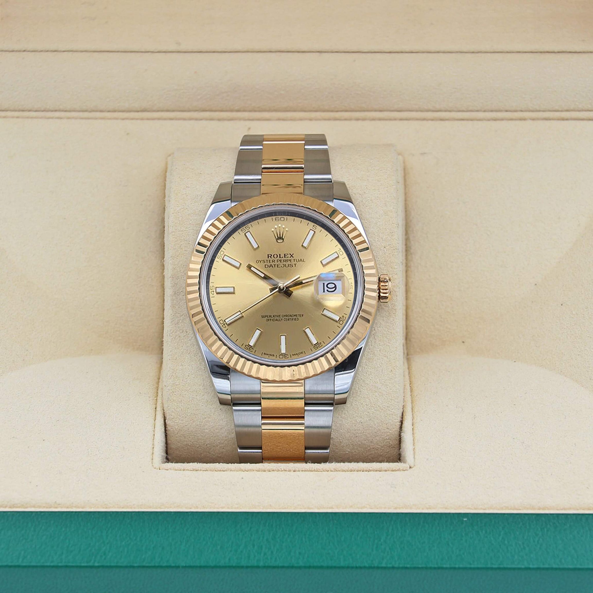 This Datejust comes with a stainless steel and yellow gold fluted bezel (the most recognizable feature of the Rolex Datejust) and a yellow gold size case 41mm.