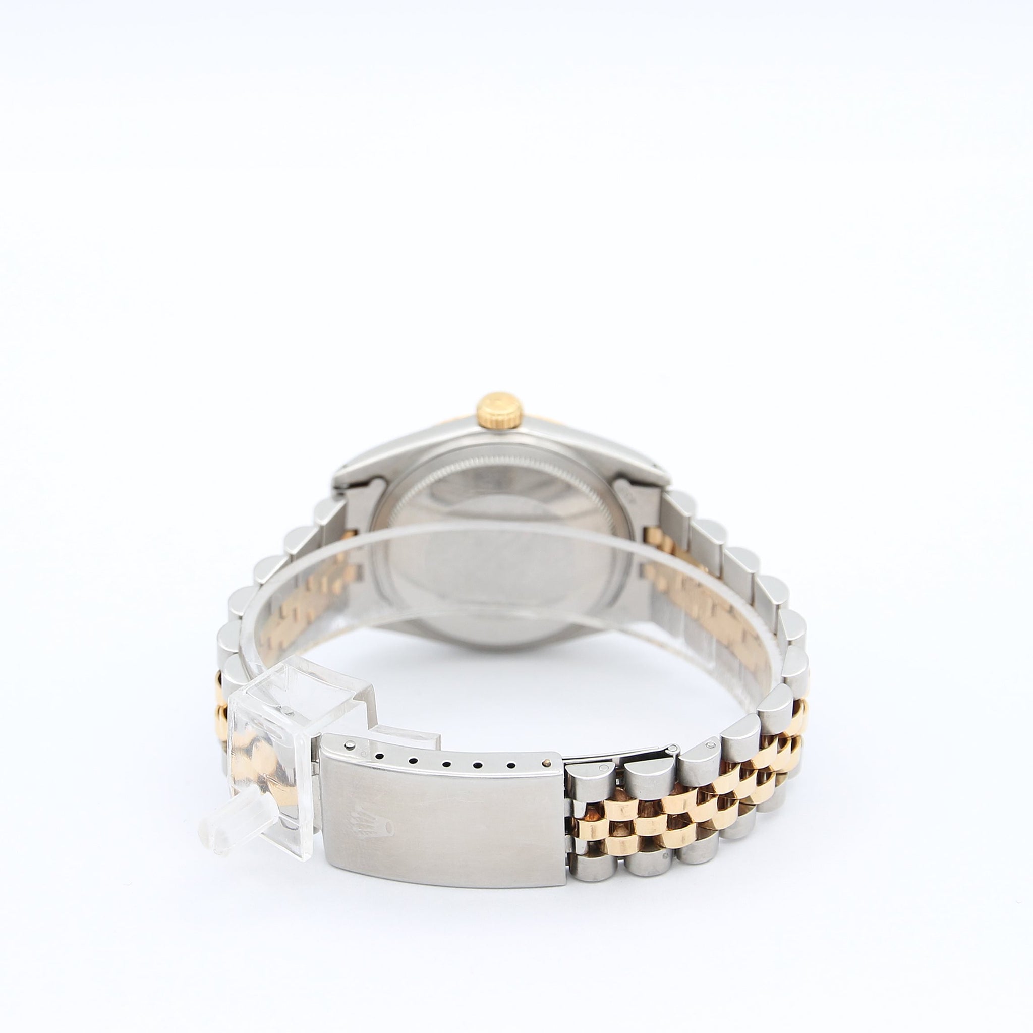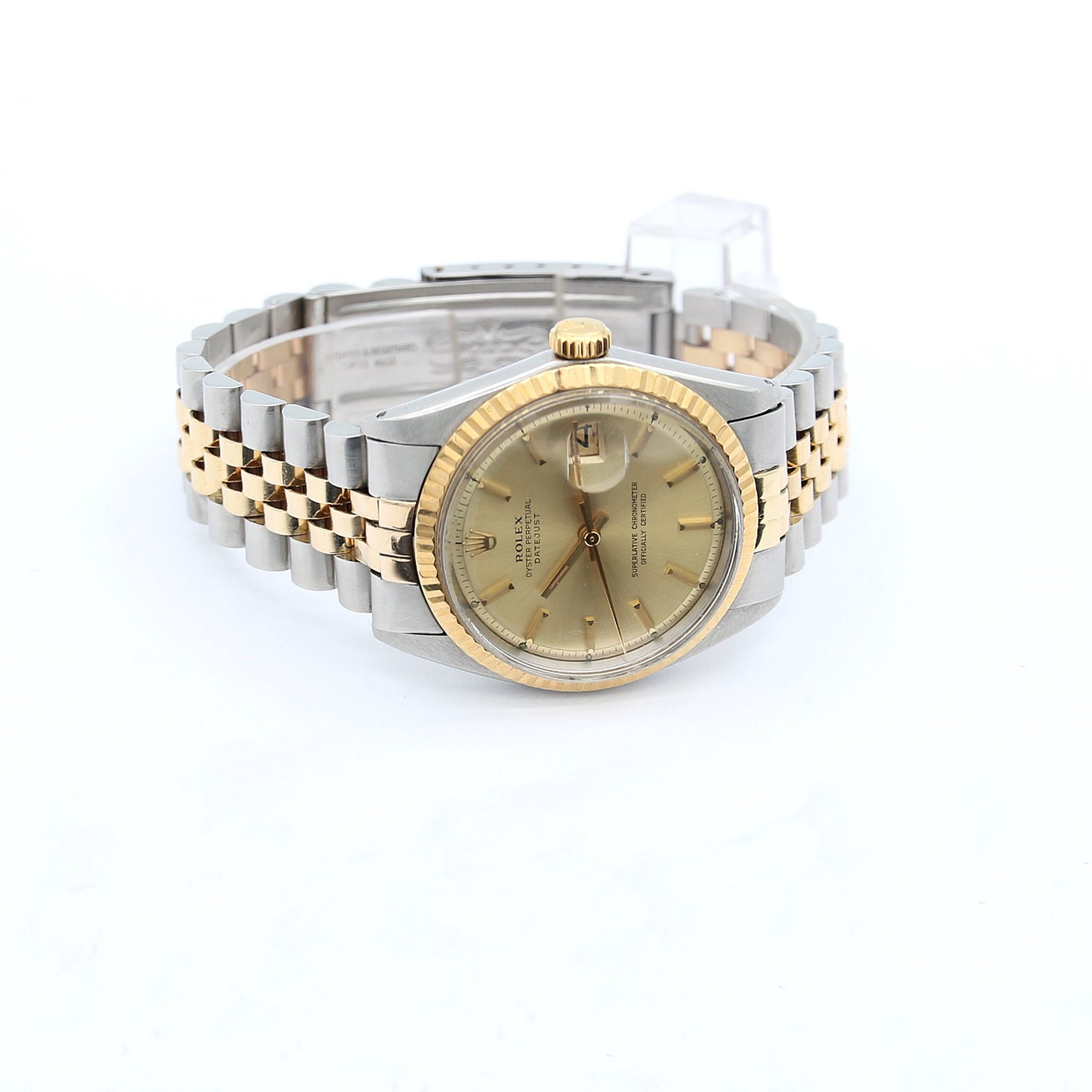 This Rolex has all the signature aesthetics of a Datejust, which include a fluted bezel, baton hour markers, and the Cyclops magnifying bubble over the date window.