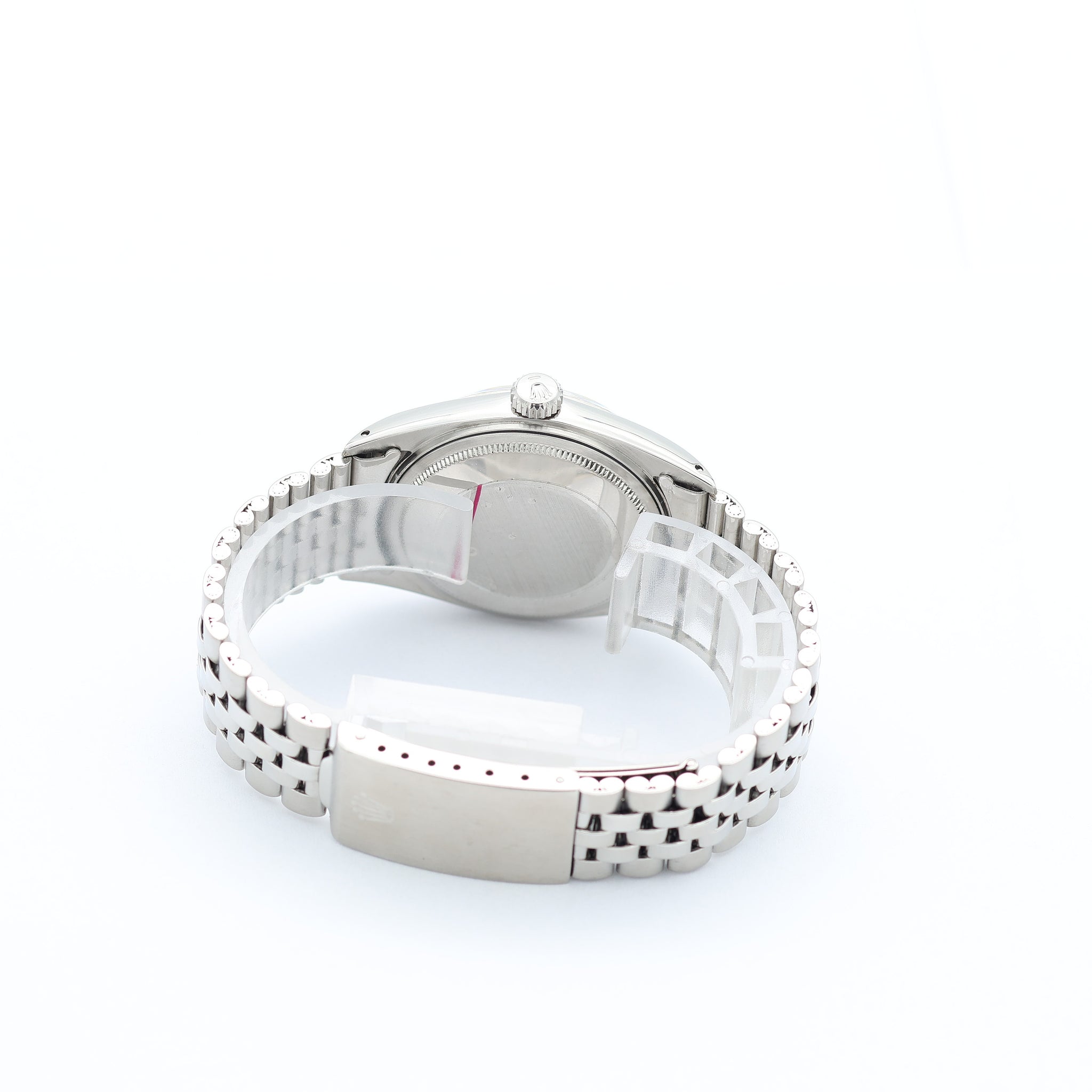 This Rolex has all the signature aesthetics of a Datejust, which include a fluted bezel, baton hour markers, and the Cyclops magnifying bubble over the date window.