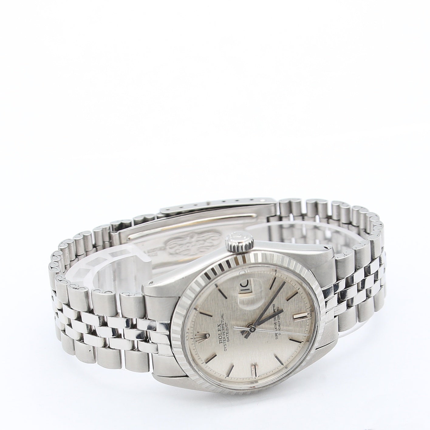 For sale at Debonar Watches: pre-owned Rolex Datejust ref. 1603 in steel with a beautiful silver "linen" dial and Jubilee bracelet, full set.