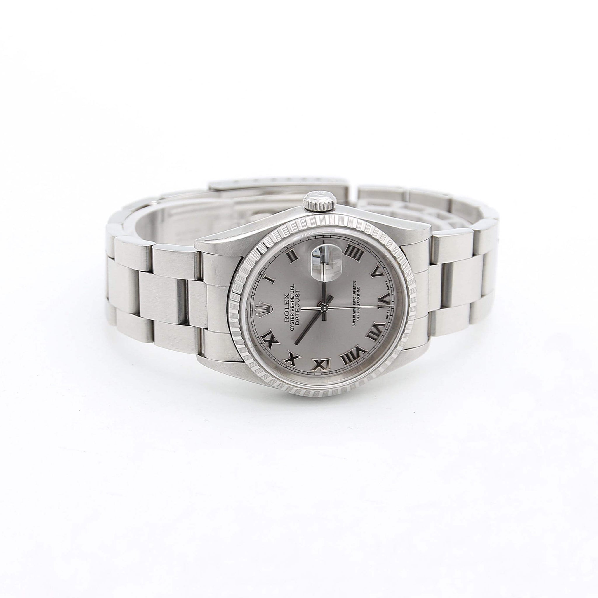 This Rolex Datejust 16220 presents a modern grey dial with roman numbers.