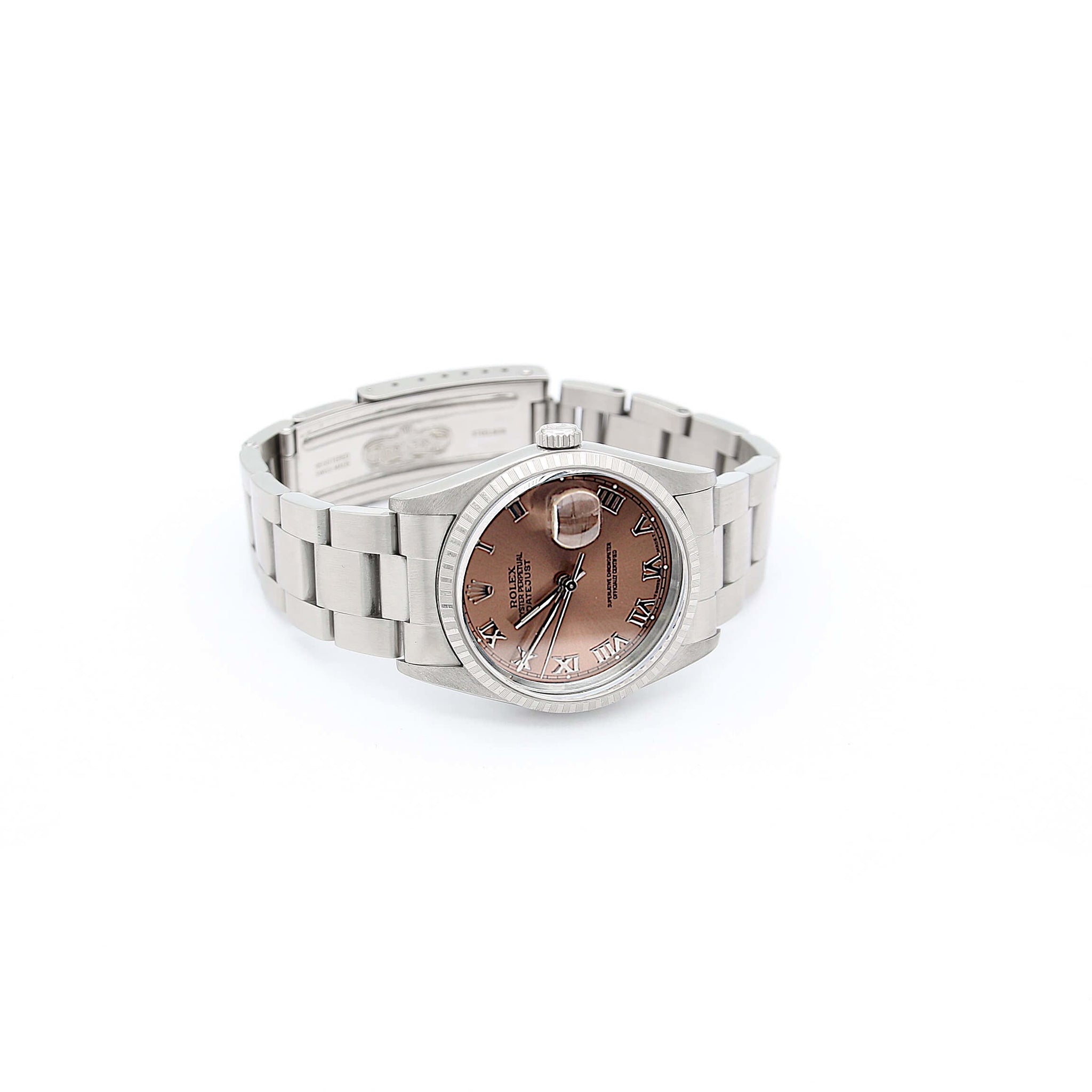 This Rolex Datejust 16220 presents a spectacular salmon dial with roman numbers.