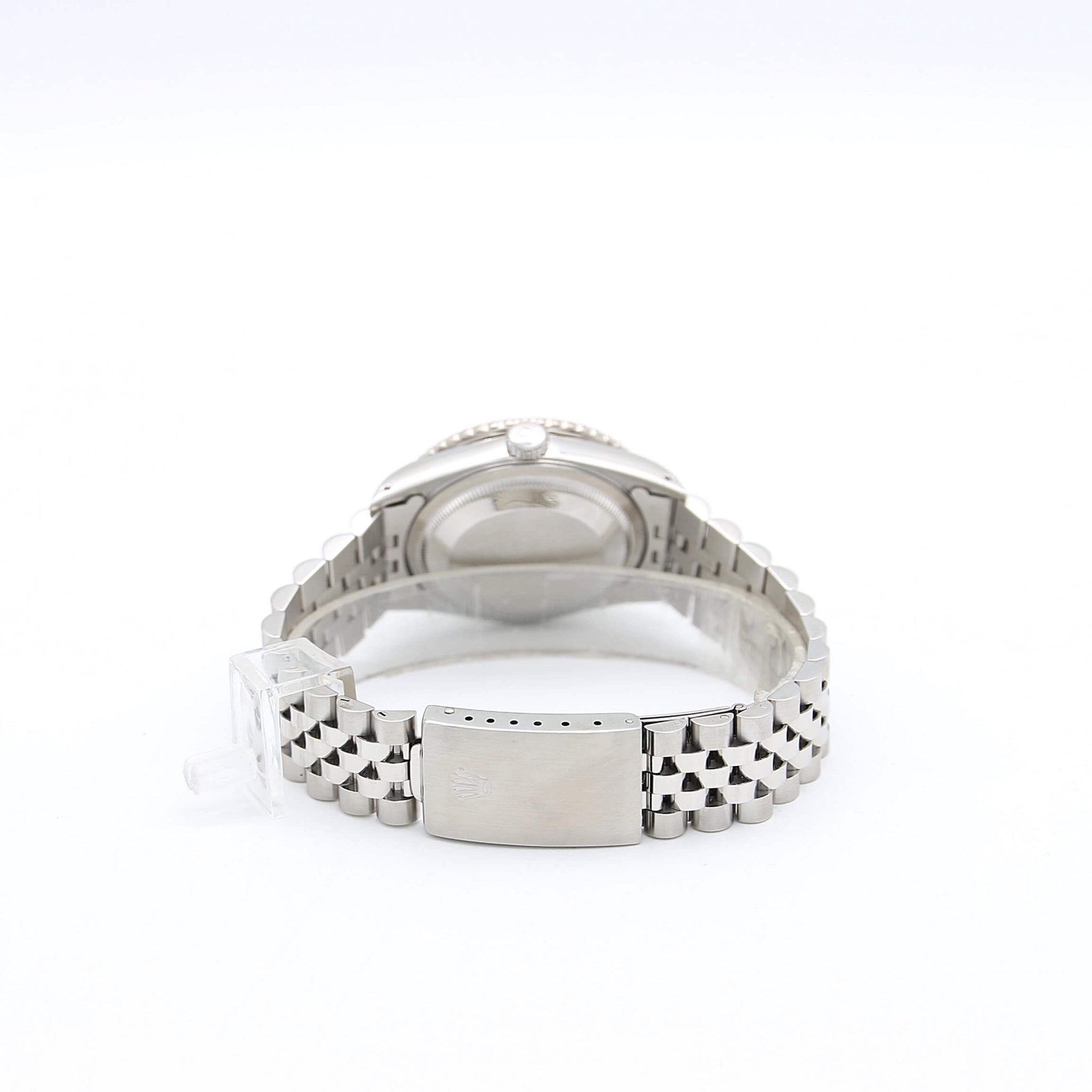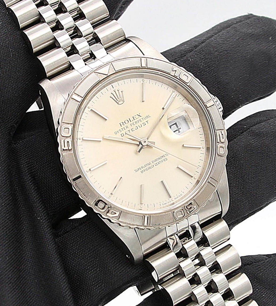 This Rolex Datejust Turn-O-Graph is a striking tribute to the original 1953 model, and a military homage. This Rolex Datejust 16264 captures the classic elements of the 1950s original. Its engine-turned bezel with the bidirectional rotating unit and the classic Jubilee bracelet are a powerful and versatile combination.