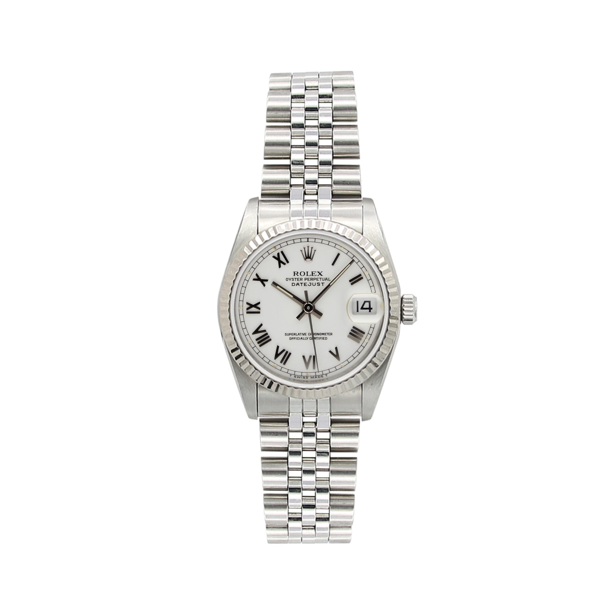 For sale a pre-owned Rolex Oyster Perpetual Datejust reference 68274 watch in steel and white gold. The time is displayed on an elegant white dial with roman numbers.