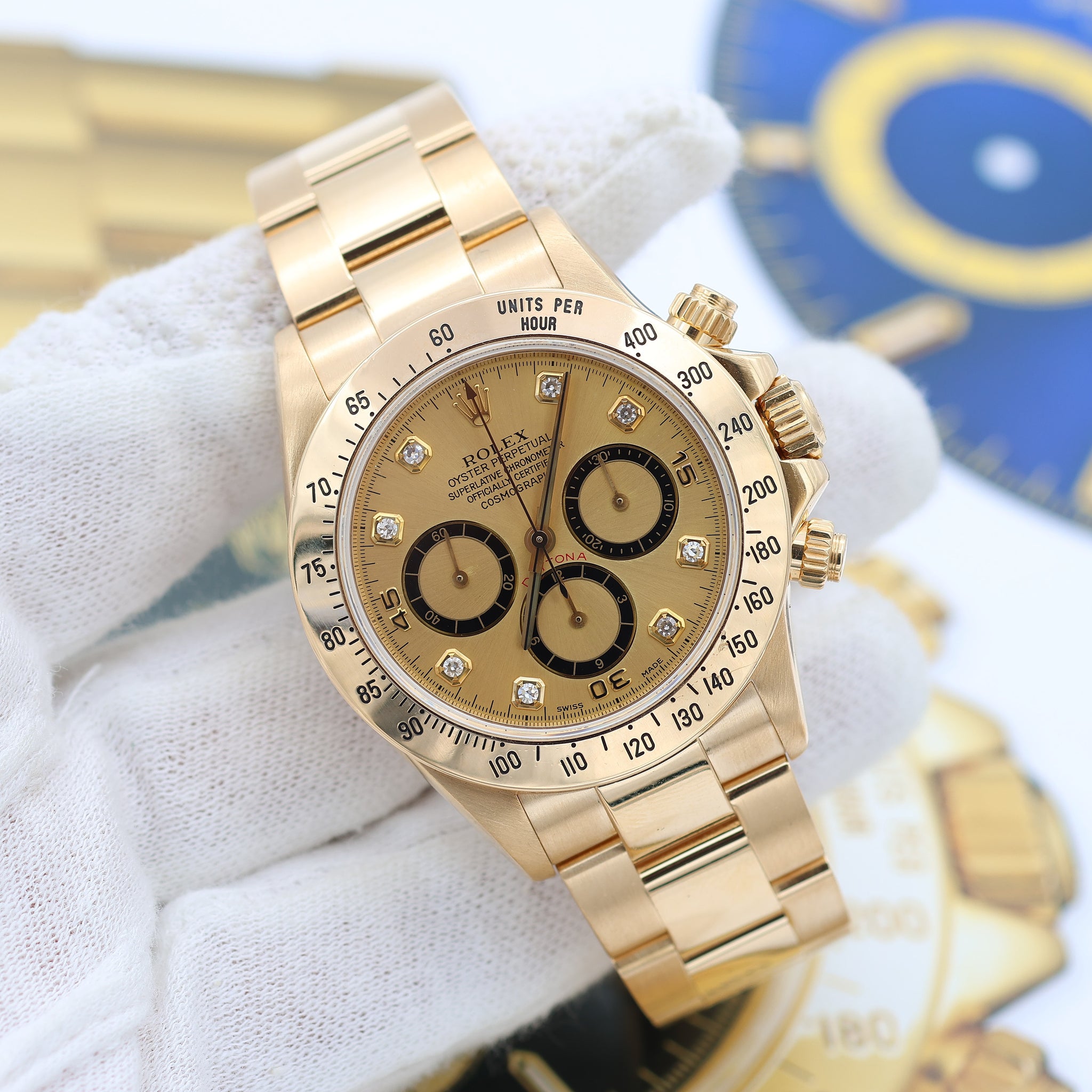 This model showcases a stunning champagne dial set with factory diamond hour markers, delivering a striking balance of refinement and sportiness. The contrasting black sub-dials ensure excellent readability, while the tachymeter bezel highlights the Daytona’s motorsport DNA.