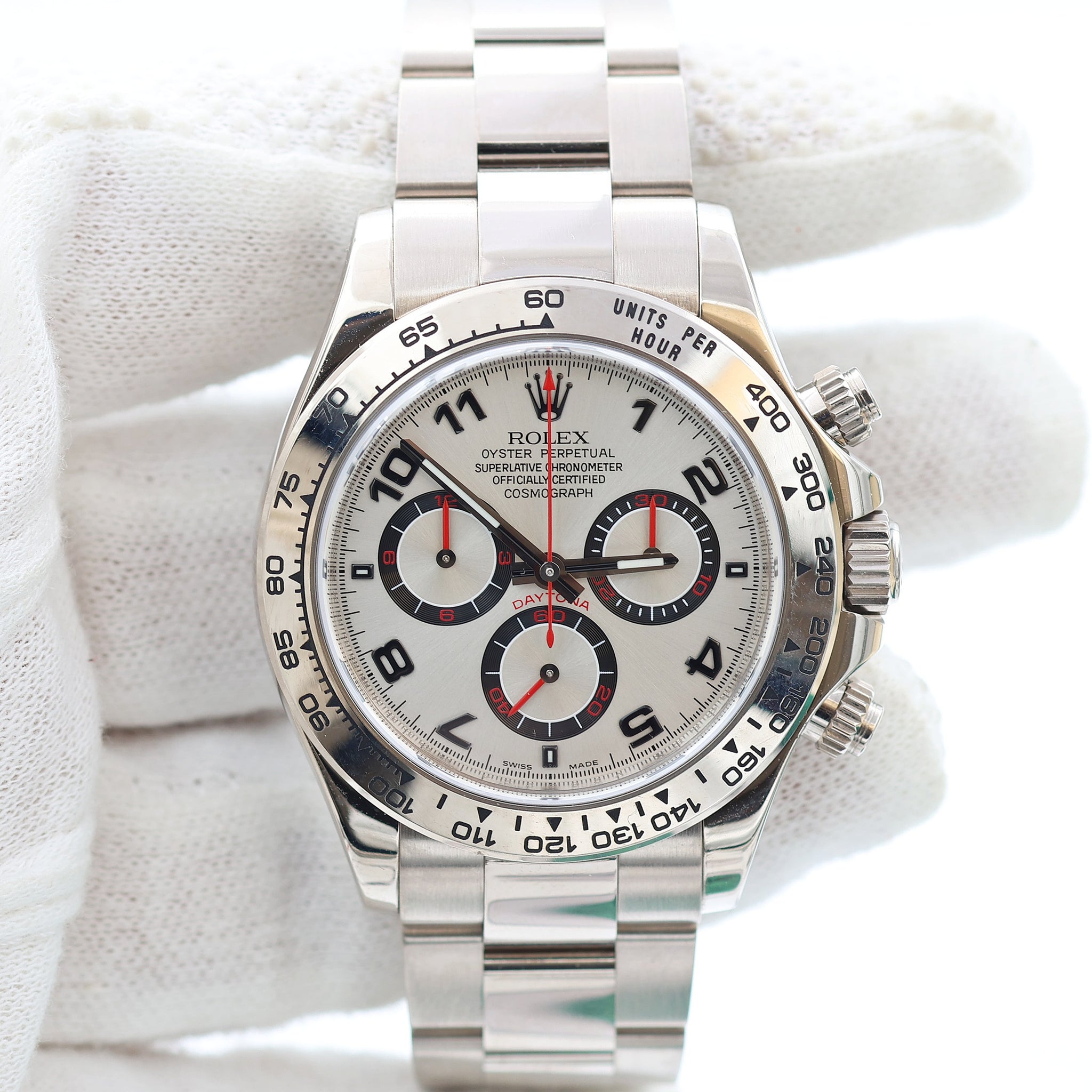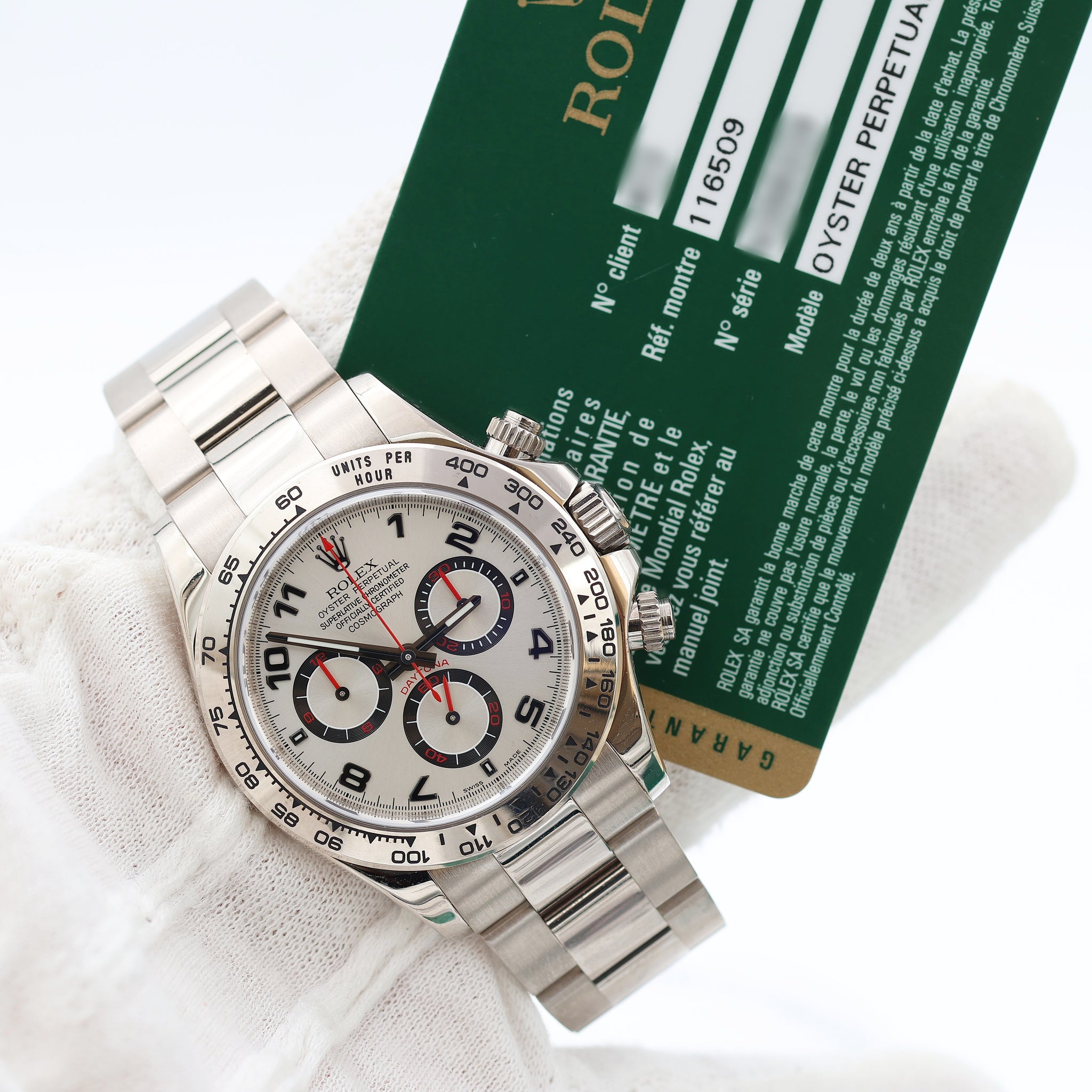 Shortly after the release of the first batch of Daytona watches with in-house movements, Rolex added the full white gold Daytona 116509 to the range in 2004, complete with a white gold Oyster bracelet.