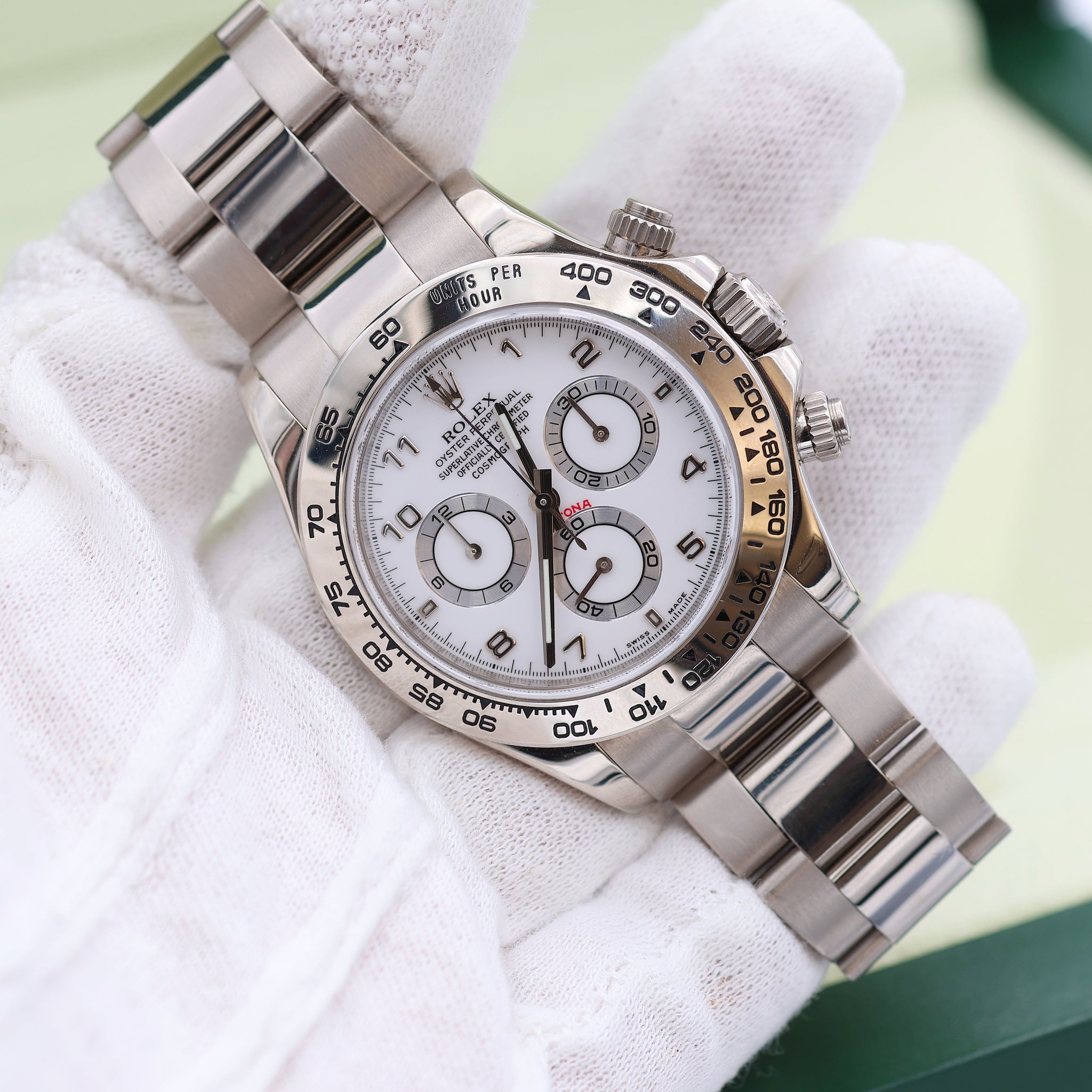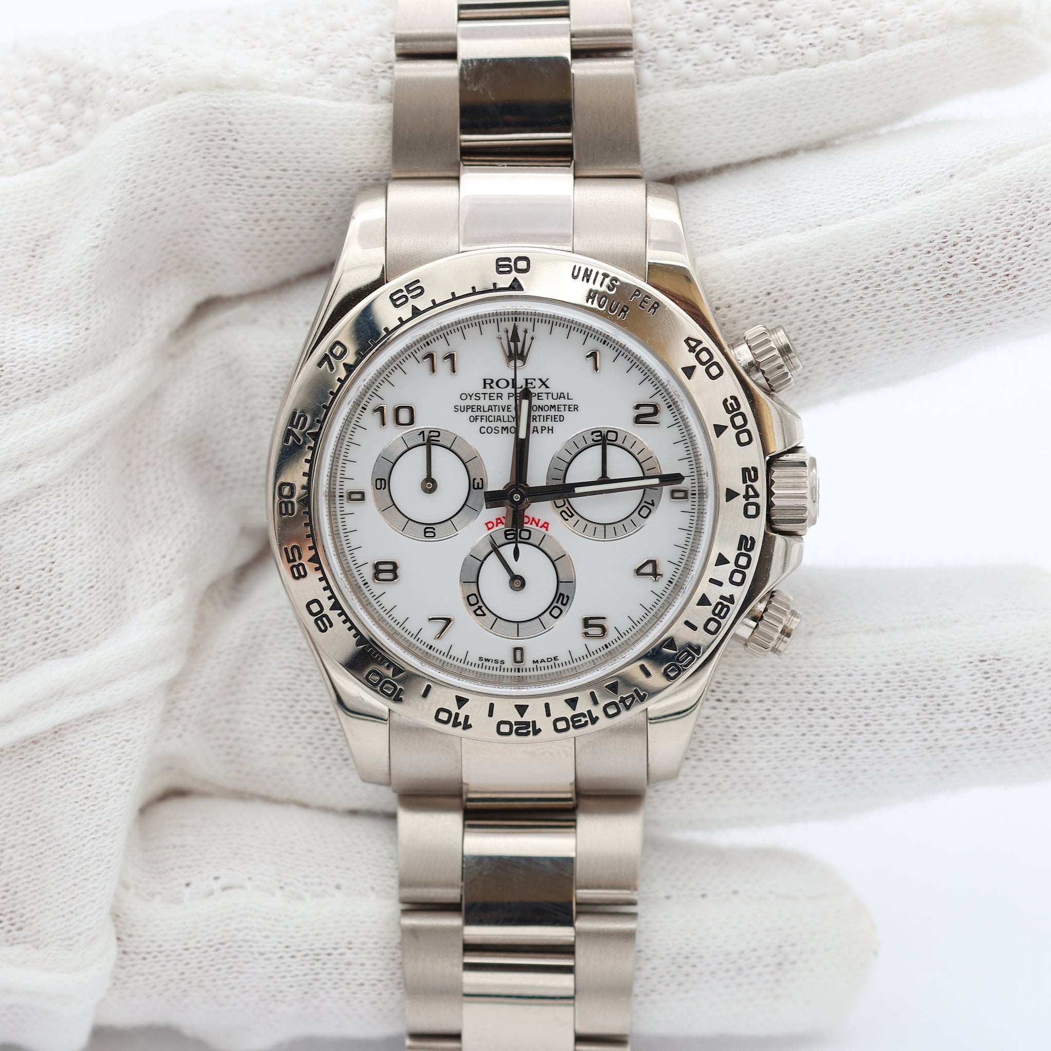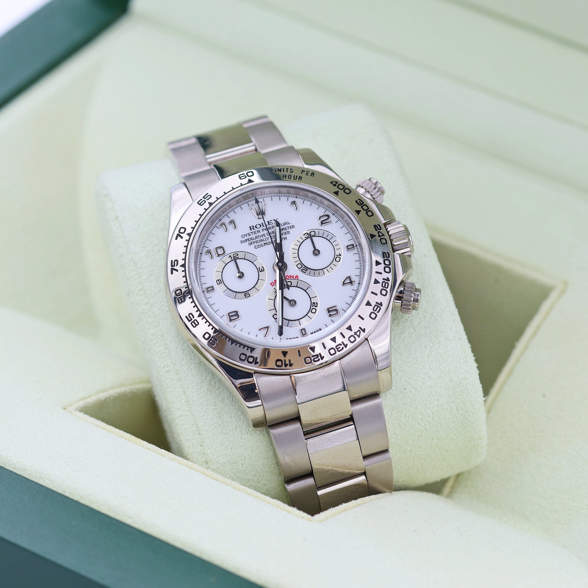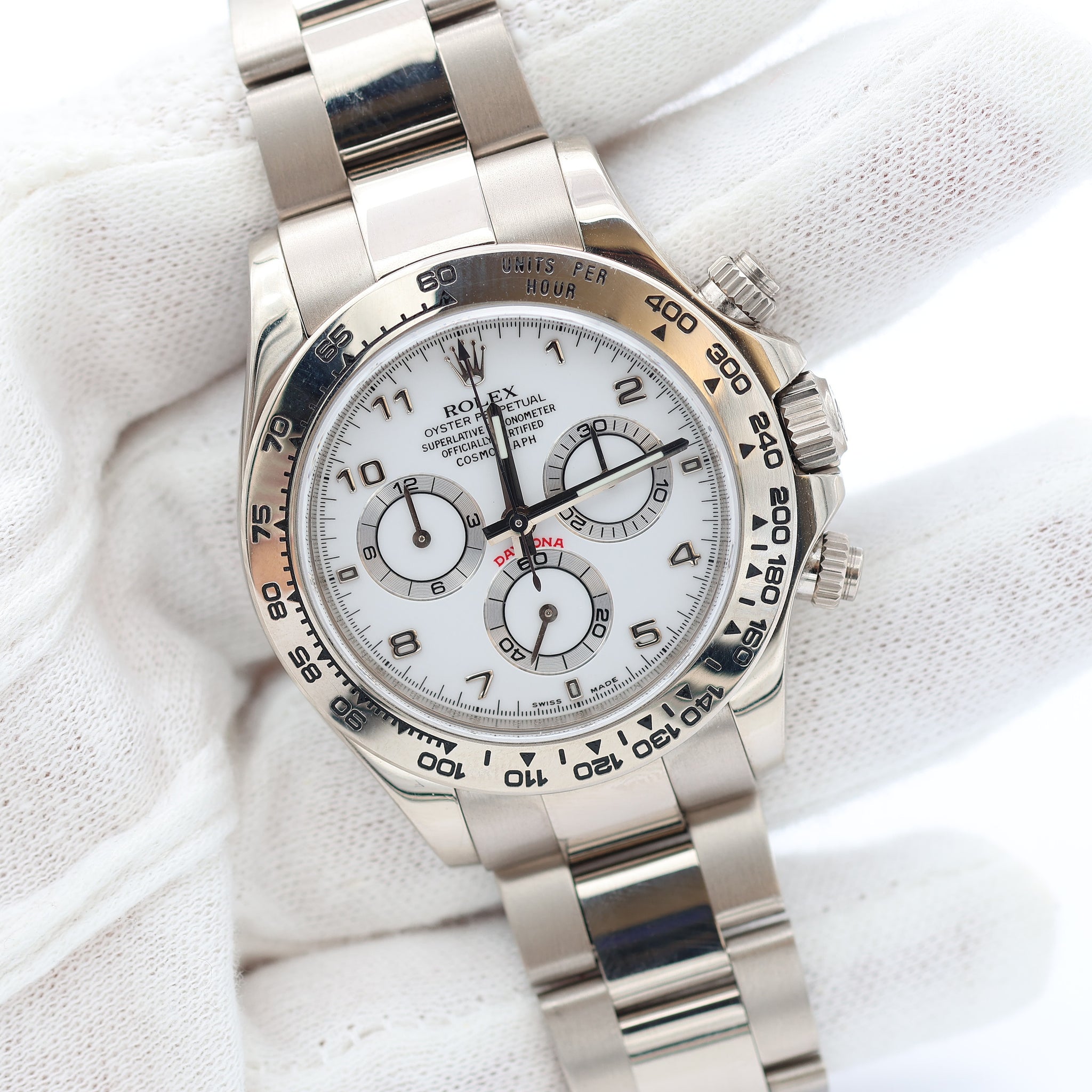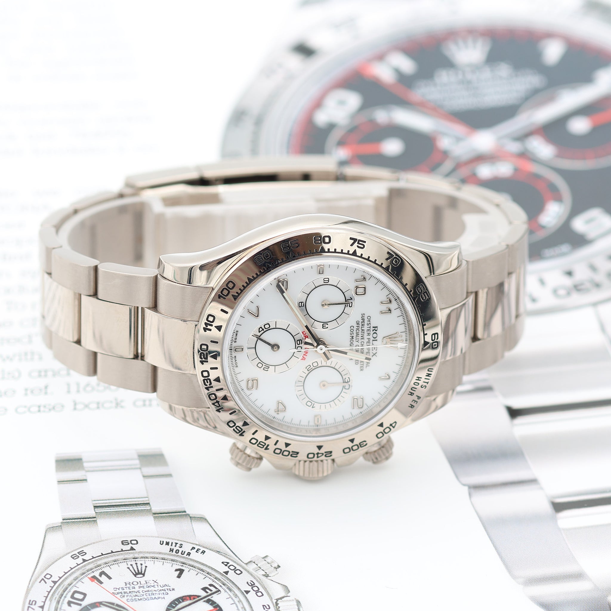 Shortly after the release of the first batch of Daytona watches with in-house movements, Rolex added the full white gold Daytona 116509 to the range in 2004, complete with a white gold Oyster bracelet.