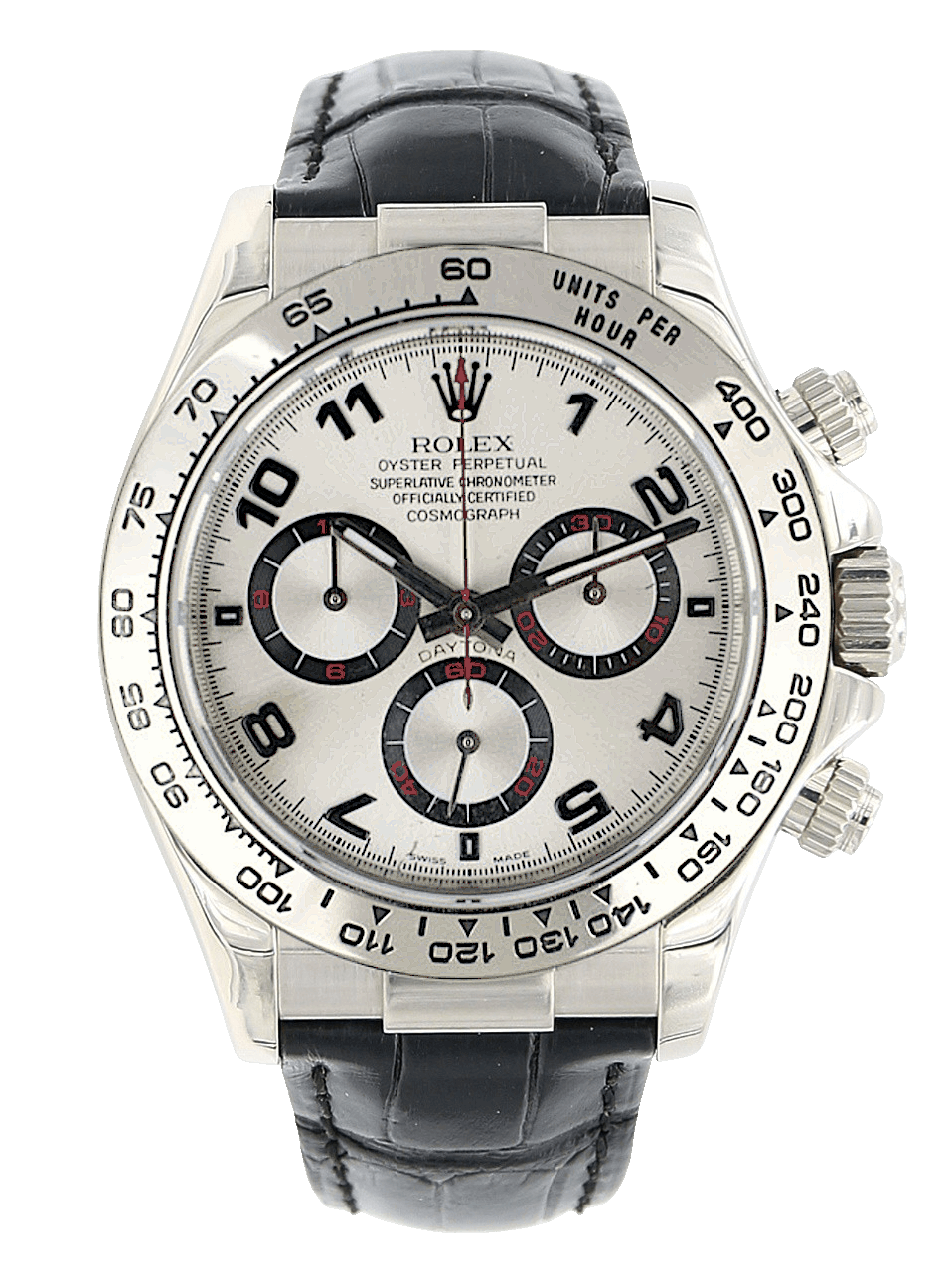 This Oyster Perpetual Cosmograph Daytona in 18 ct white gold with Steel and silver dial with arabic numbers, featuring a Cerachrom bezel with tachymetric scale.