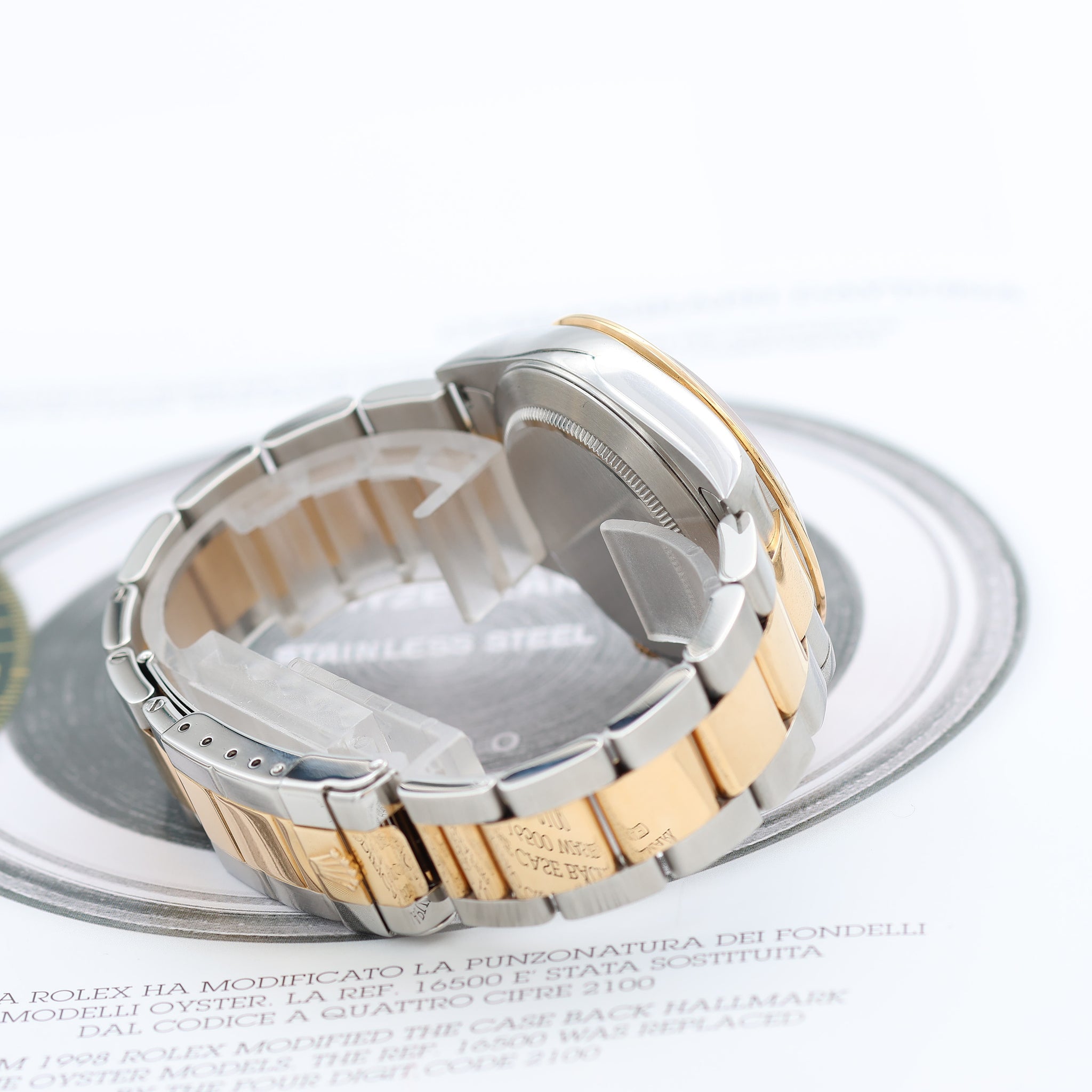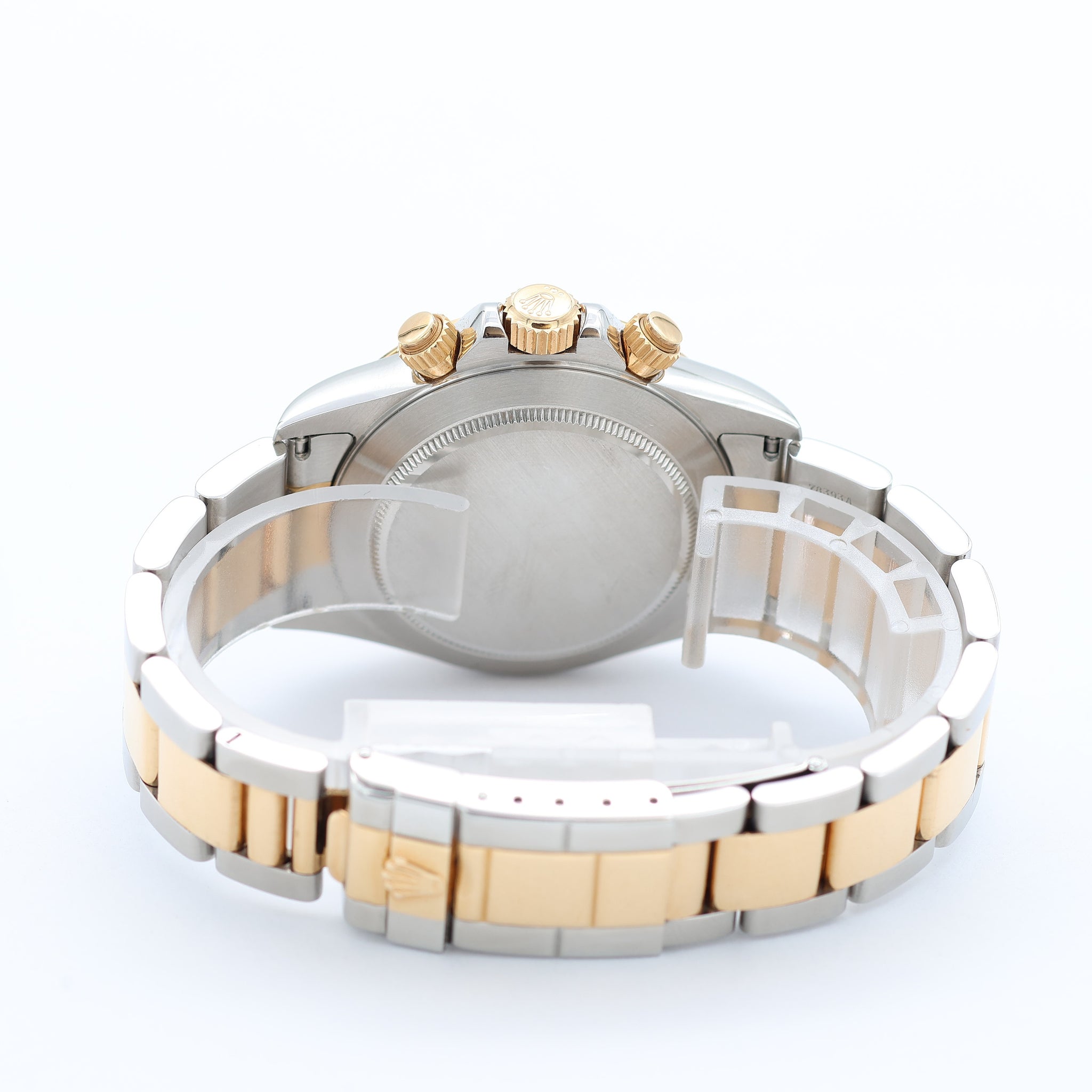 This Zenith powered Rolex Daytona features a 40mm stainless steel case with an 18k yellow gold bezel surrounding a gold dial on a Rolex 904L stainless steel and 18k yellow gold Oyster bracelet with folding buckle.