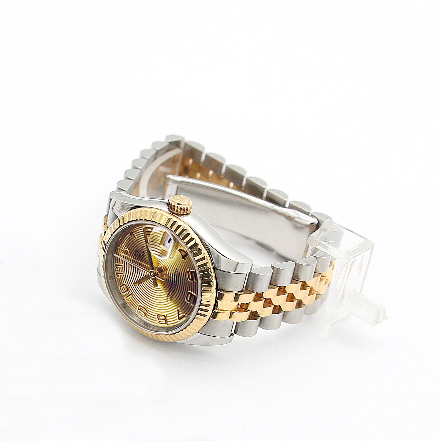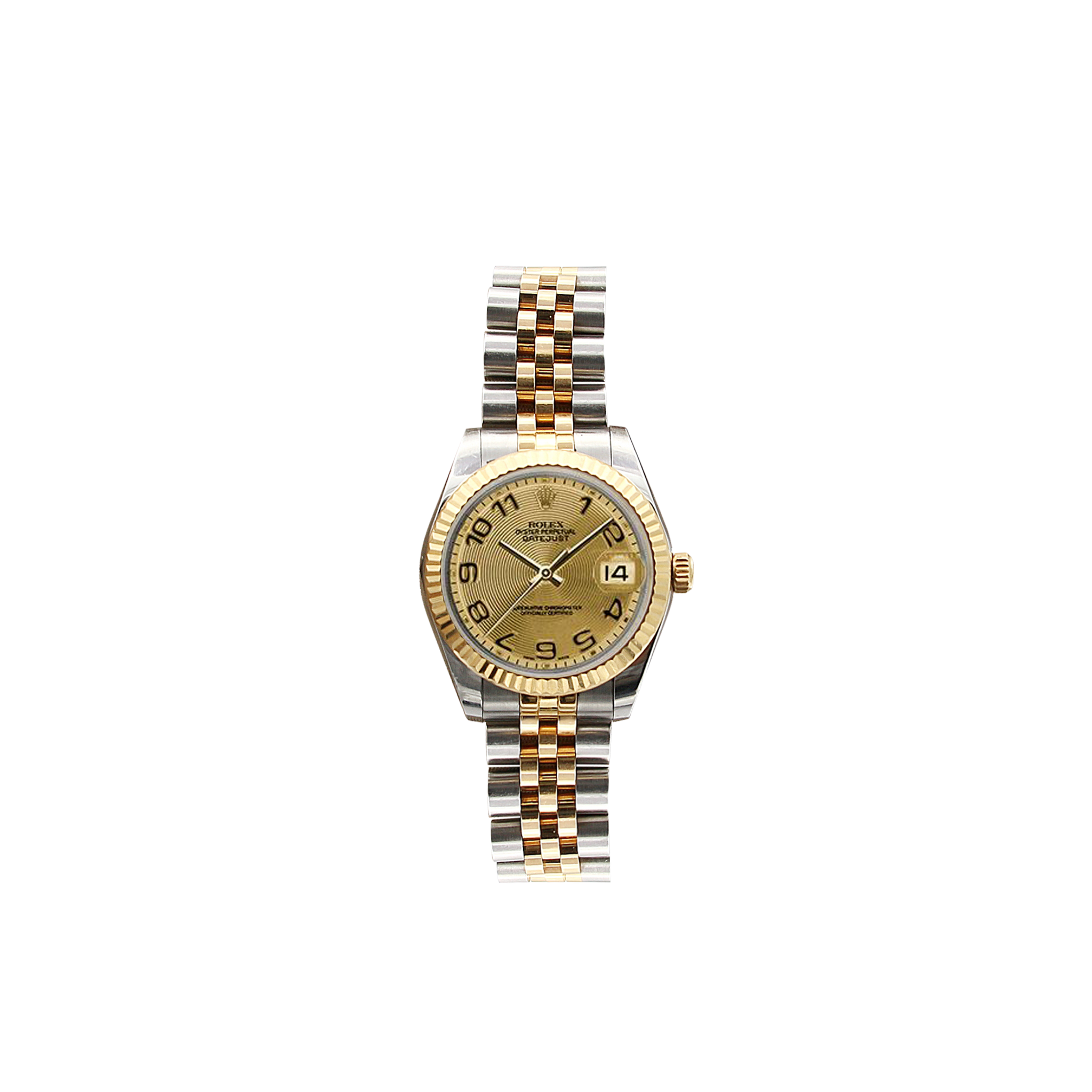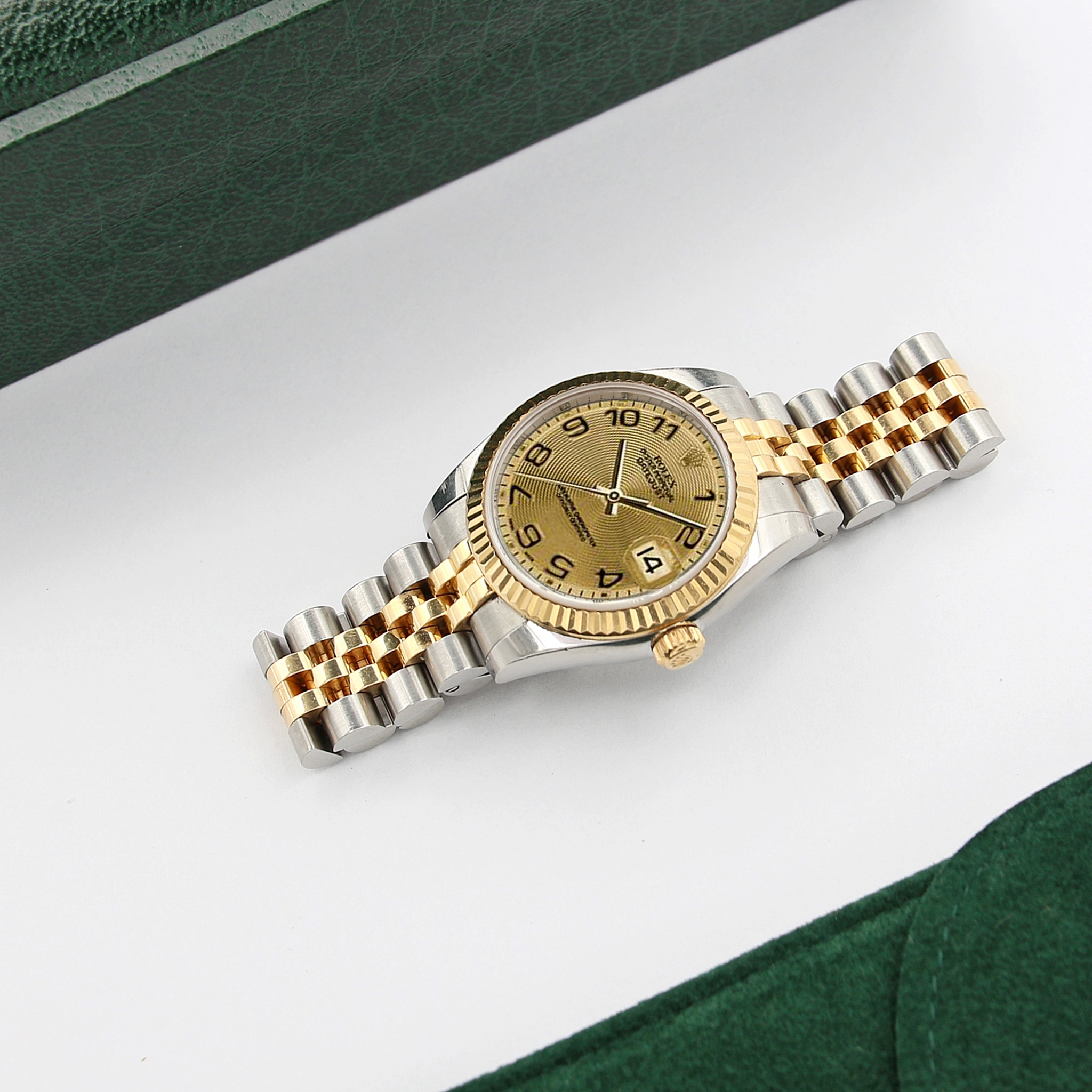 This pre-owned Rolex Lady-Datejust Ref. 178273, with a 31mm Oystersteel and yellow gold case, fluted yellow gold bezel, champagne dial with concentric pattern and date indicator at 3 o'clock, sapphire crystal, automatic movement calibre 2235. Oystersteel and yellow gold bracelet with folding clasp.