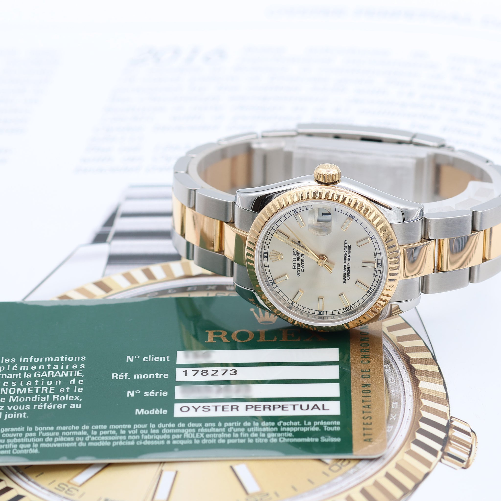 This pre-owned Rolex Lady-Datejust Ref. 178273, with a 31mm Oystersteel and yellow gold case, fluted yellow gold bezel, silver and date indicator at 3 o'clock, sapphire crystal, automatic movement calibre 2235. Oystersteel and yellow gold bracelet with folding clasp.