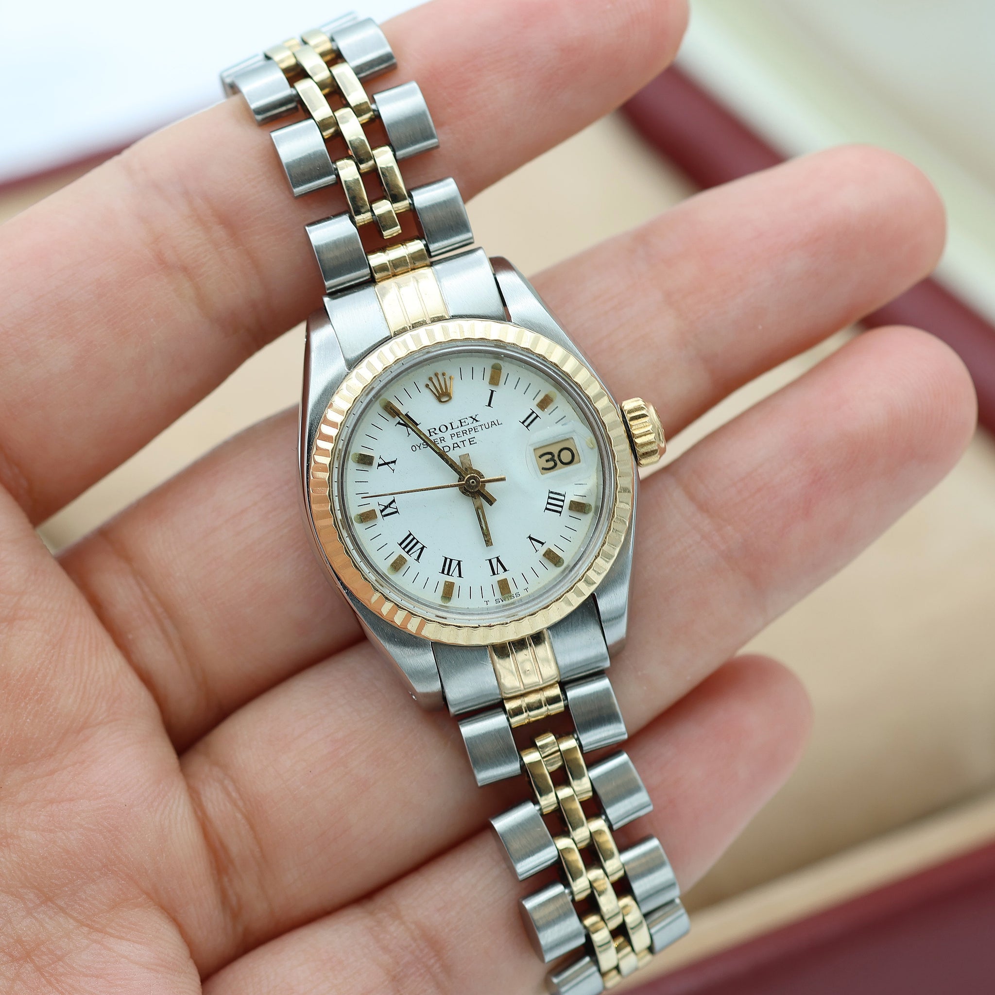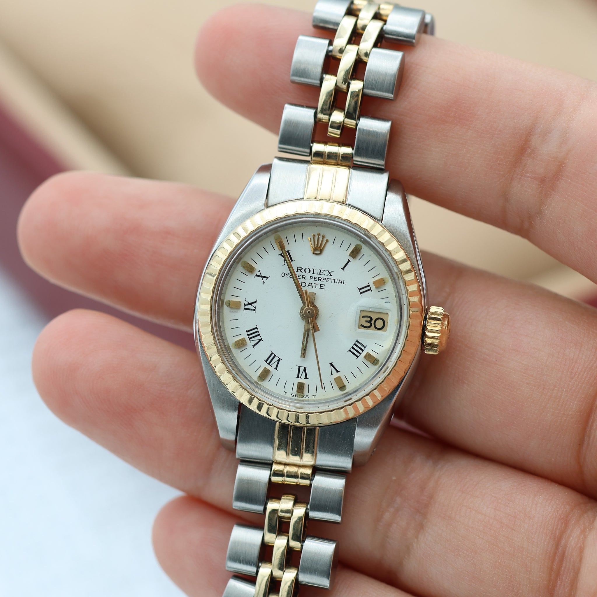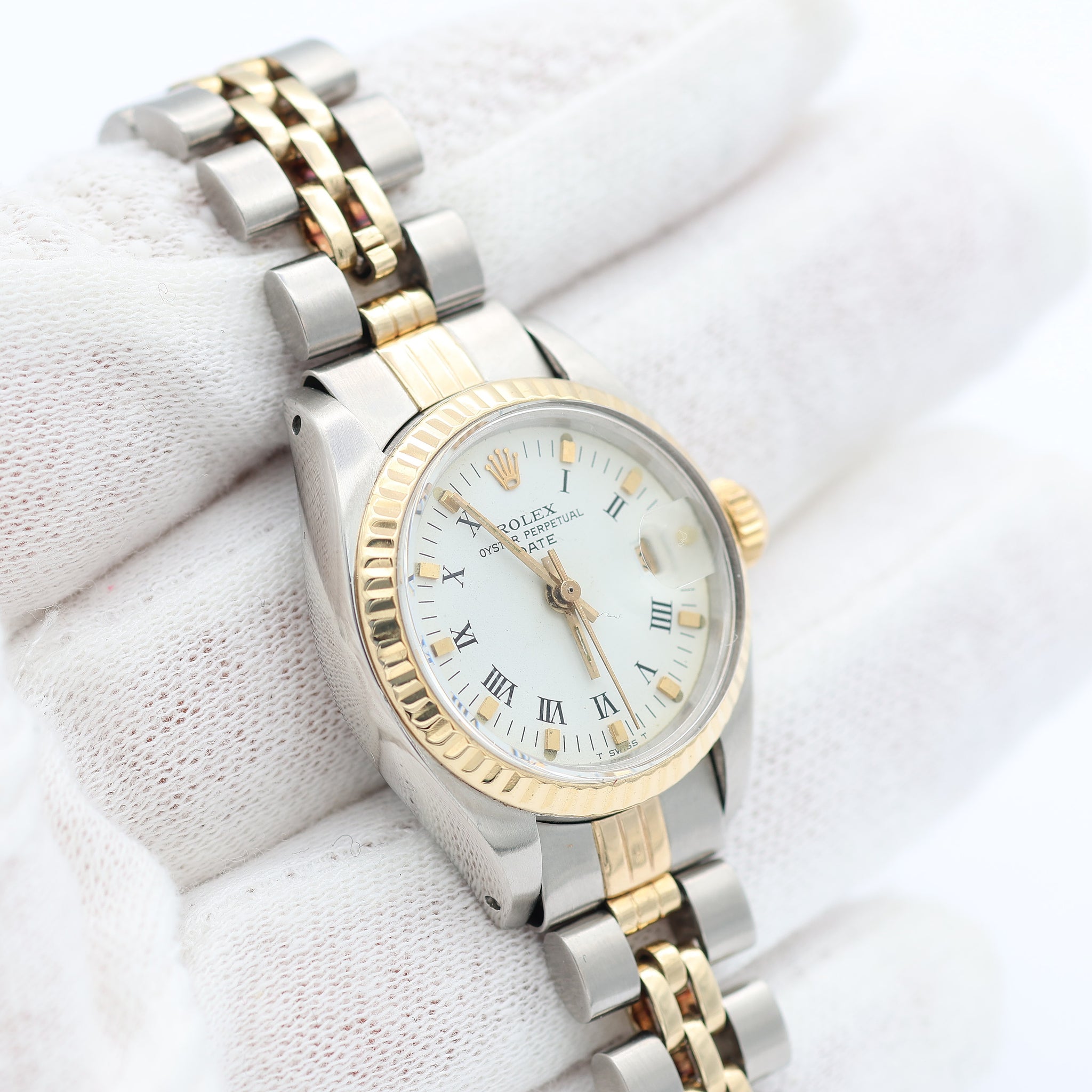 Made with yellow gold and stainles steel, this small Oyster case is designed to have a luxurious style.