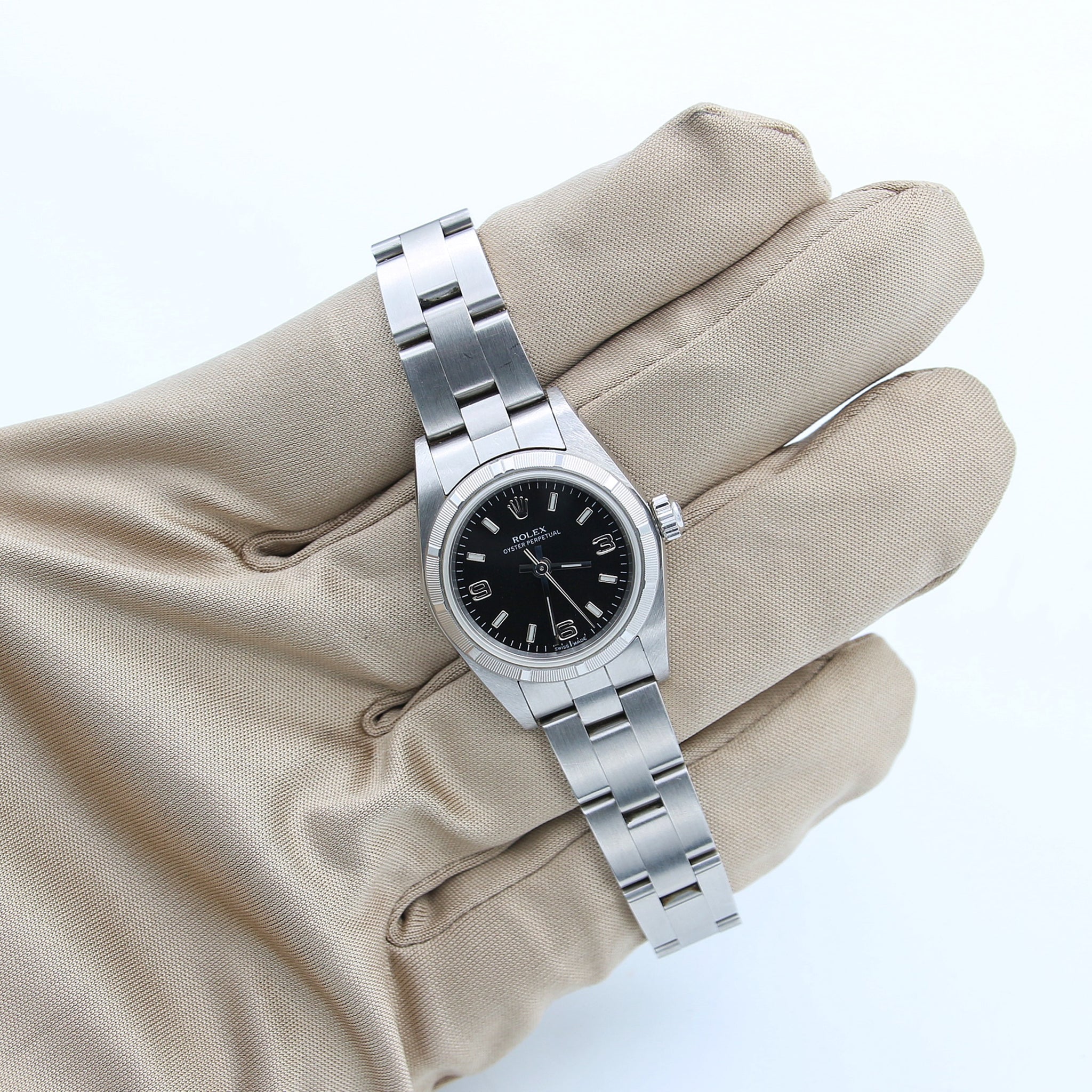 This pre-owned women's Rolex Oyster Perpetual 76030 wristwatch features a deep black dial with 3-6-9 in arabic numerals, stainless steel Oyster bracelet, sapphire crystal. 26mm in dimension.
