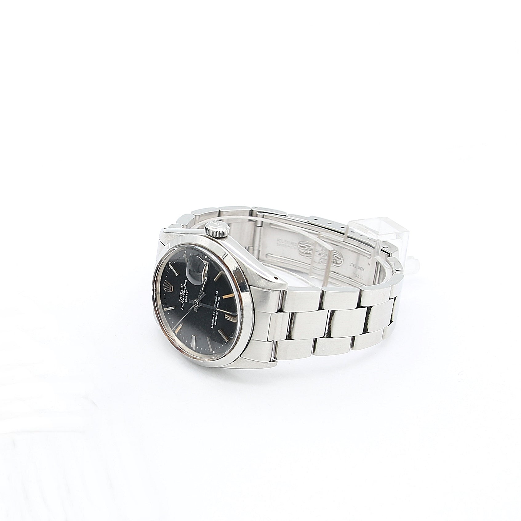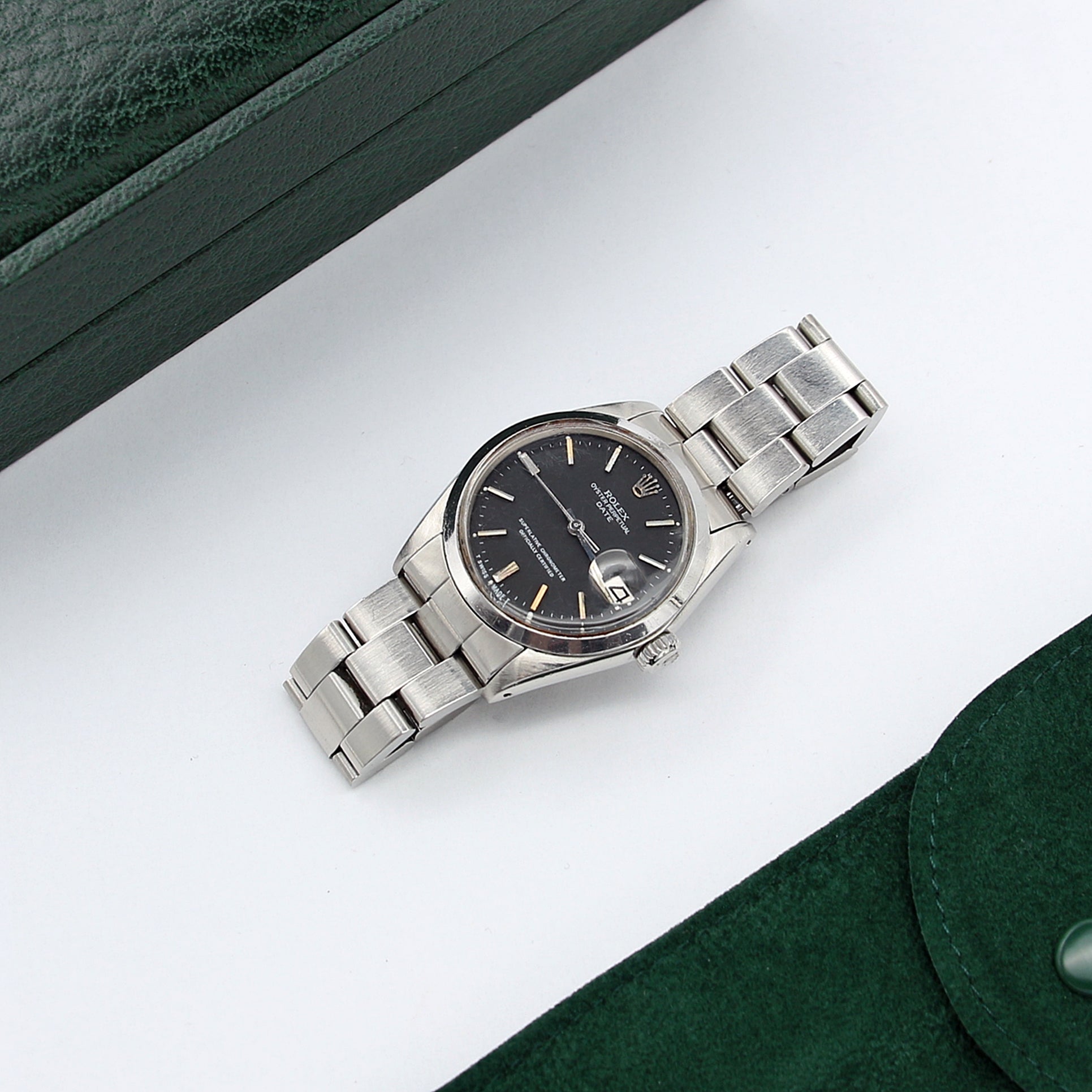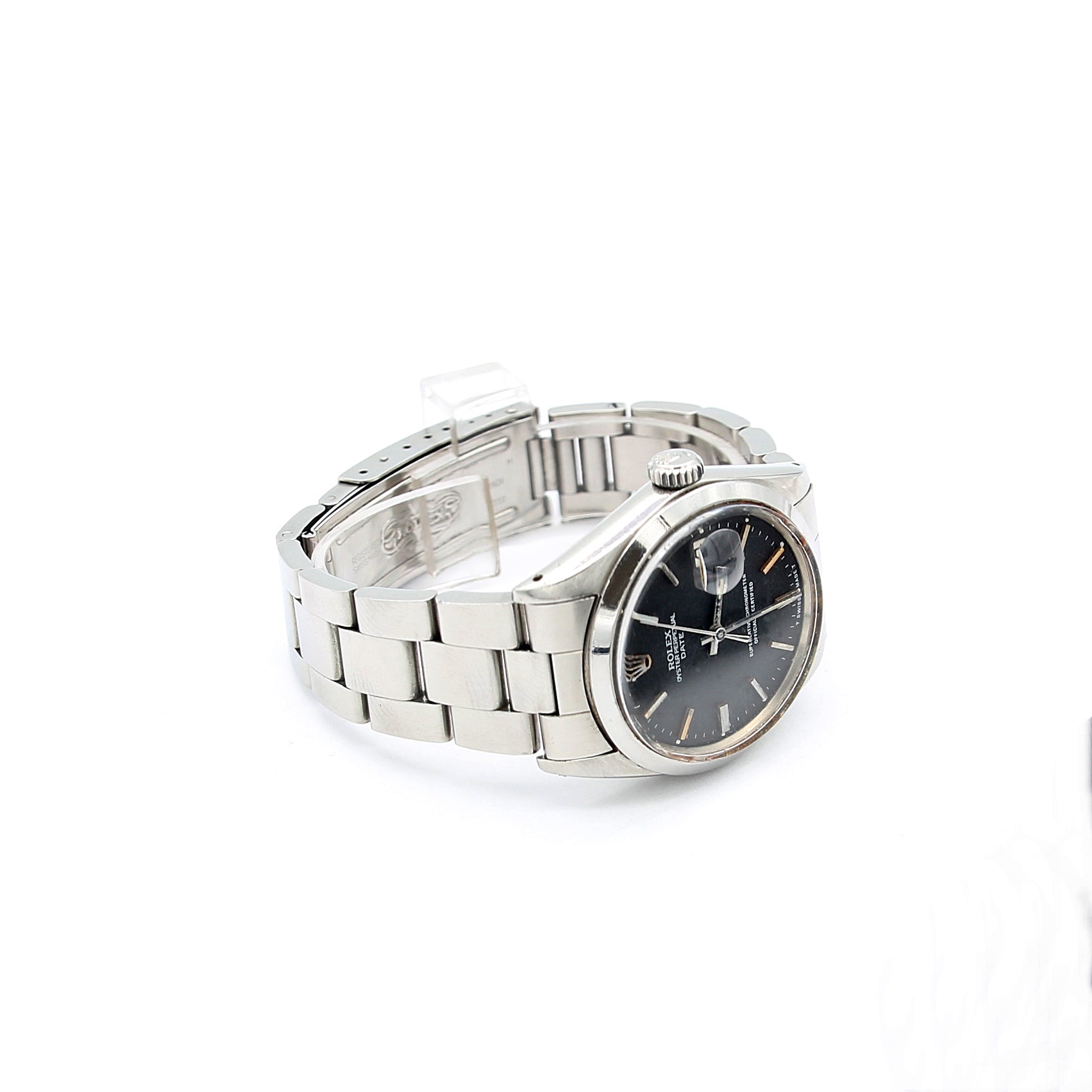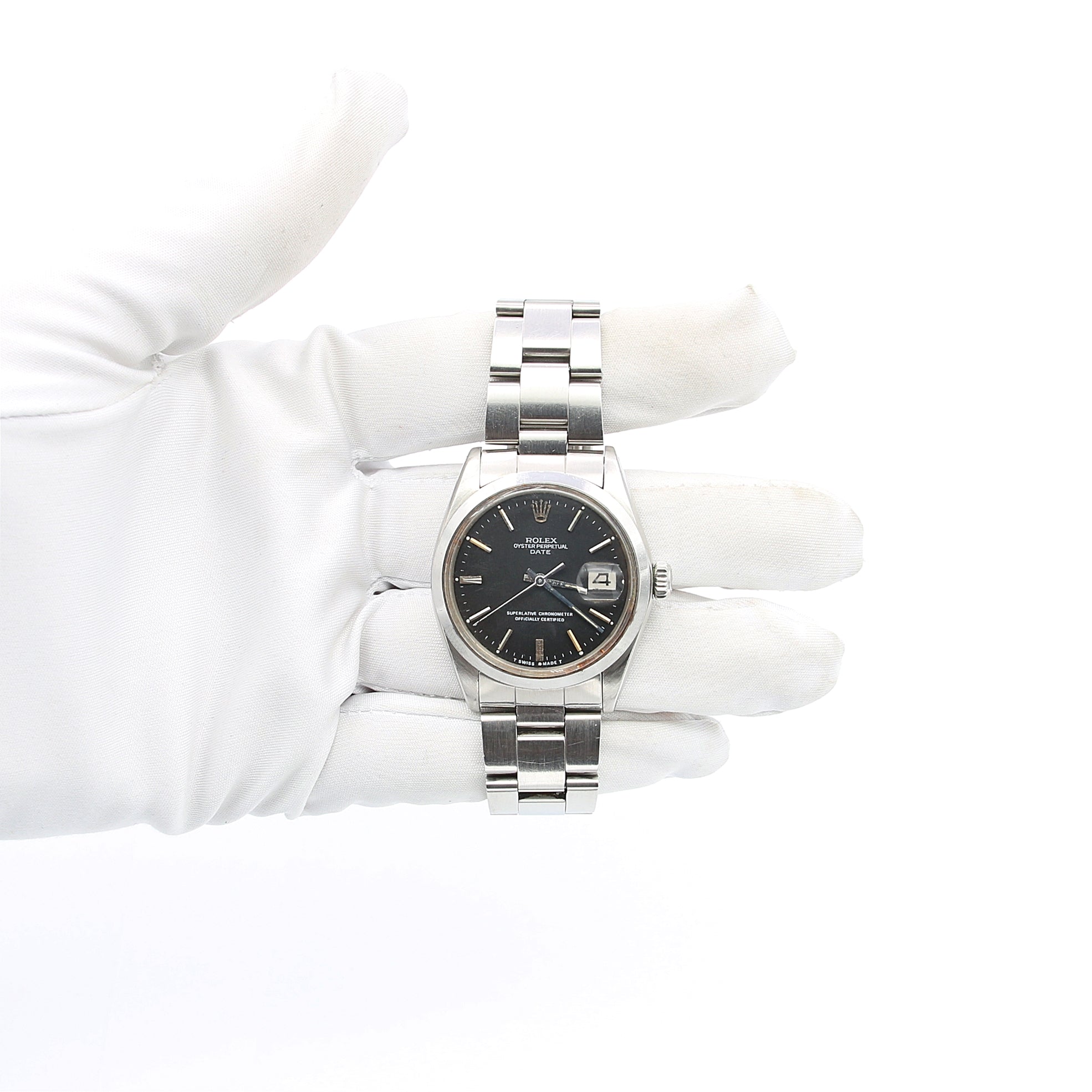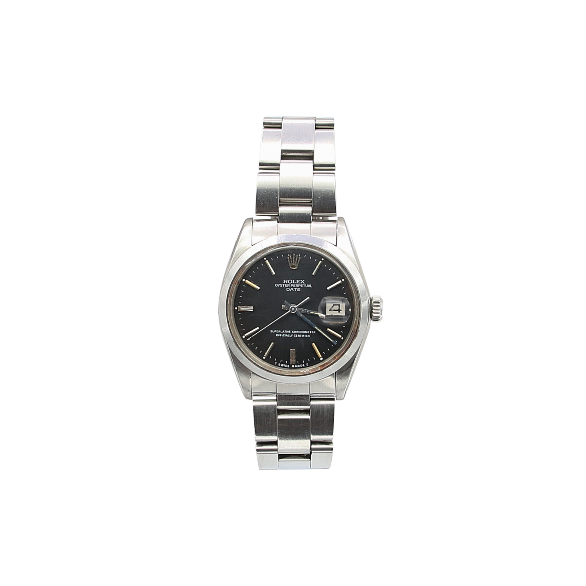For sale at Debonar Watches: pre-owned Rolex Date 1500 from the '80s, with a deep black dial.