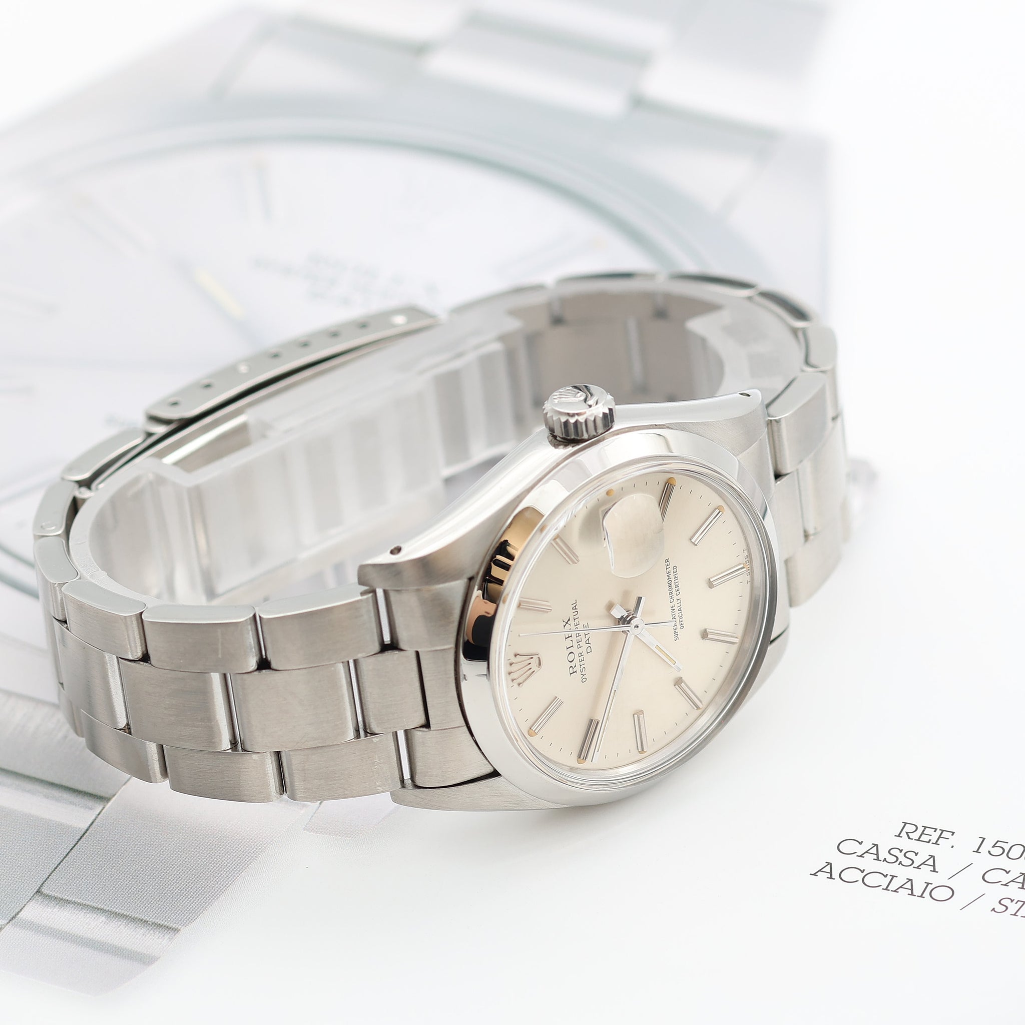 For sale at Debonar Watches: pre-owned Rolex Date 1500 with a classic silver dial on an oyster bracelet.