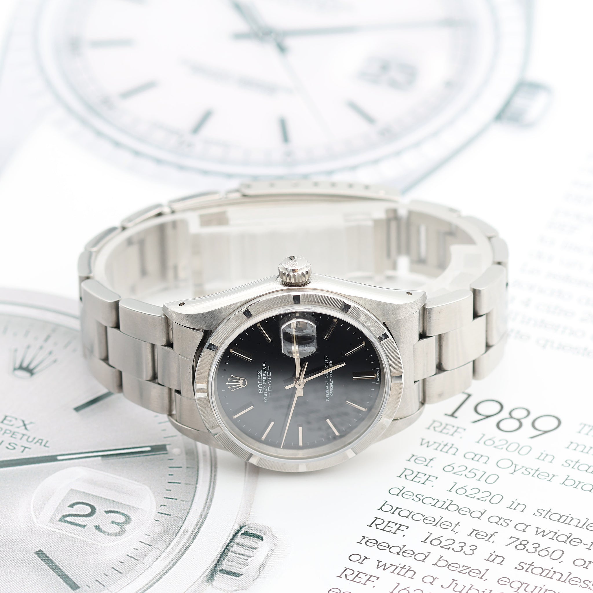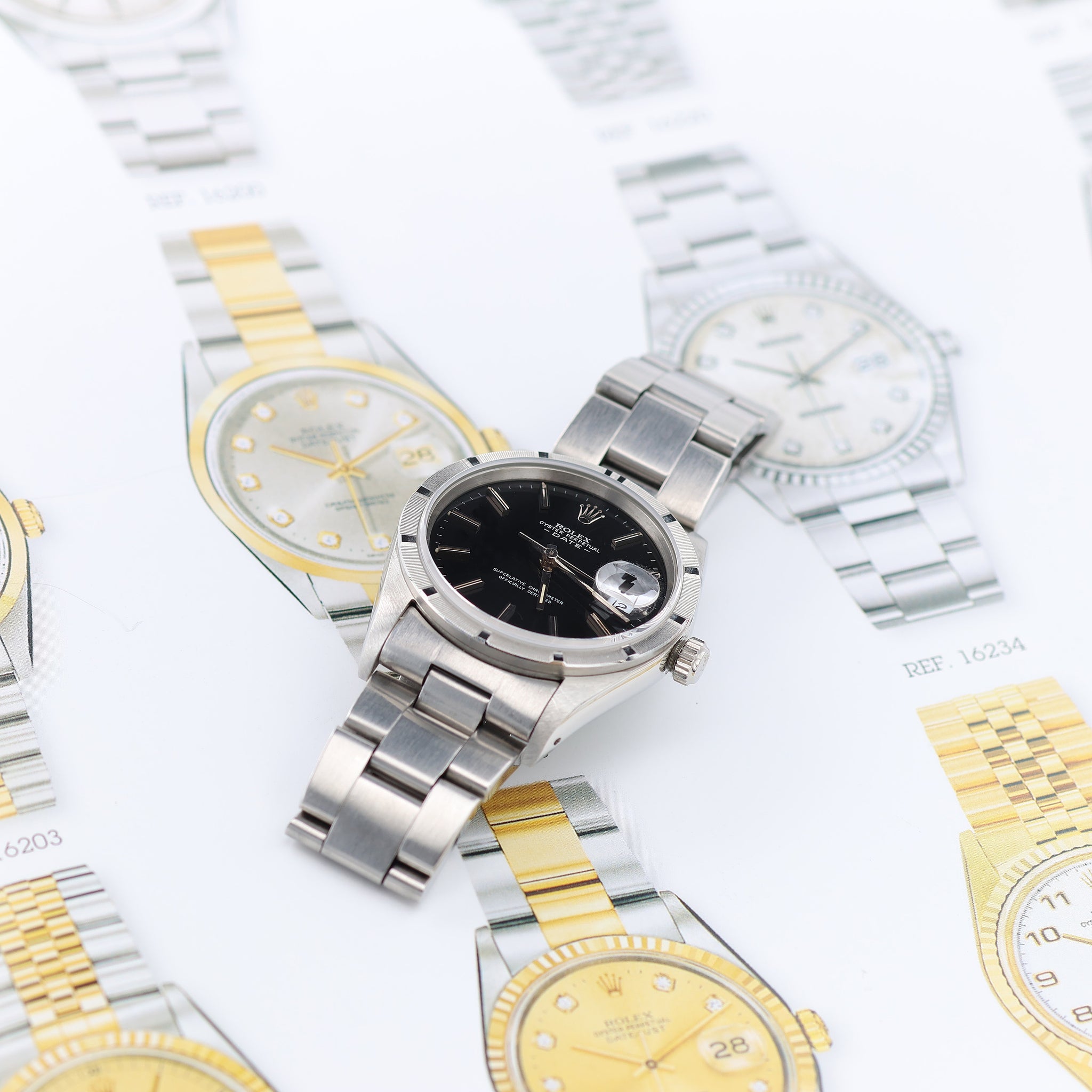 For sale: pre-owned Rolex Date ref. 15210 with black dial on an oyster bracelet, full set.