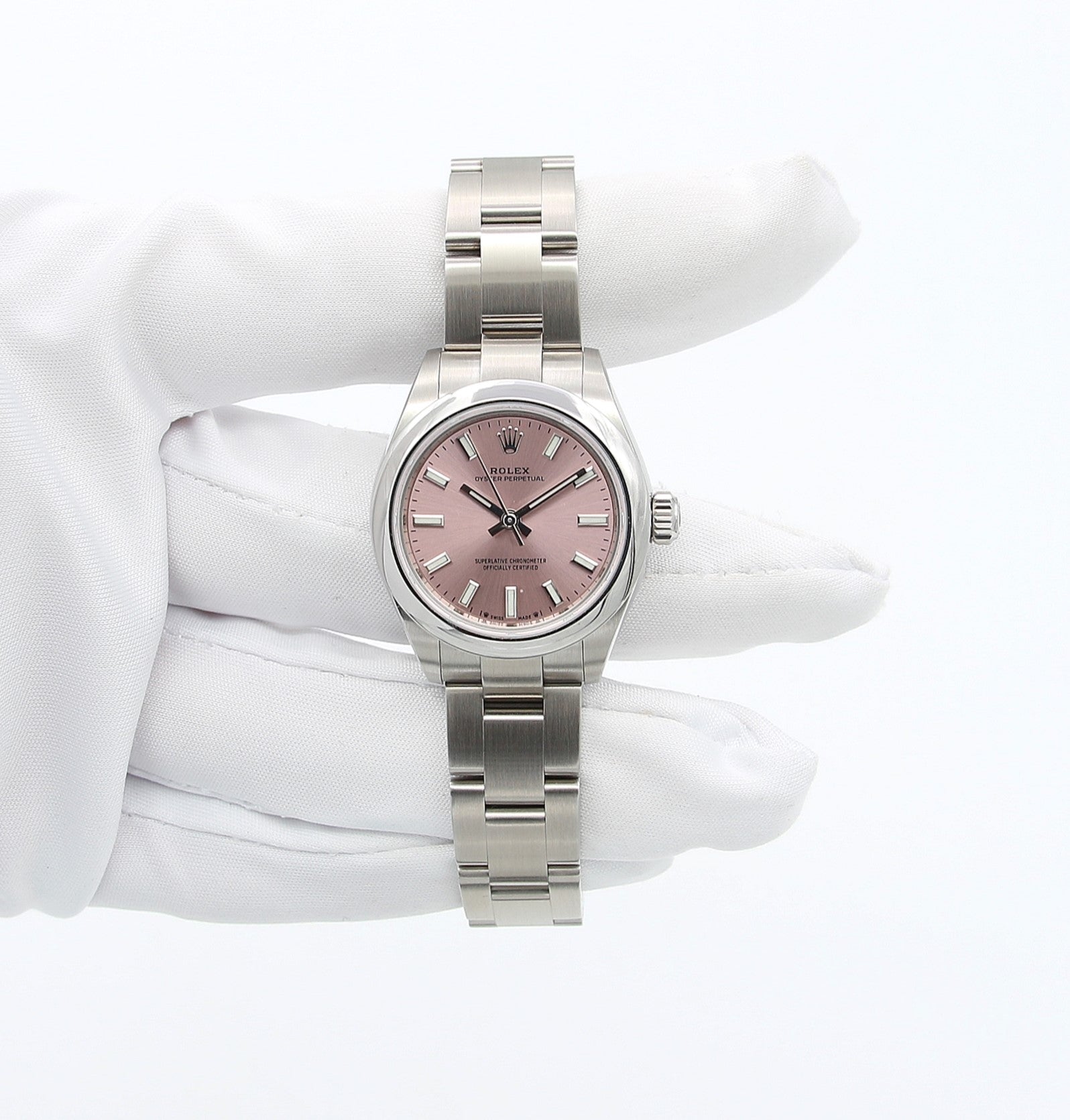 This feminine pink colour makes it look like a fun, brightly-coloured dial: a lively look that is very different from the usual conservative style of the Oyster.