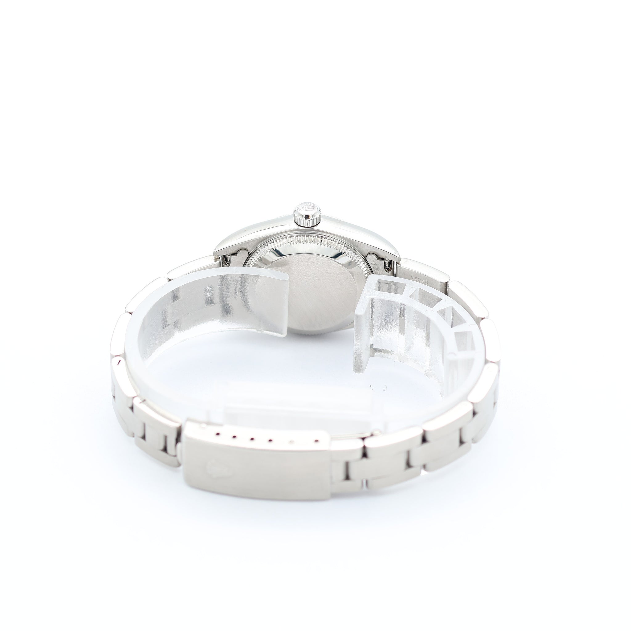 Its beauty is in its simple yet luxurious design that includes a brushed and polished stainless steel finish, a smooth bezel, and a feminine 26mm Oyster case worn on an Oyster bracelet.