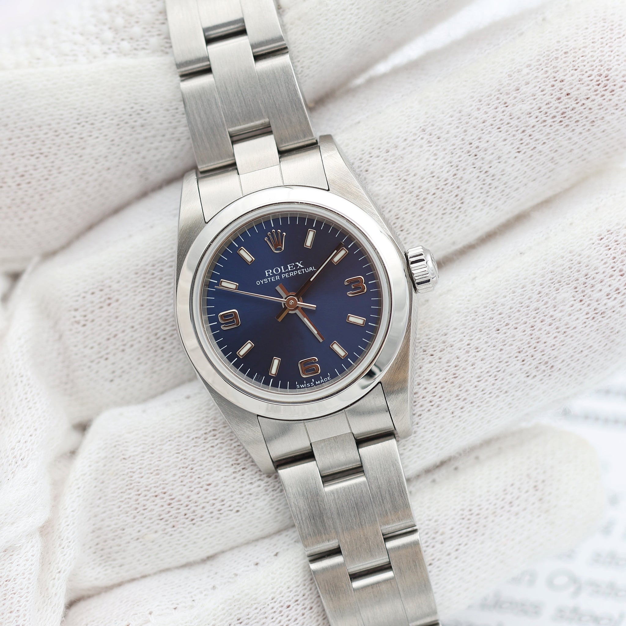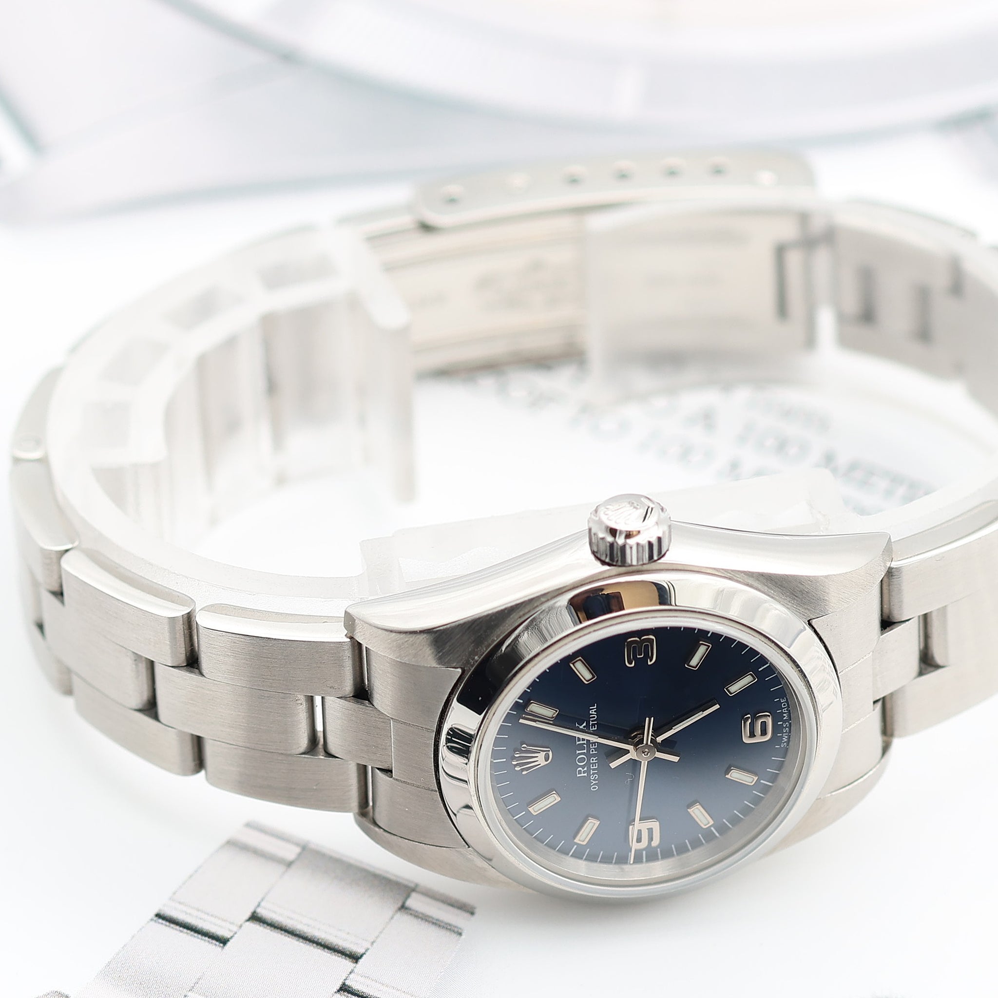 For sale at Debonar Watches: pre-owned Rolex Oyster Perpetual lady ref. 67180 with an elegant blue dial with 3-6-9 numerals, full set.