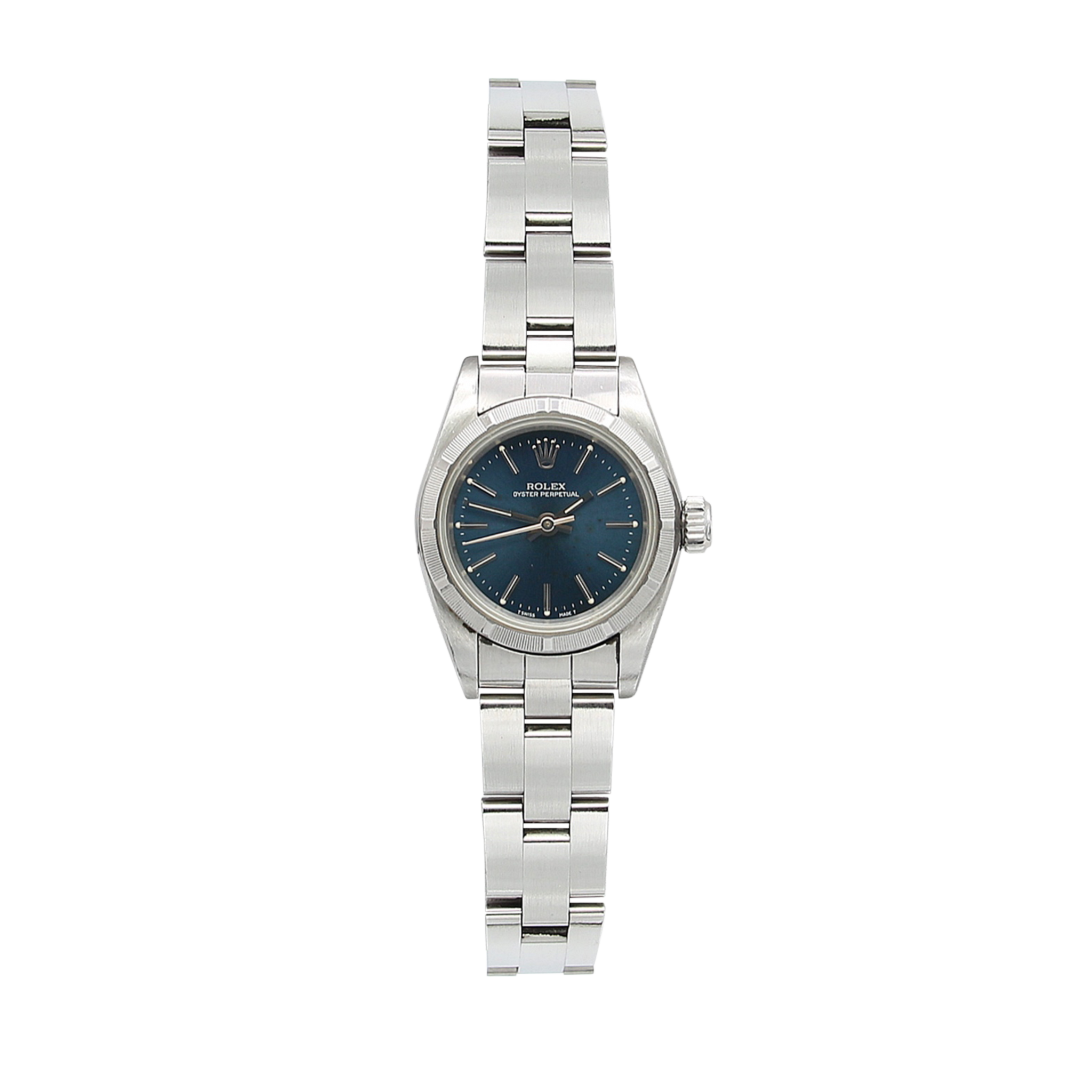 For sale at Debonar Watches: pre-Owned Rolex Oyster Perpetual ref. 67230, automatic watch, features a 26mm stainless steel case surrounding a blue dial.