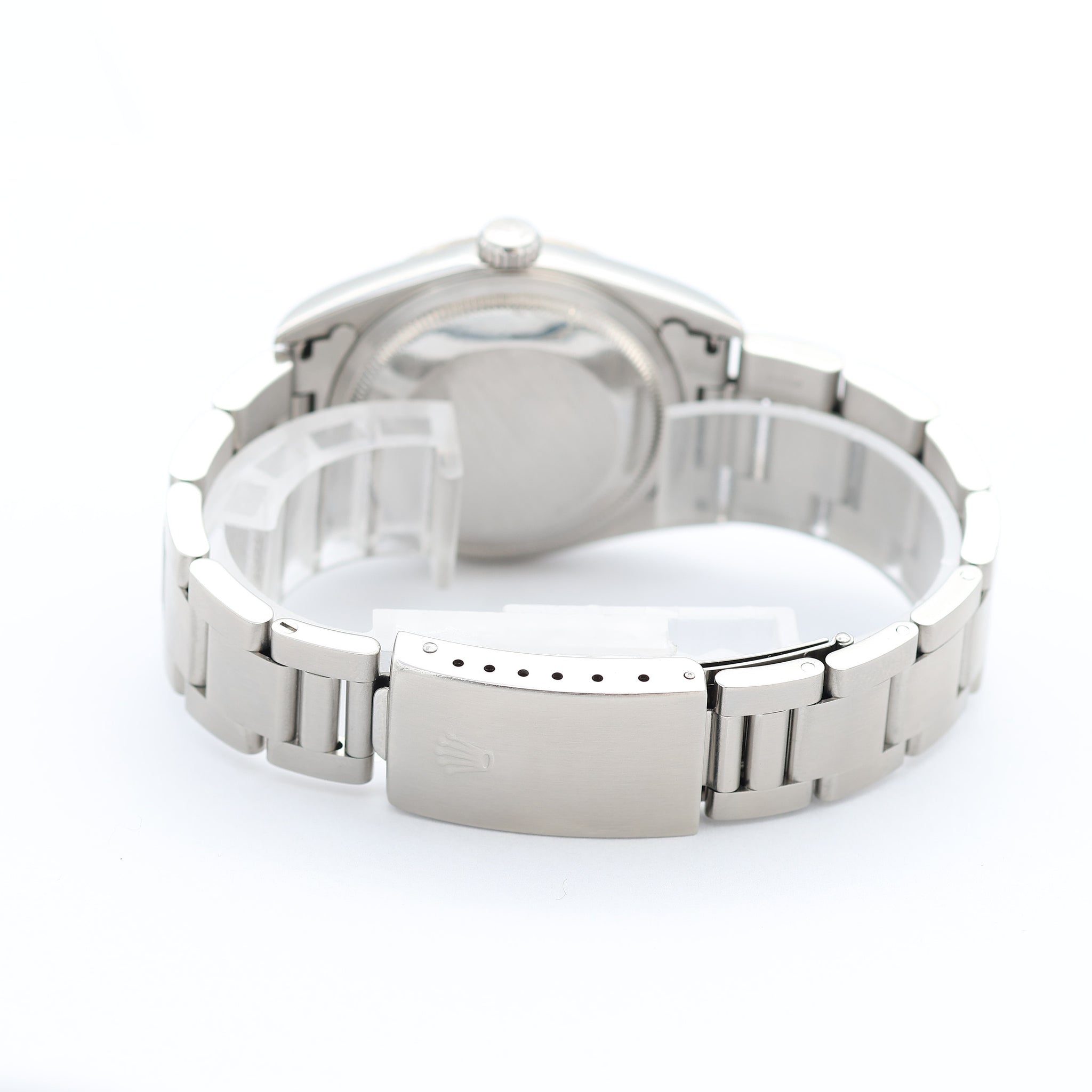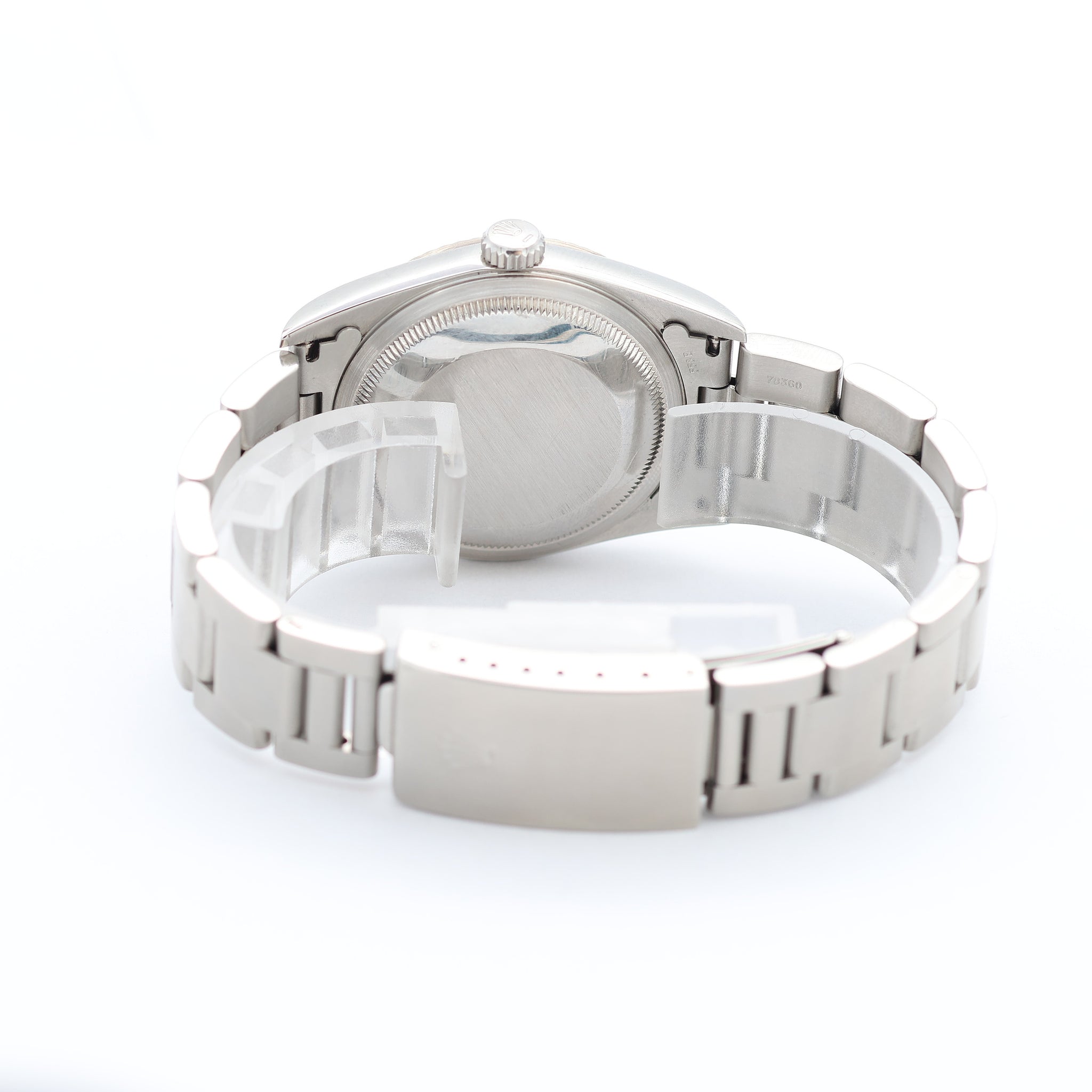 This 36 mm. diameter stainless steel case is set with screw-down case back and crown, a fluted white gold bezel, a sapphire crystal with cyclops lens.