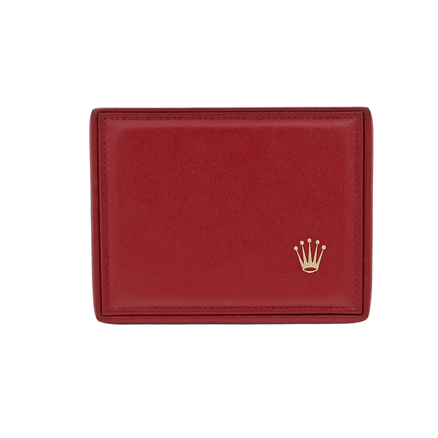 Rolex box featuring red lid design with gold Rolex "coronet" logo.