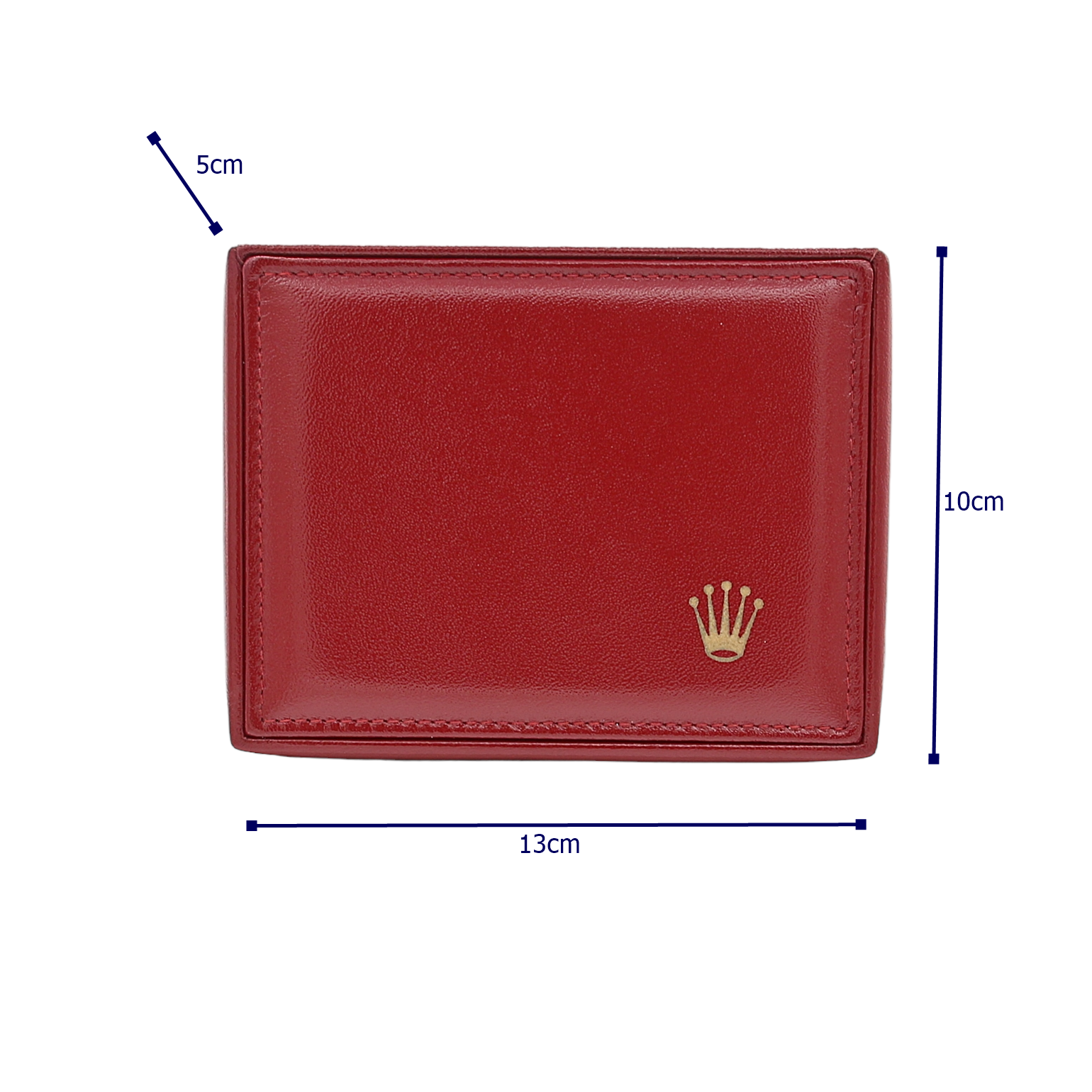 Rolex box featuring red lid design with red stitches and a gold Rolex "coronet" logo.