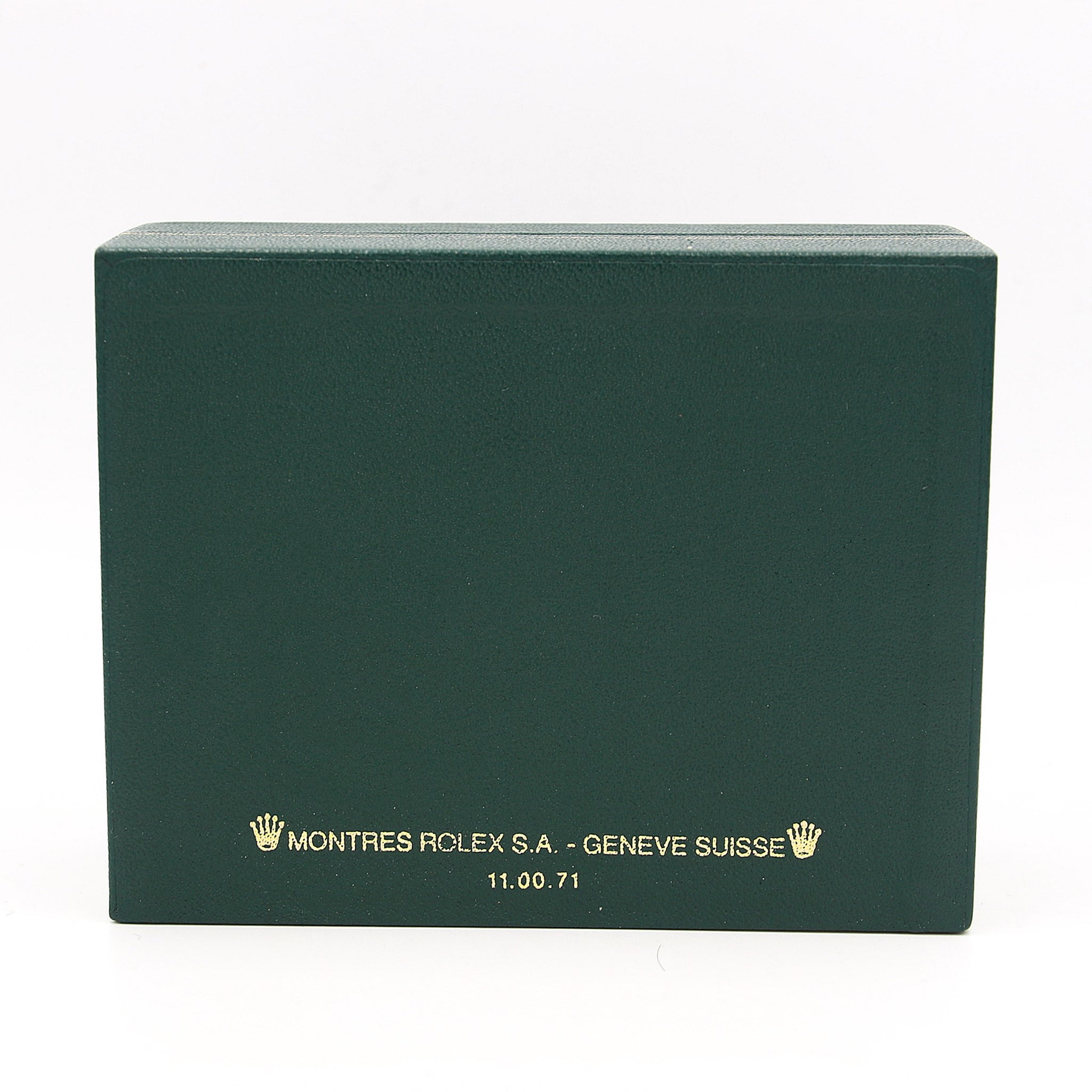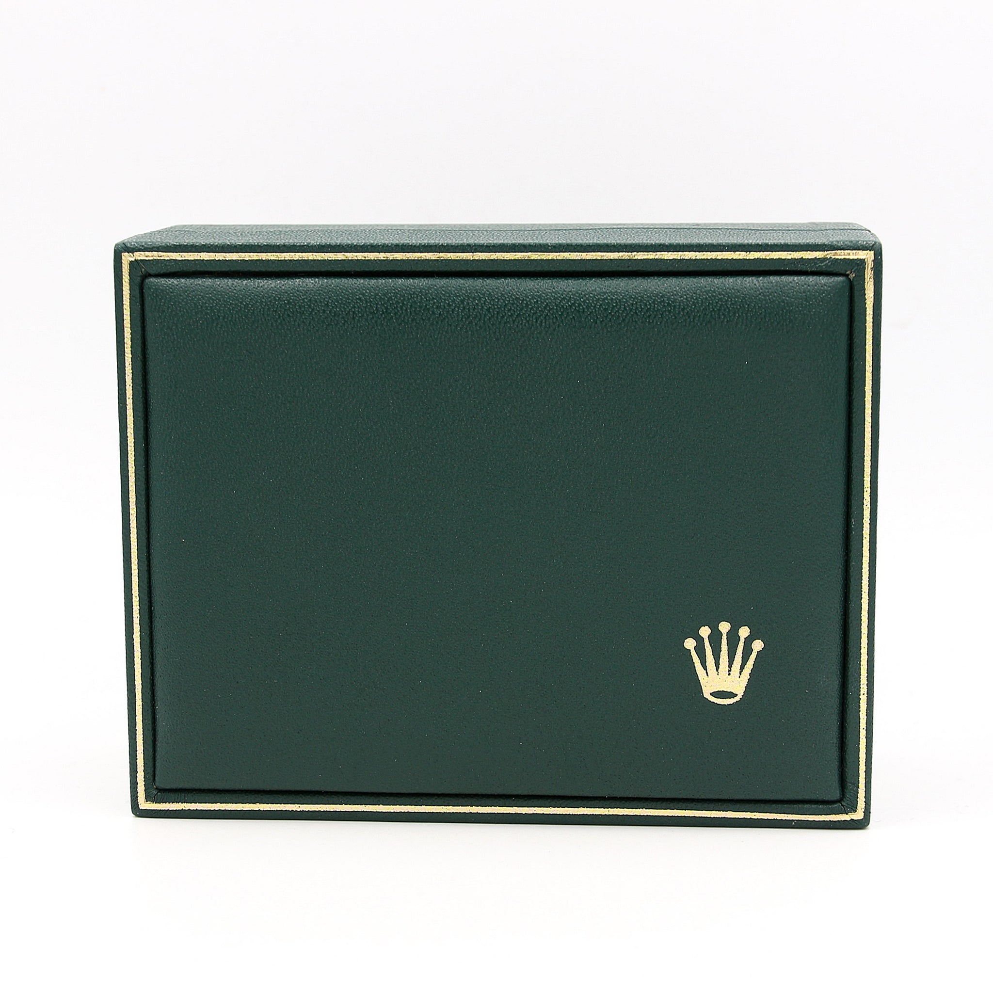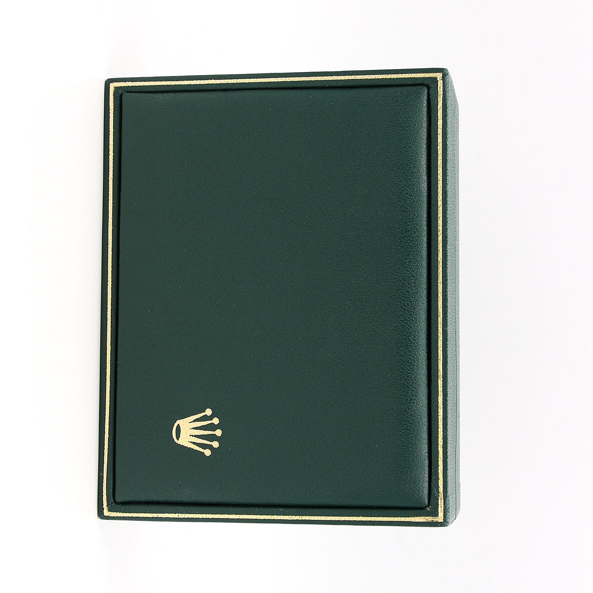 Rolex box featuring dark green lid design with details in gold (included the Rolex "coronet" logo).